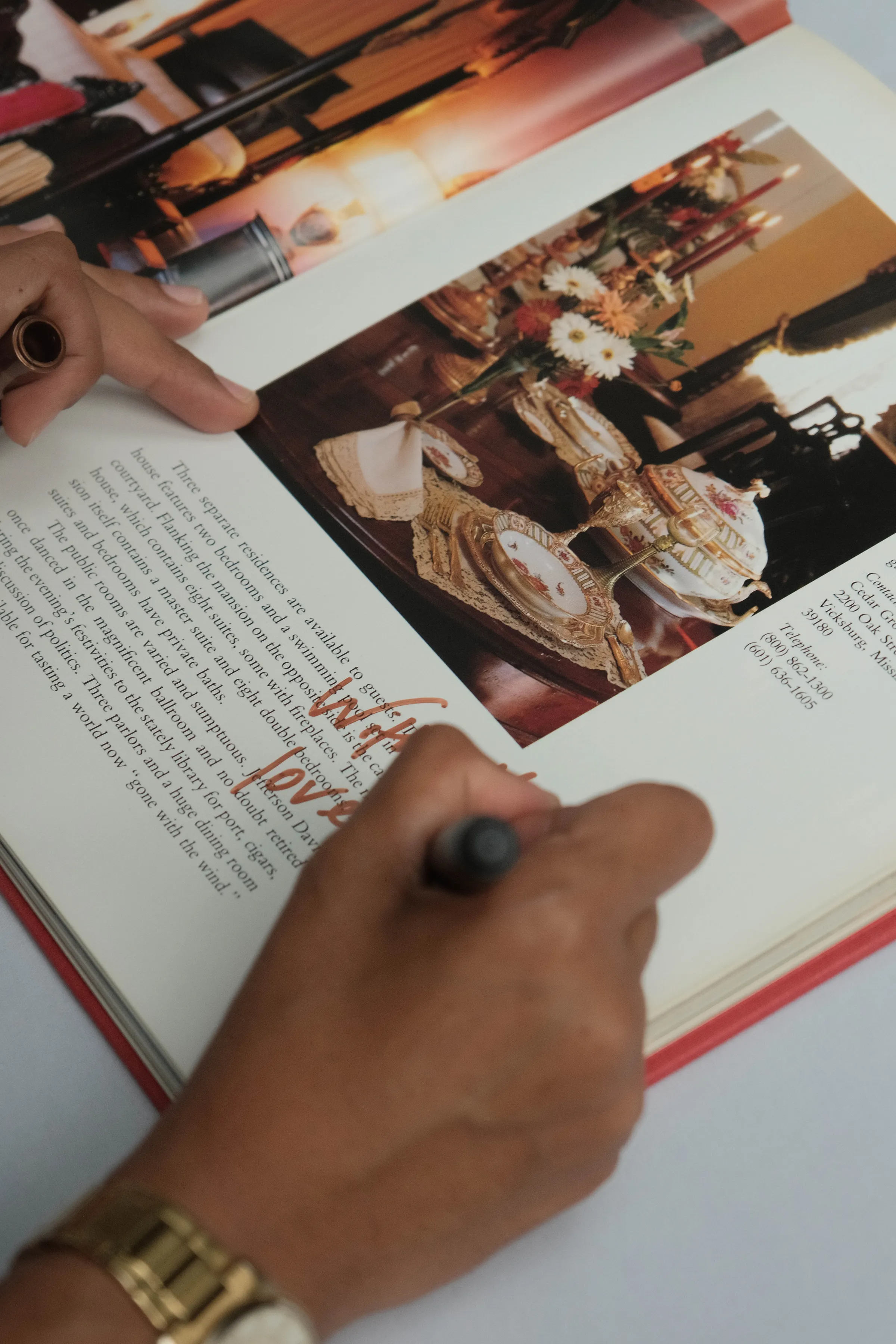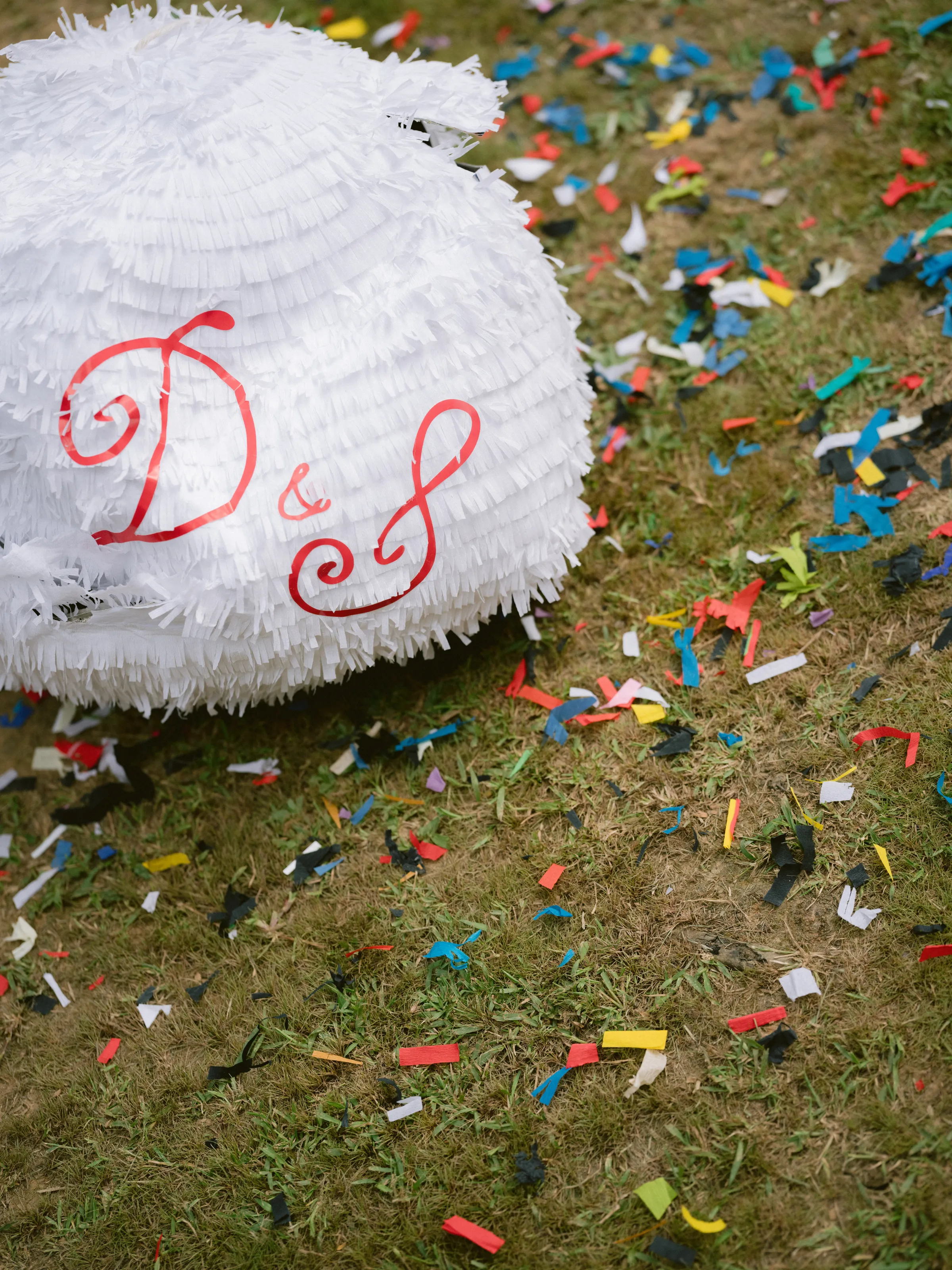 In lieu of a traditional guestbook, attendees signed an old architecture magazine, now repurposed into a coffee table keepsake for the couple — a clever, design-forward memento filled with heartfelt wishes. One of the most playful and talked-about moments was the golf piñata— a whimsical nod to the groom’s love for the game. Packed with candy, it burst into a cloud of confetti, sending children into a frenzy of laughter and delight.