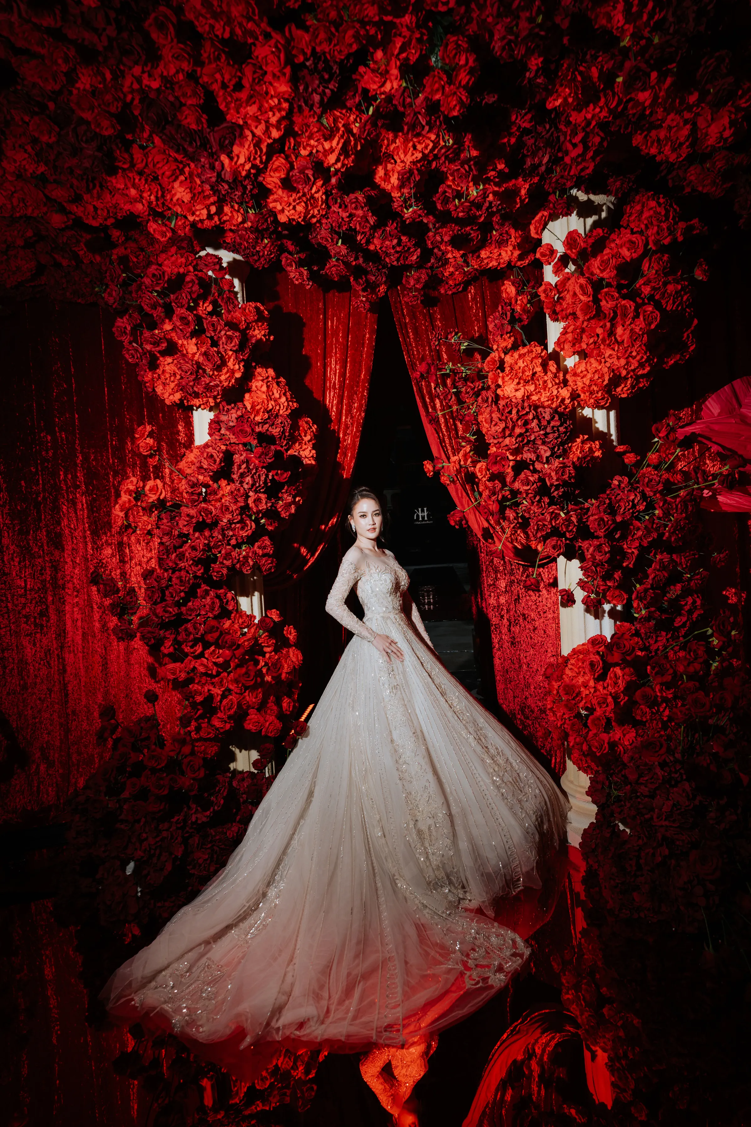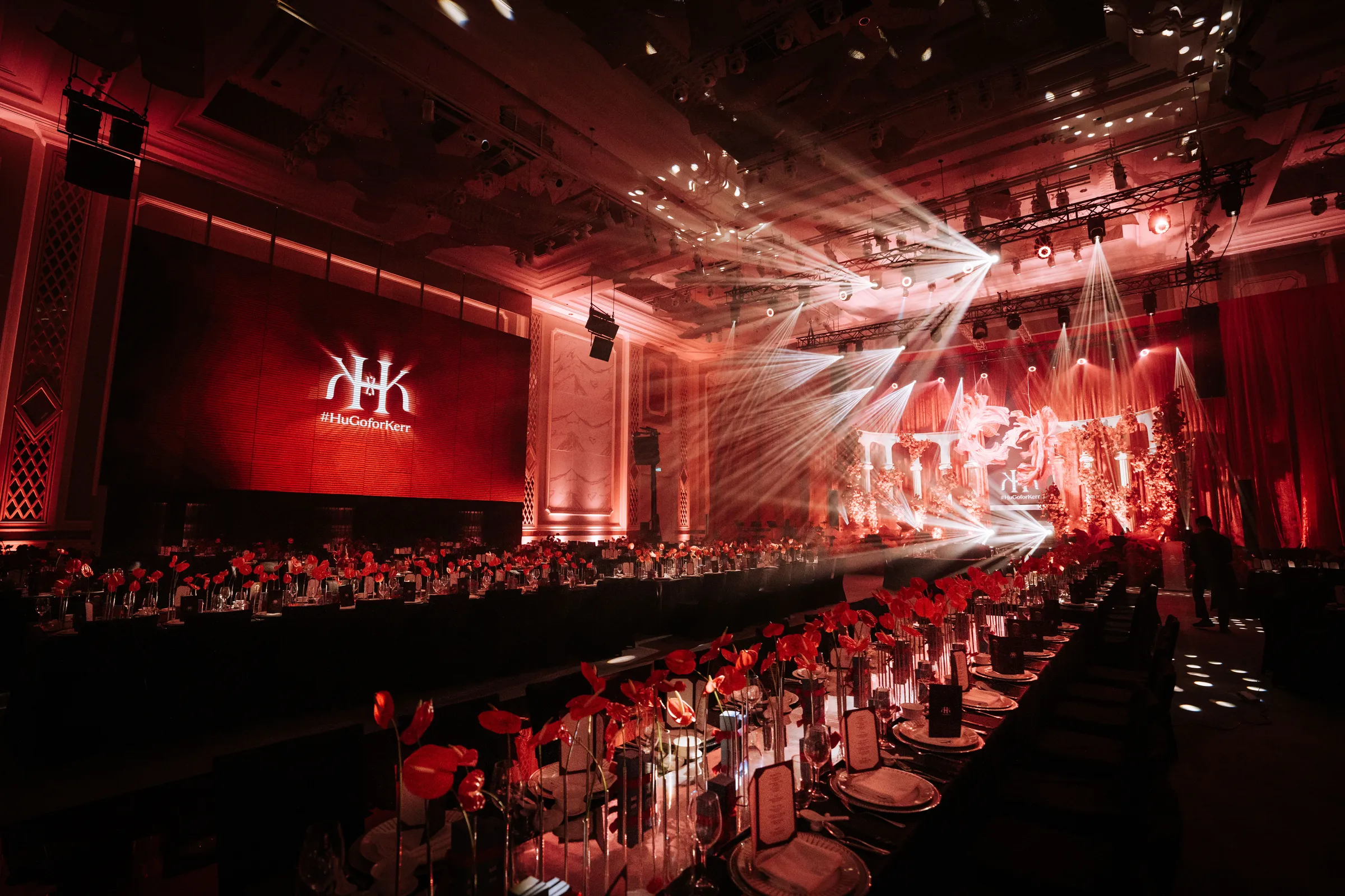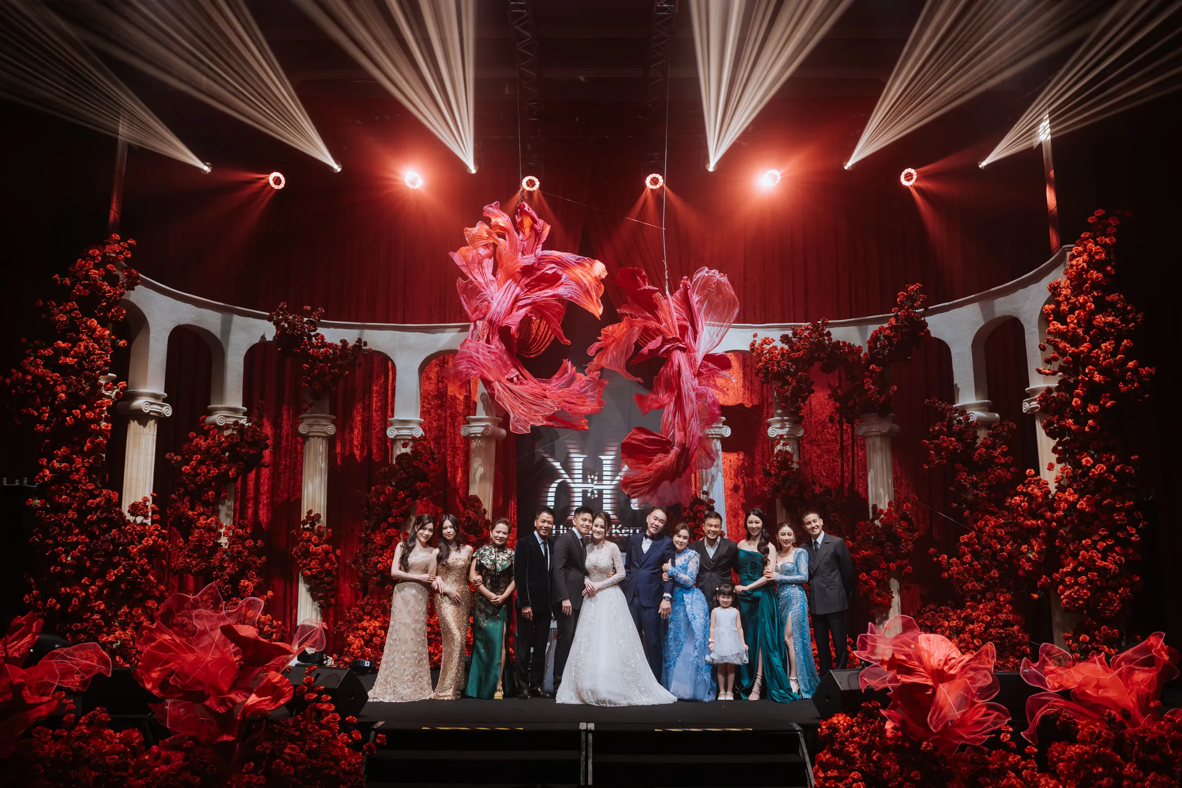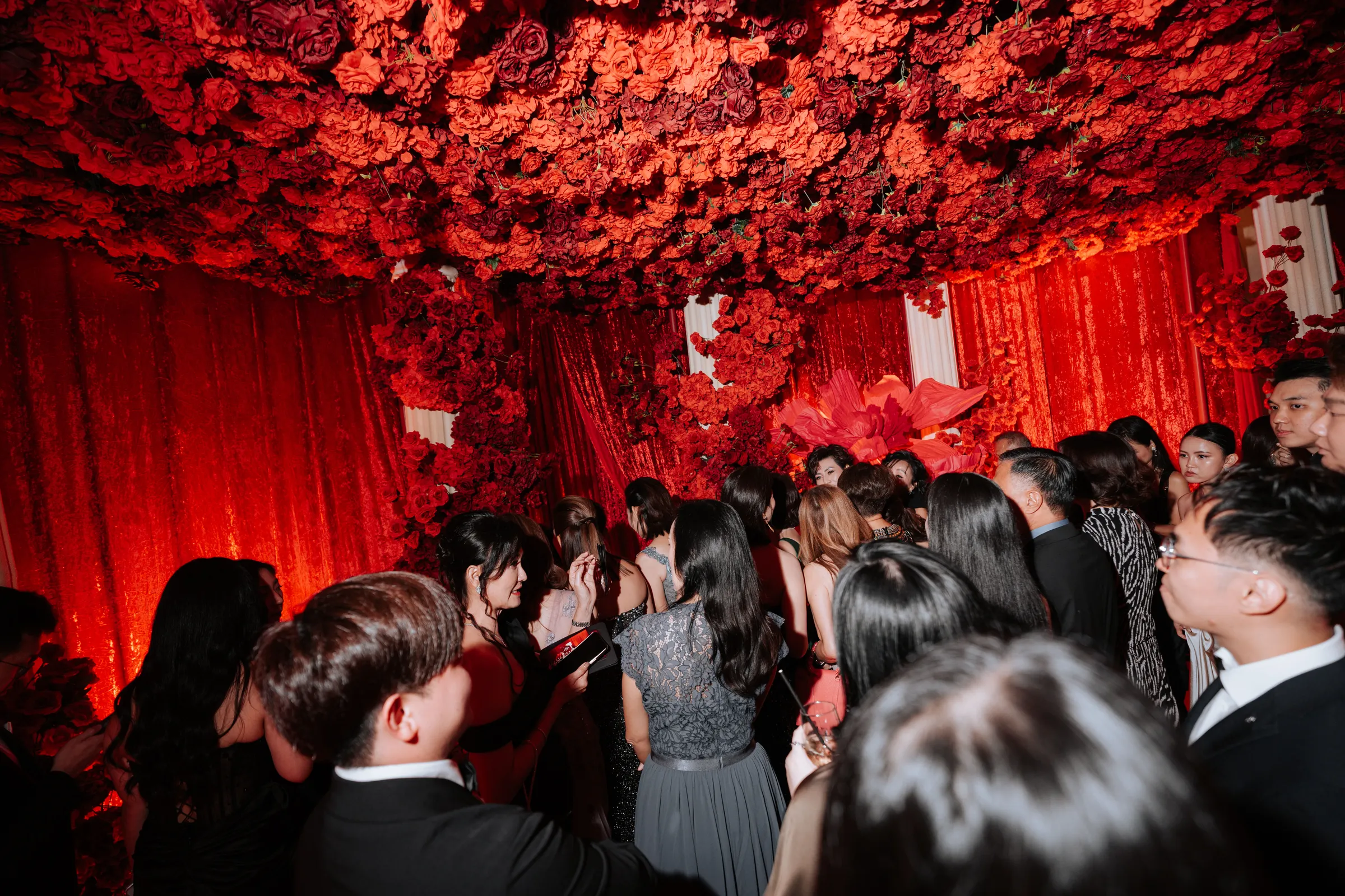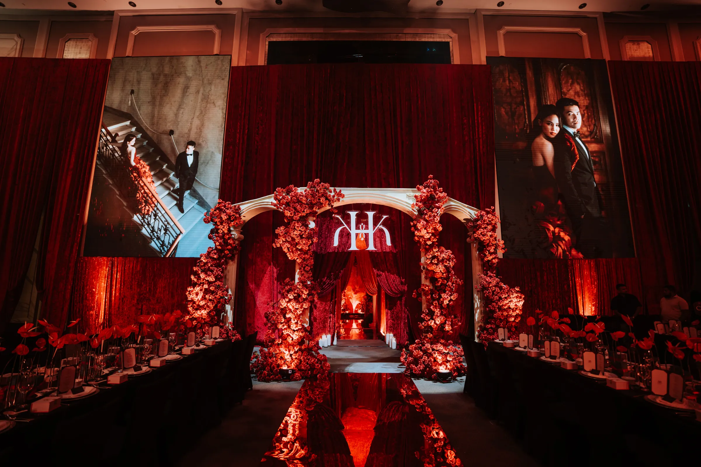 Guests were first welcomed through a thoughtfully designed pre-function space, featuring a floral ceiling paired with mirrored elements, setting the tone before entering the main ballroom. Inside, cascading roses, grand stage structures, and dynamic lighting transformed the venue into a theatrical, almost cinematic experience.