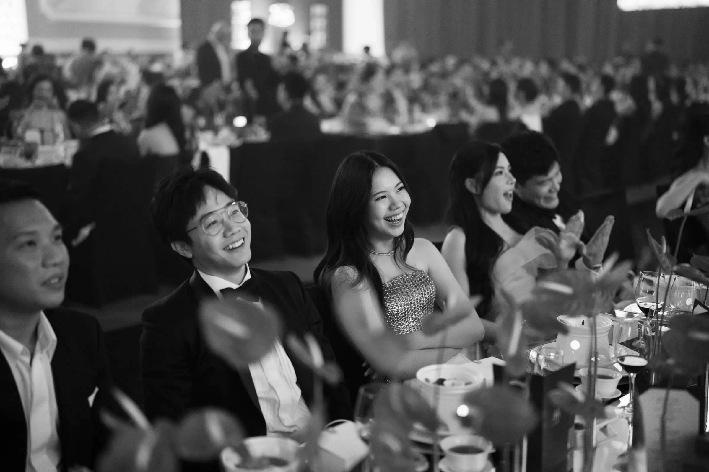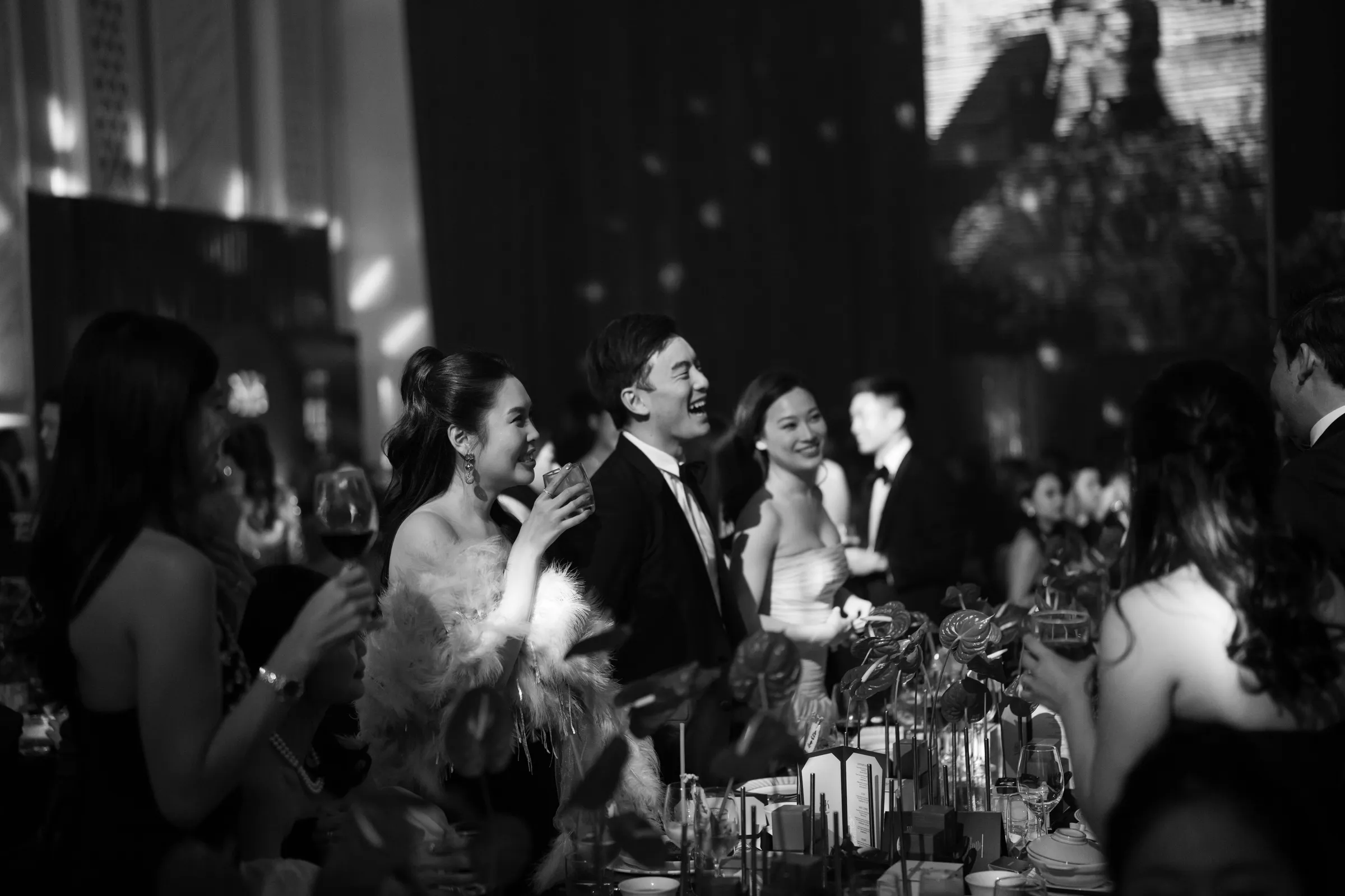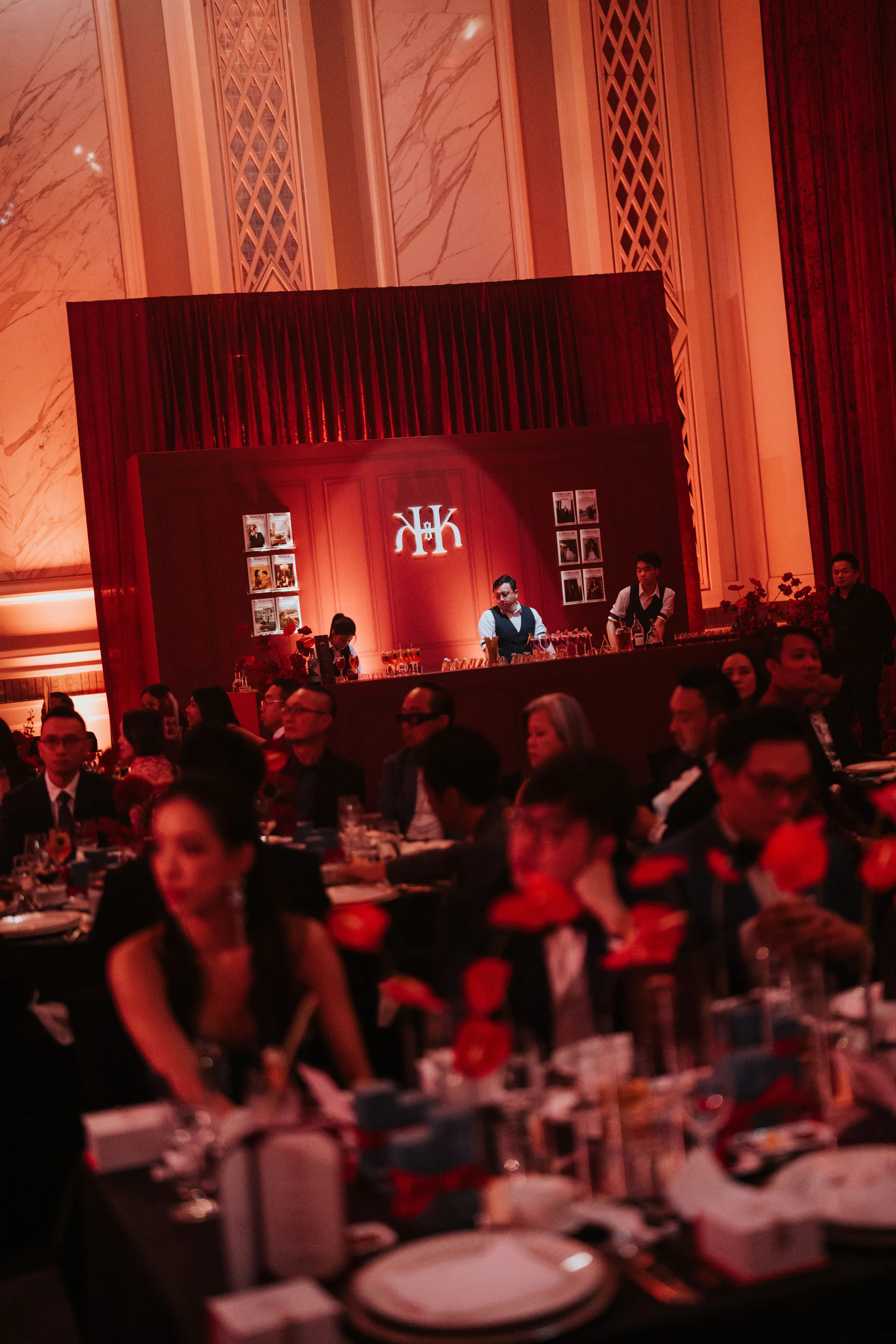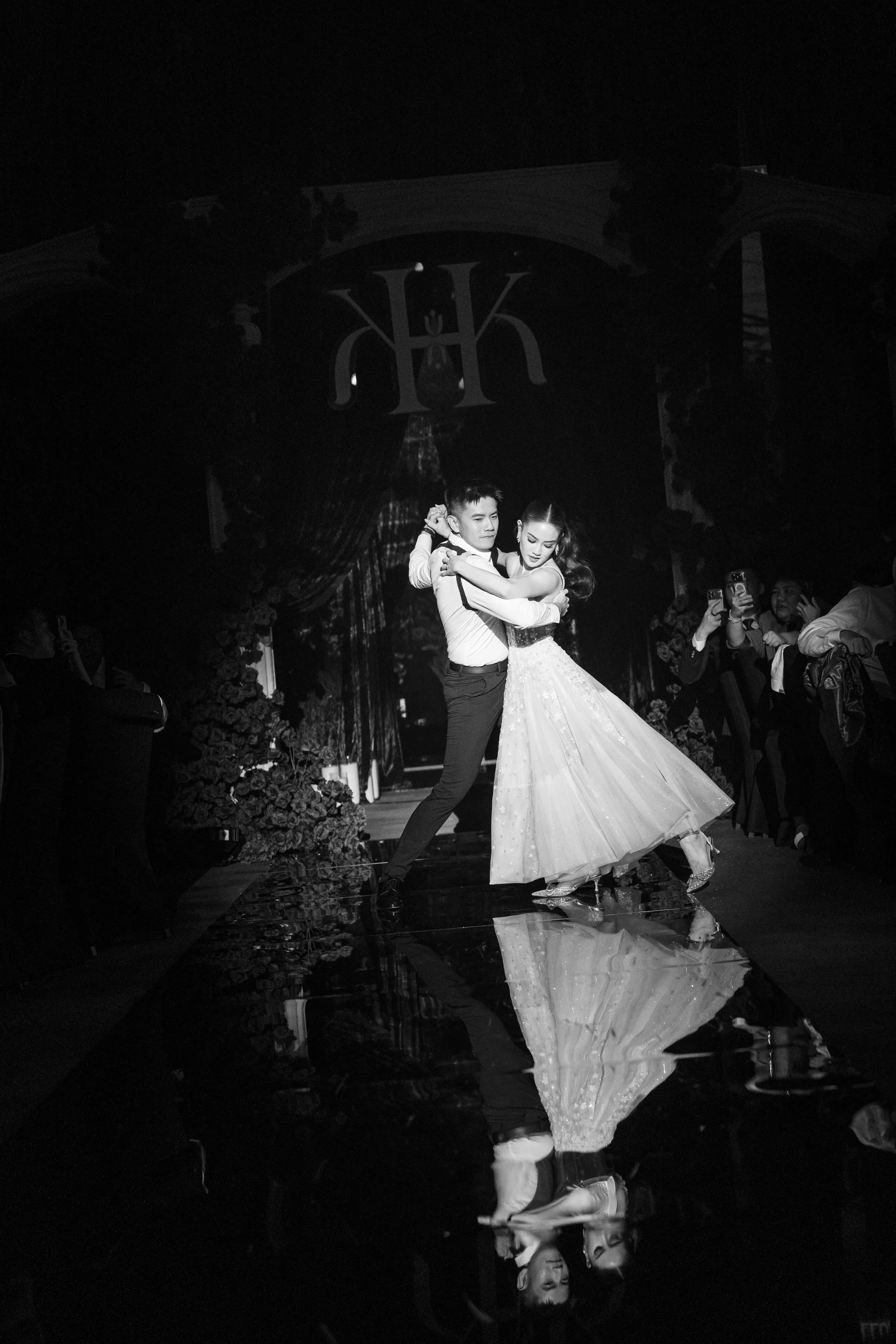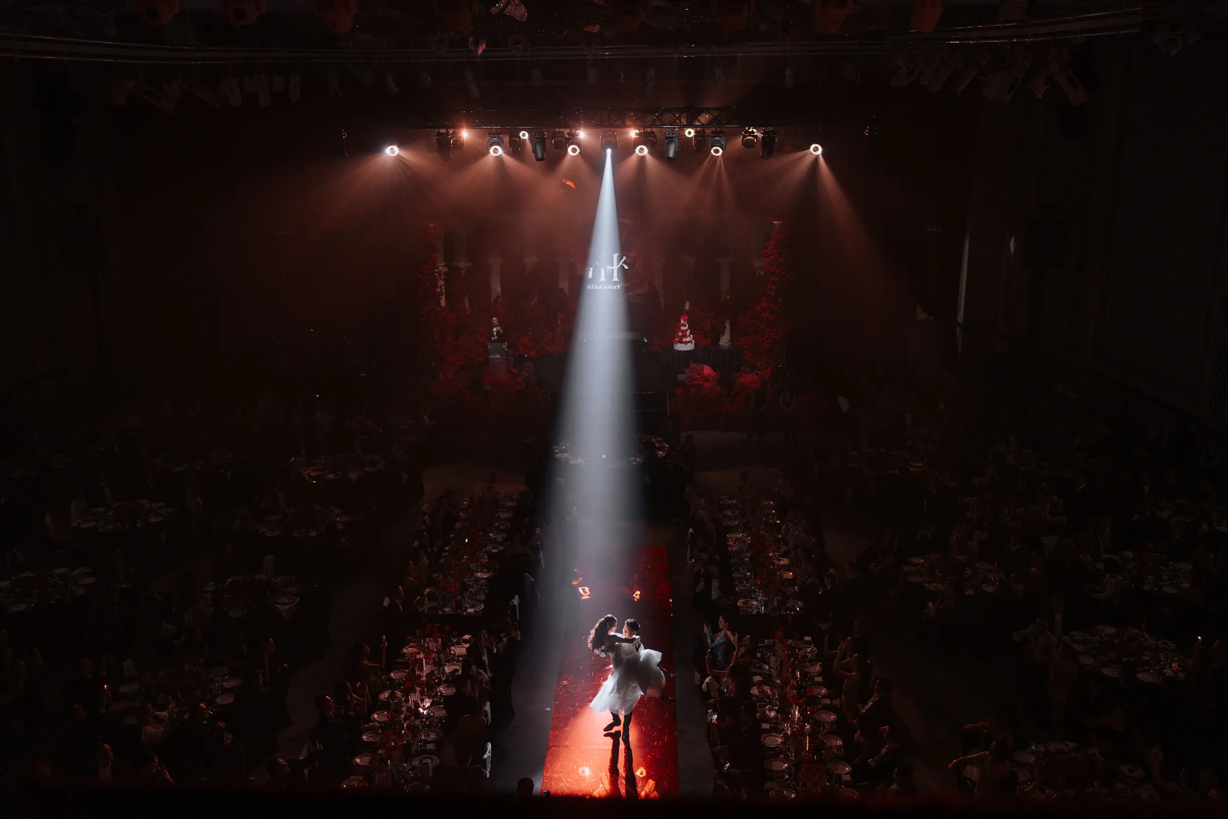 Guests were first welcomed through a thoughtfully designed pre-function space, featuring a floral ceiling paired with mirrored elements, setting the tone before entering the main ballroom. Inside, cascading roses, grand stage structures, and dynamic lighting transformed the venue into a theatrical, almost cinematic experience.