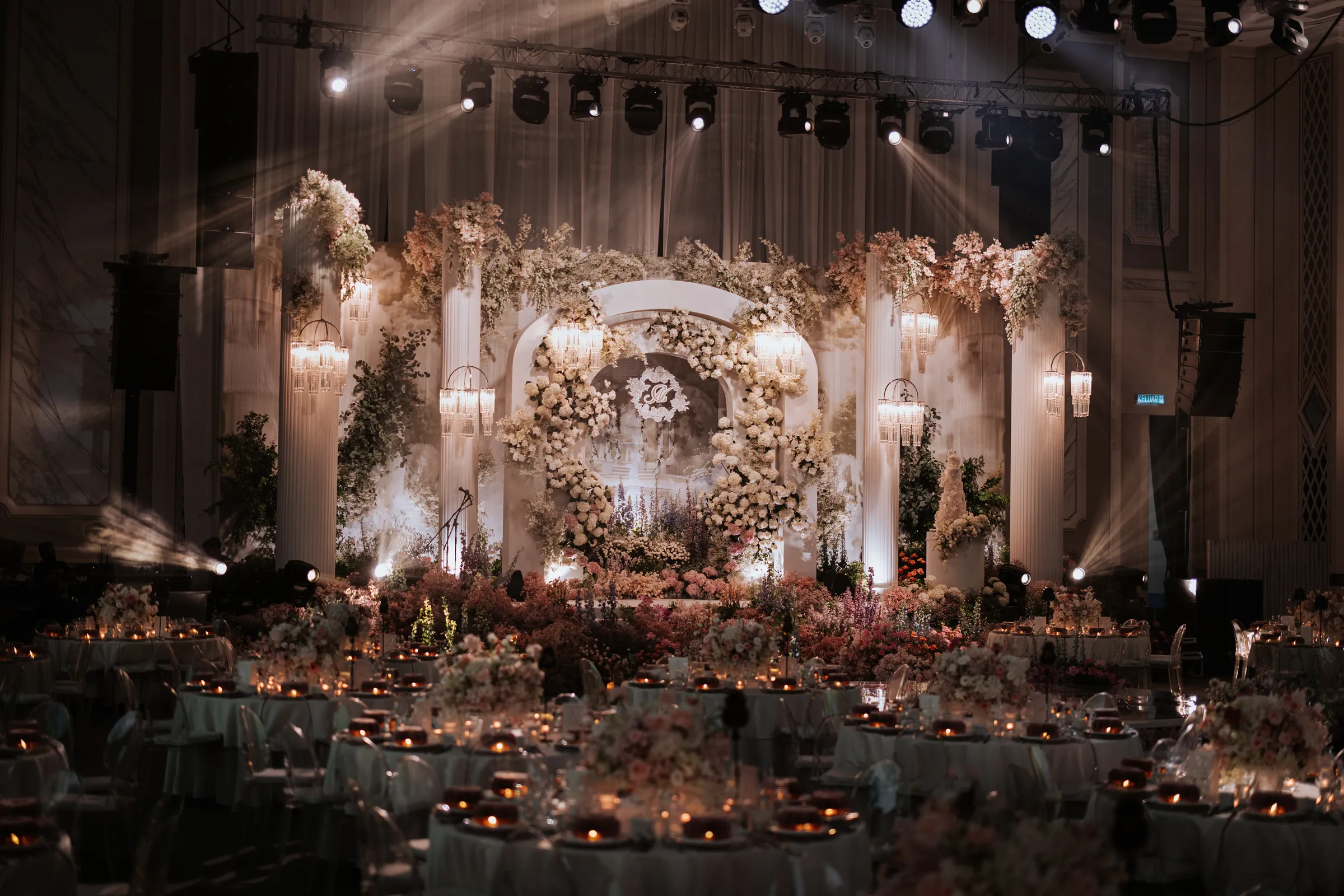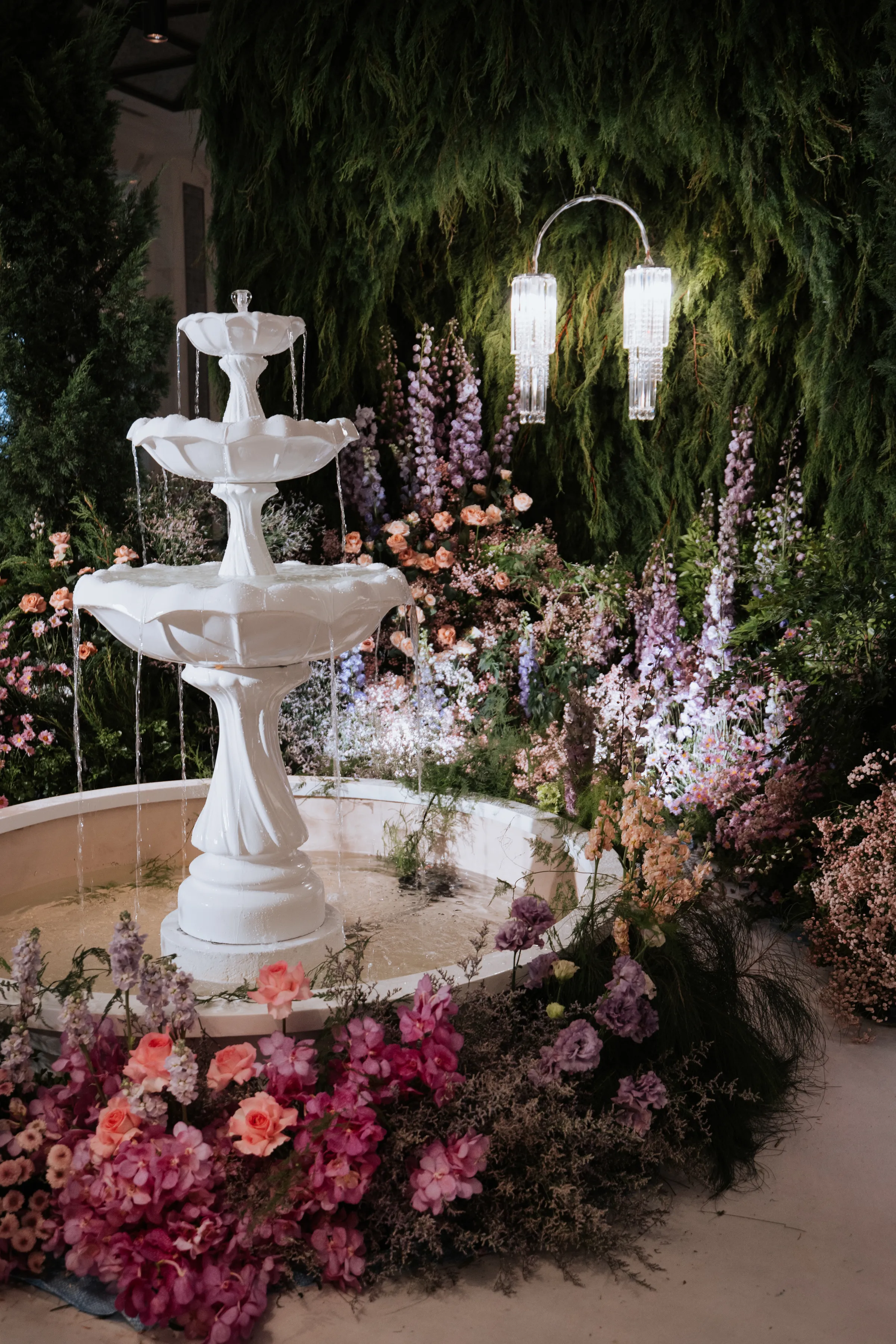 The reception transformed the ballroom into a romantic garden dreamscape. Cascading greenery, pastel blooms in shades of blush, lilac and soft peach, and glowing candlelight framed the space, while an elegant white fountain surrounded by lush florals created the feeling of stepping into an enchanted garden. Beneath towering floral arches and classical columns, the stage set the tone for a sophisticated evening of celebration.