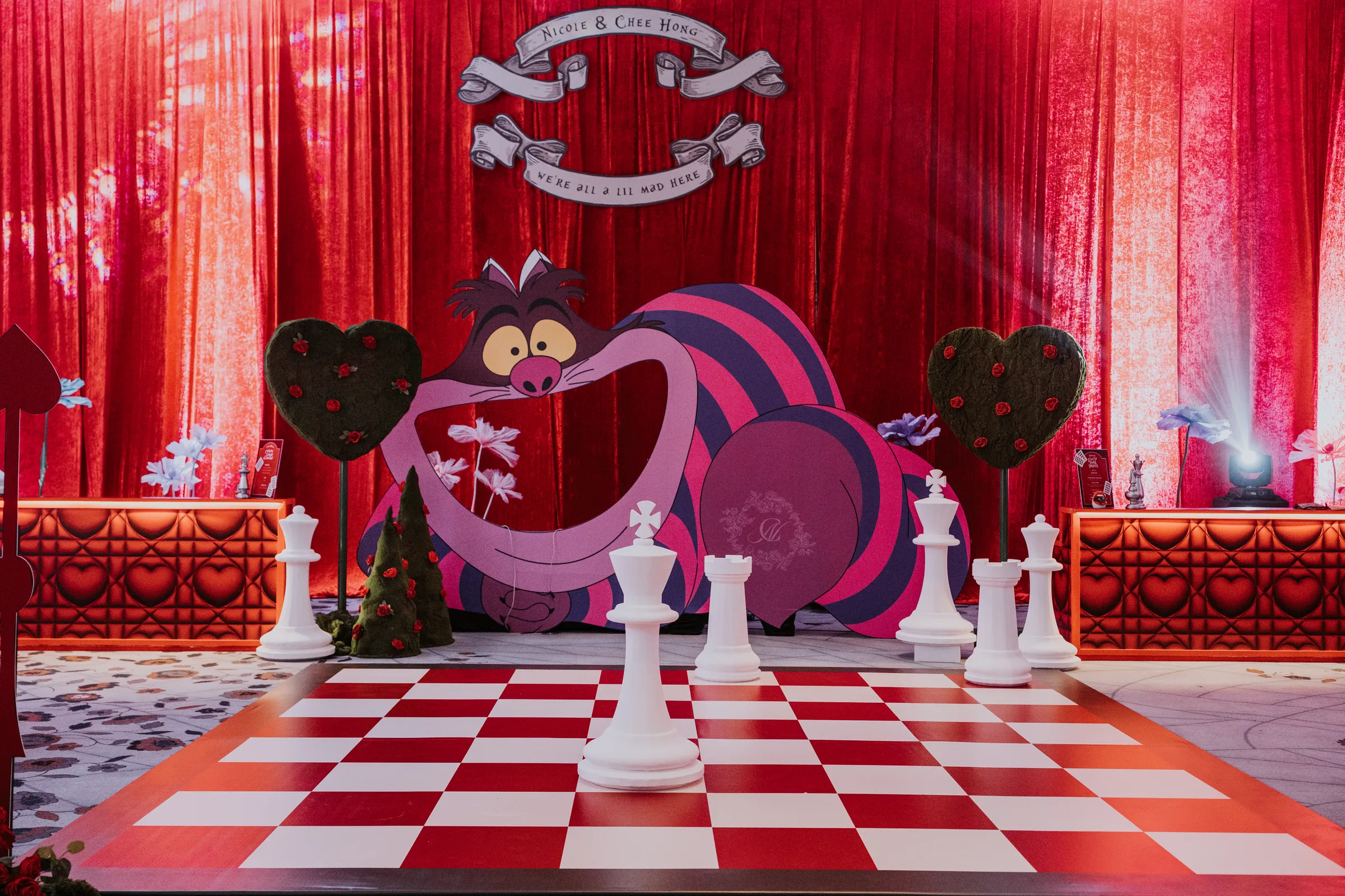 As the night unfolded, the celebrations took a playful turn with an Alice in Wonderland–themed after-party. With bold red drapery, oversized chess pieces, and the mischievous Cheshire Cat presiding over the scene, the couple invited their guests to step into a fantastical world—an exuberant finale to a wedding that balanced elegance with delightful imagination.