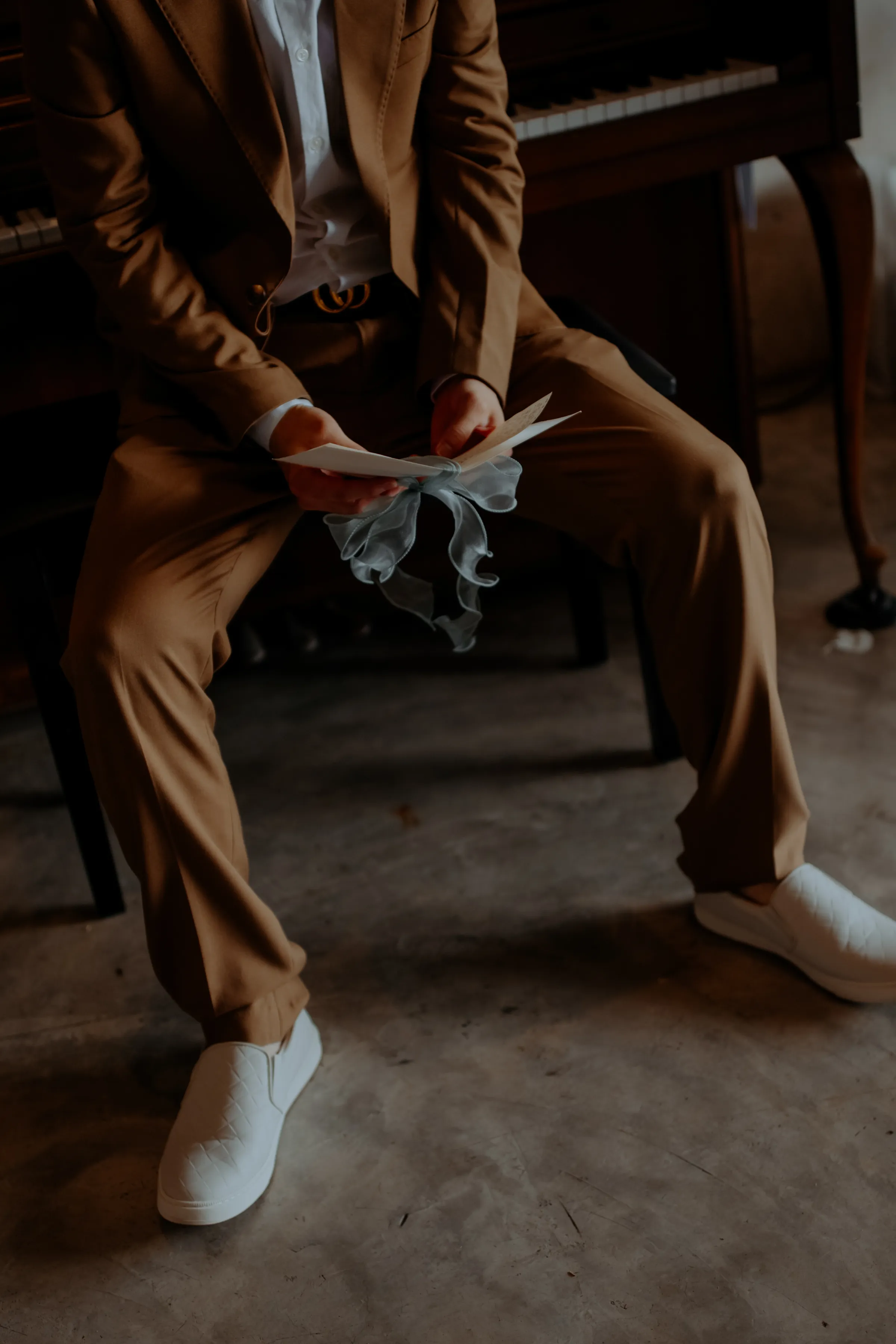 The bride’s gown was a flowing white and gold chiffon dress that embraced the fluidity of movement with delicate gold lace that mirrored the shimmer of sunlight on the sea’s surface. The intricate details resembled seashells and mermaid scales, a tribute to her love for mermaids. The groom’s look was dressed in a rich brown suit, his earthy tones blended seamlessly with the rustic surroundings.