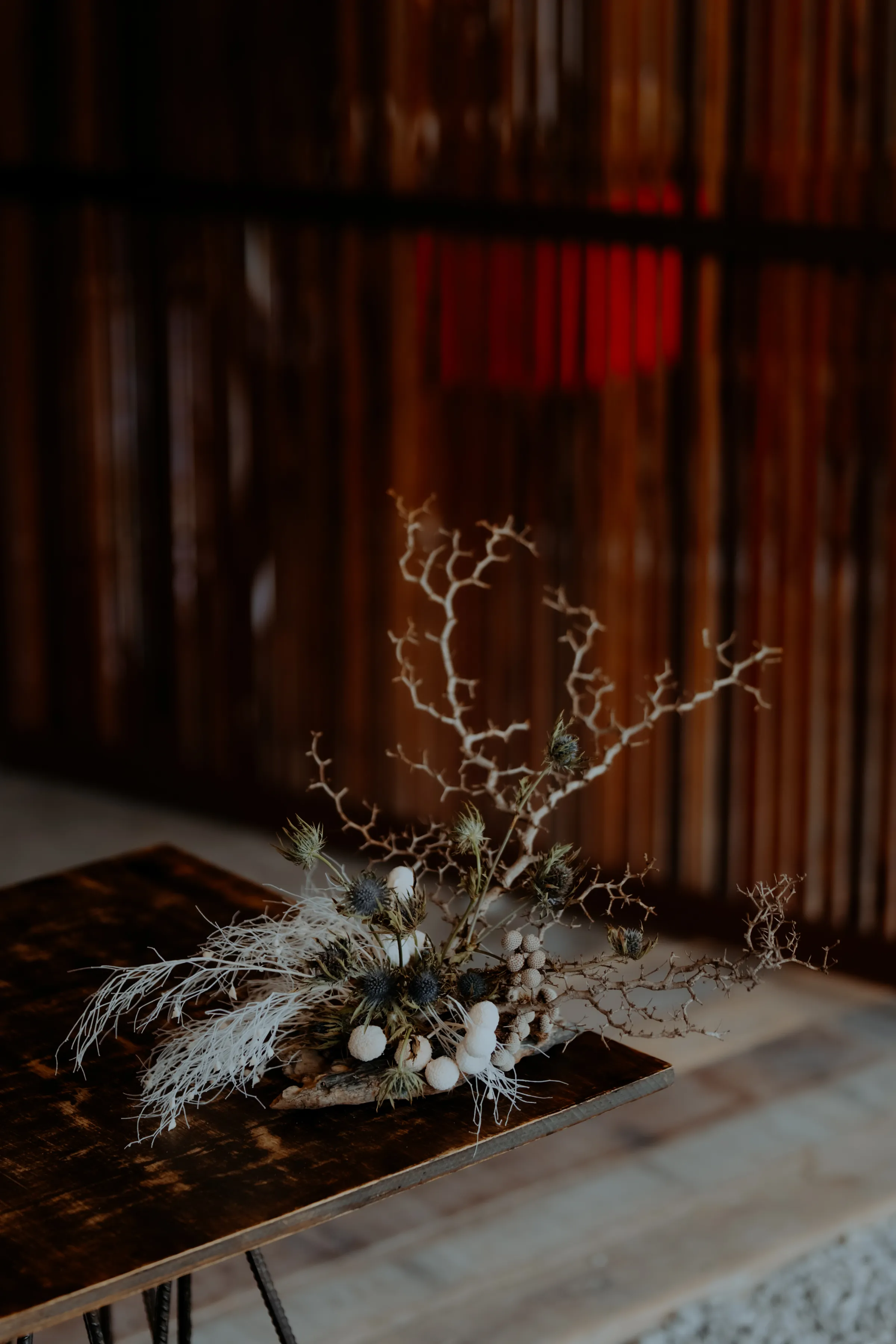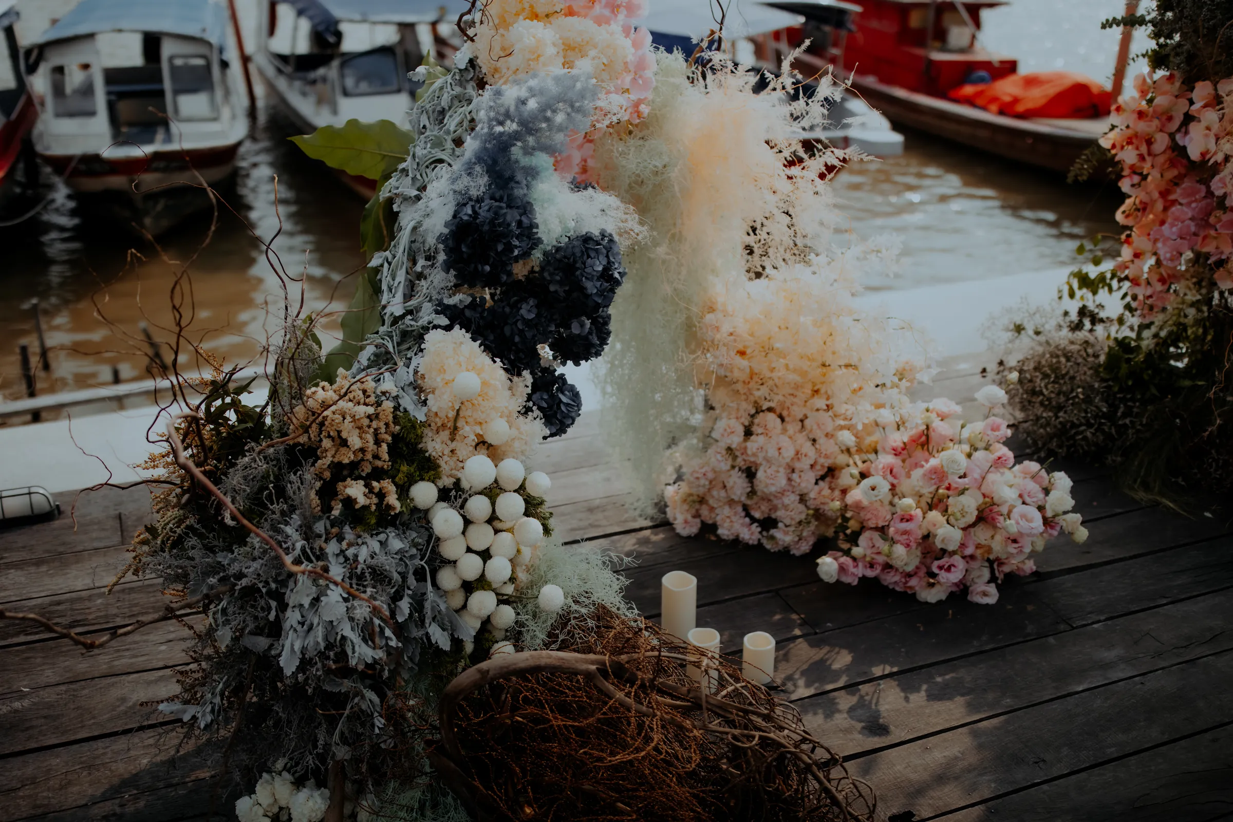 The floral arrangements were a masterpiece, designed to mimic coral reefs and underwater landscapes. Dried foliage, preserved blooms, and organic textures intertwined in shades of deep navy, sandy beige, and ivory, evoking the raw beauty of the ocean floor. Along the wooden jetty, candles flickered softly, casting a warm glow as the sun dipped below the horizon, illuminating the surrounding mangroves.