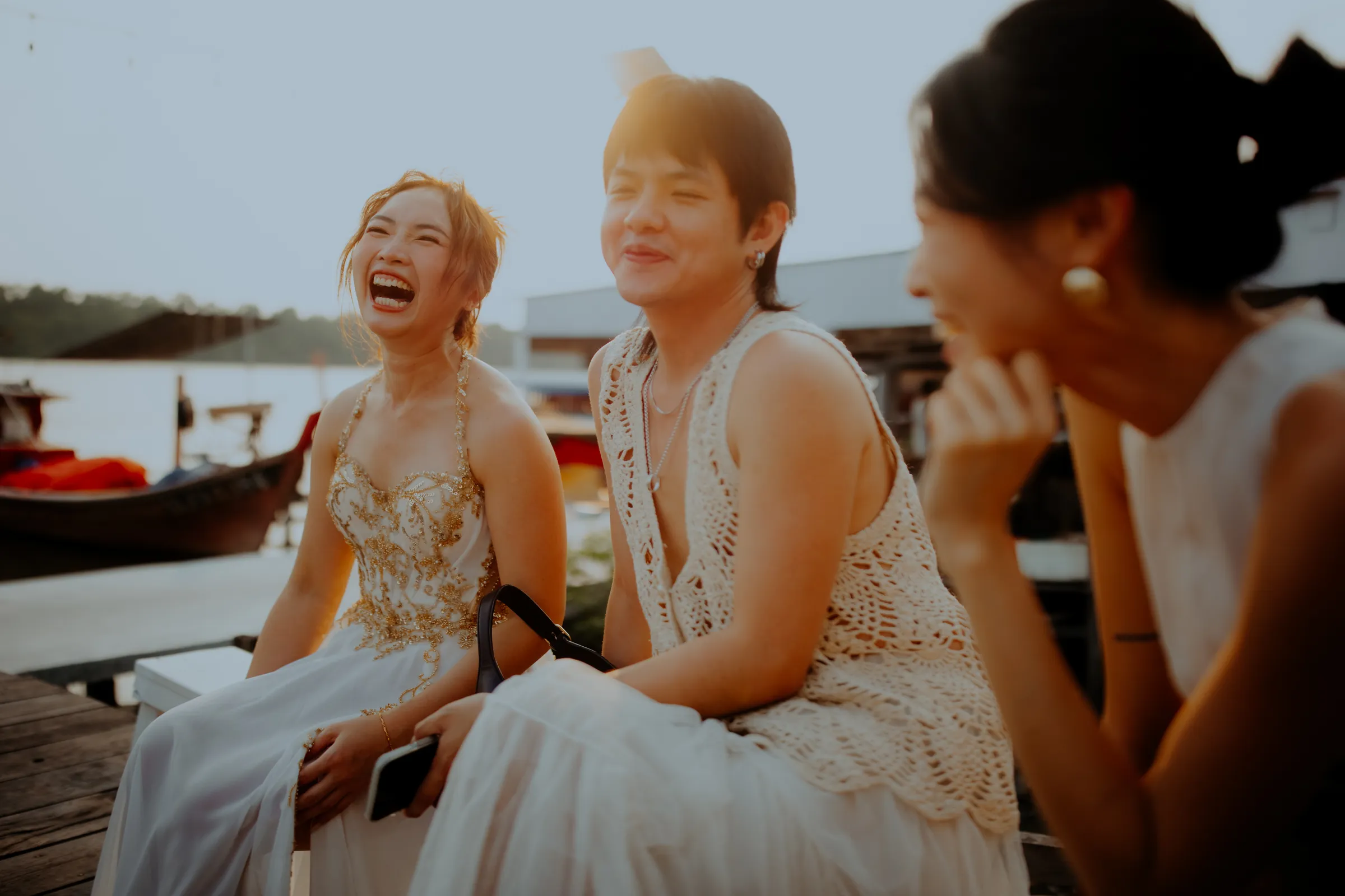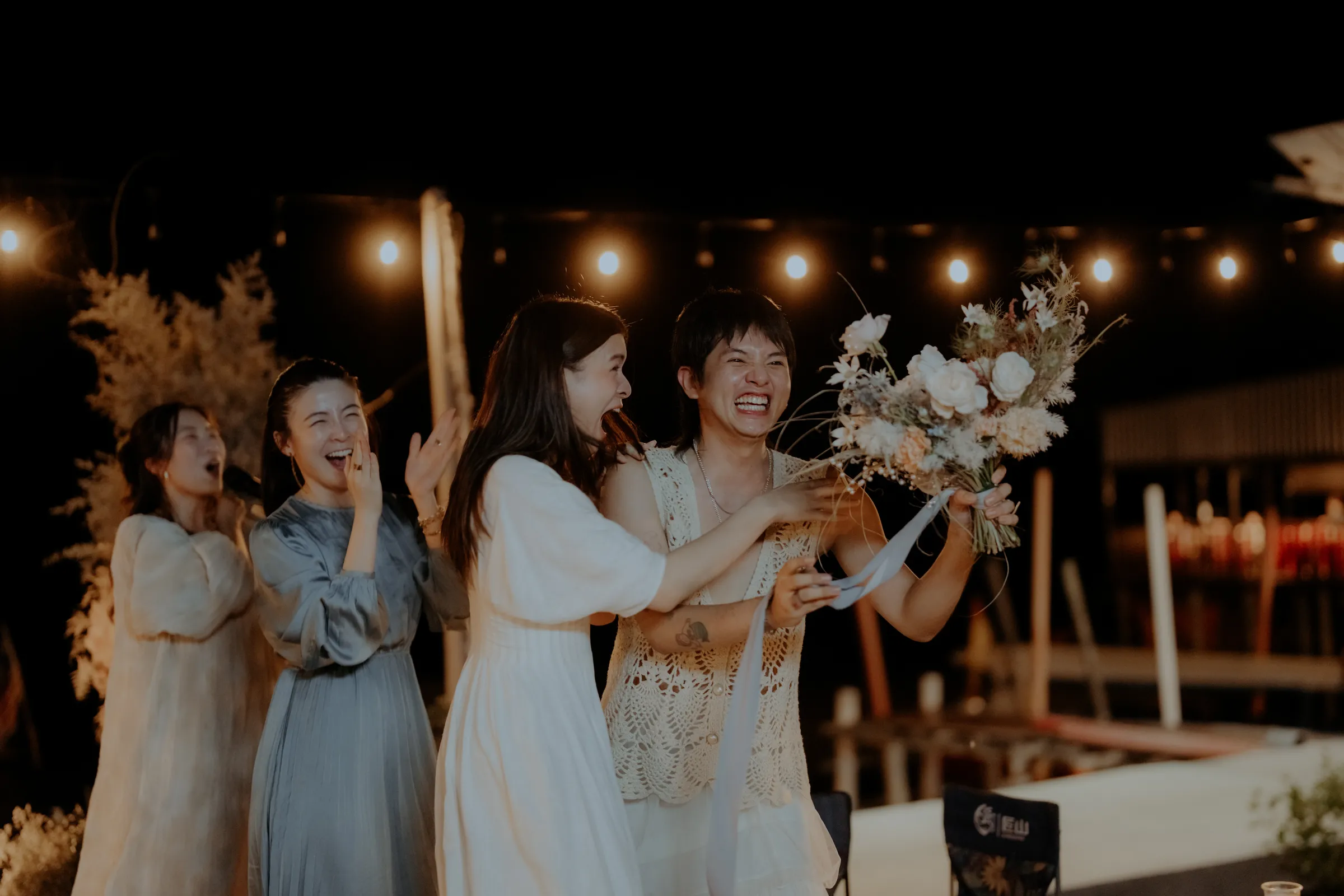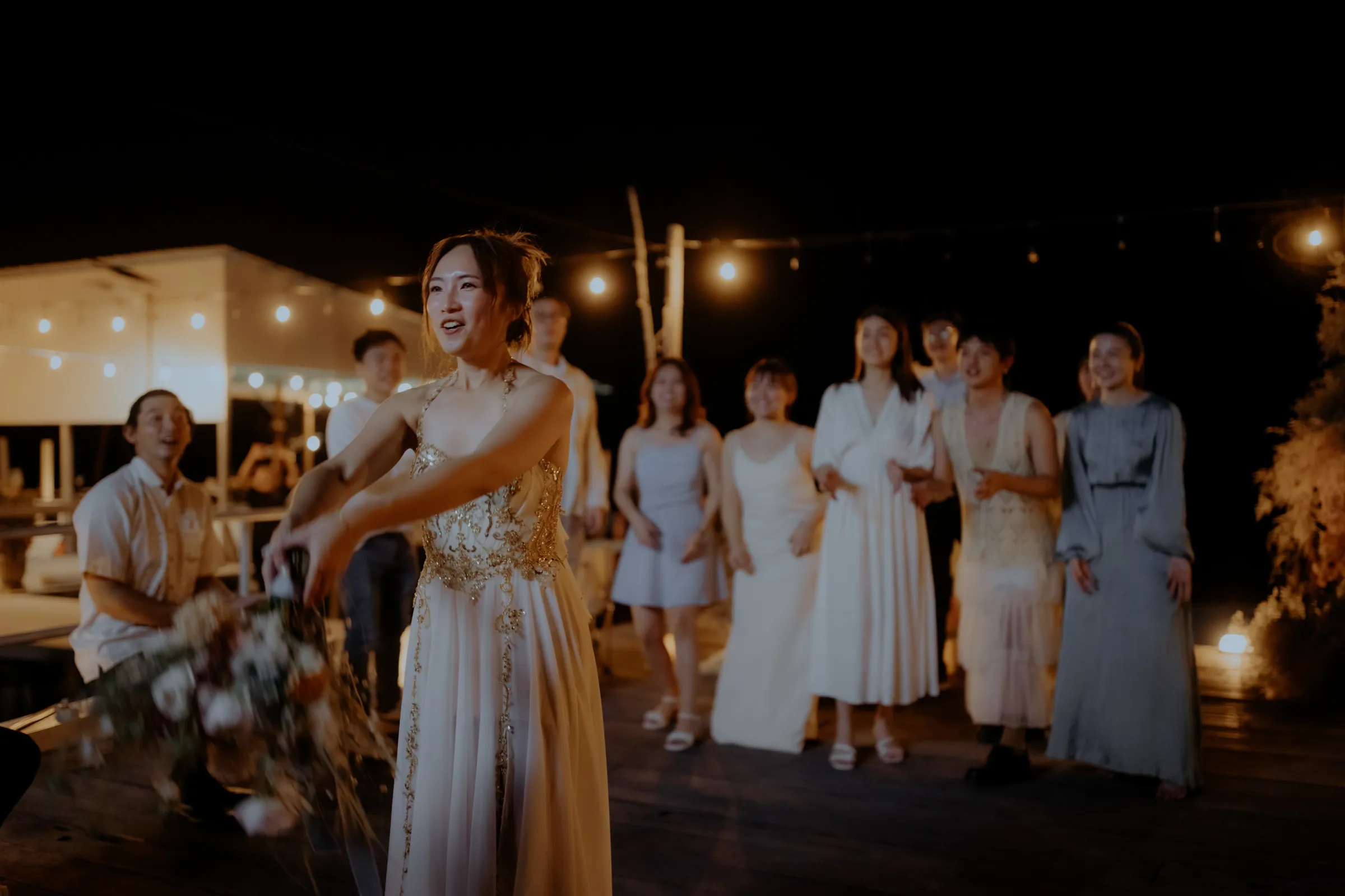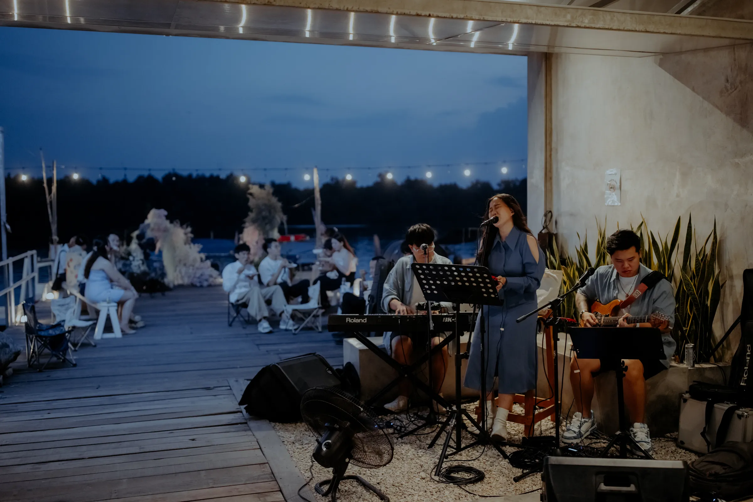 As night fell, the celebration transformed into something even more enchanting. A live band performed on the café’s open deck beneath a canopy of string lights, their melodies drifting over the water. The lead singer dedicated a song about mermaids, a heartfelt tribute to the bride’s deep love for the sea. Guests swayed, clapped, and sang along, completely immersed in the magic of the night.