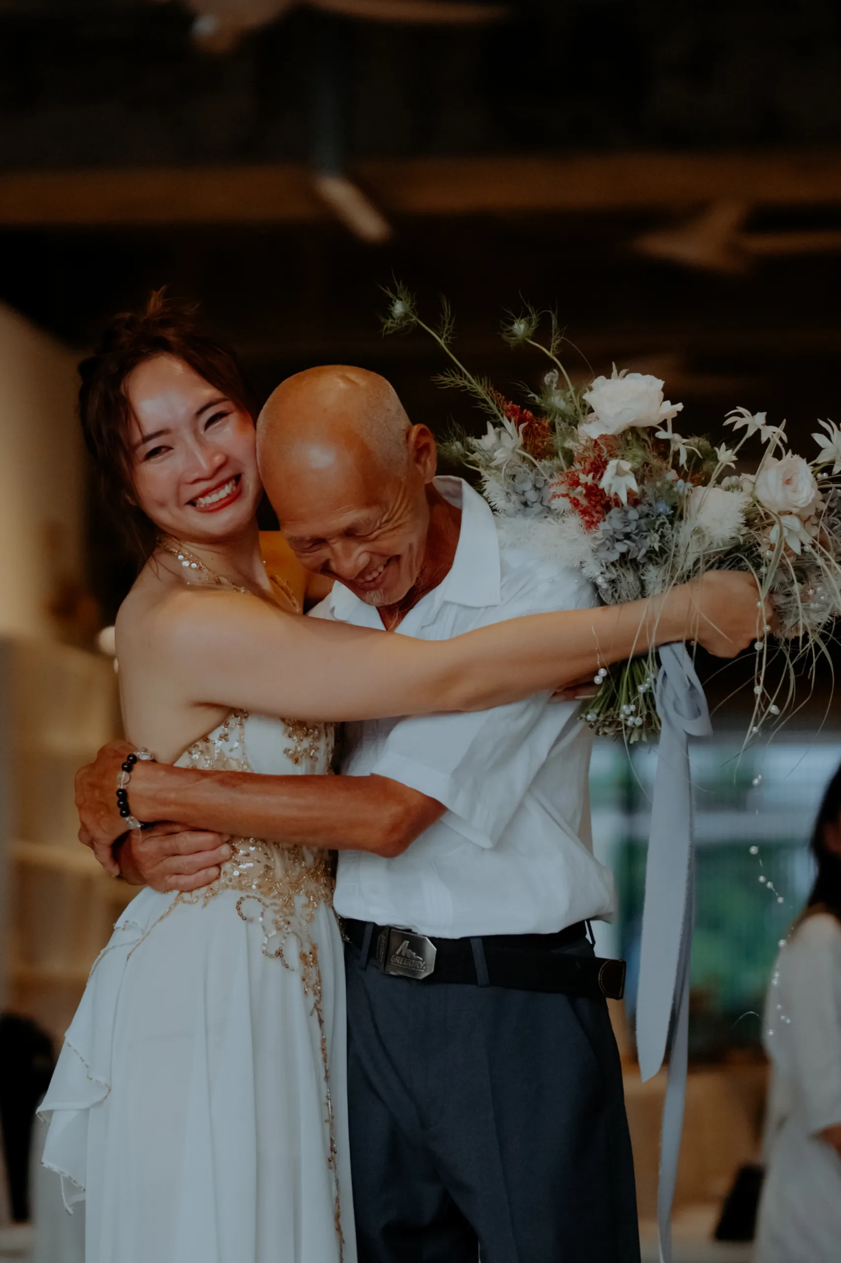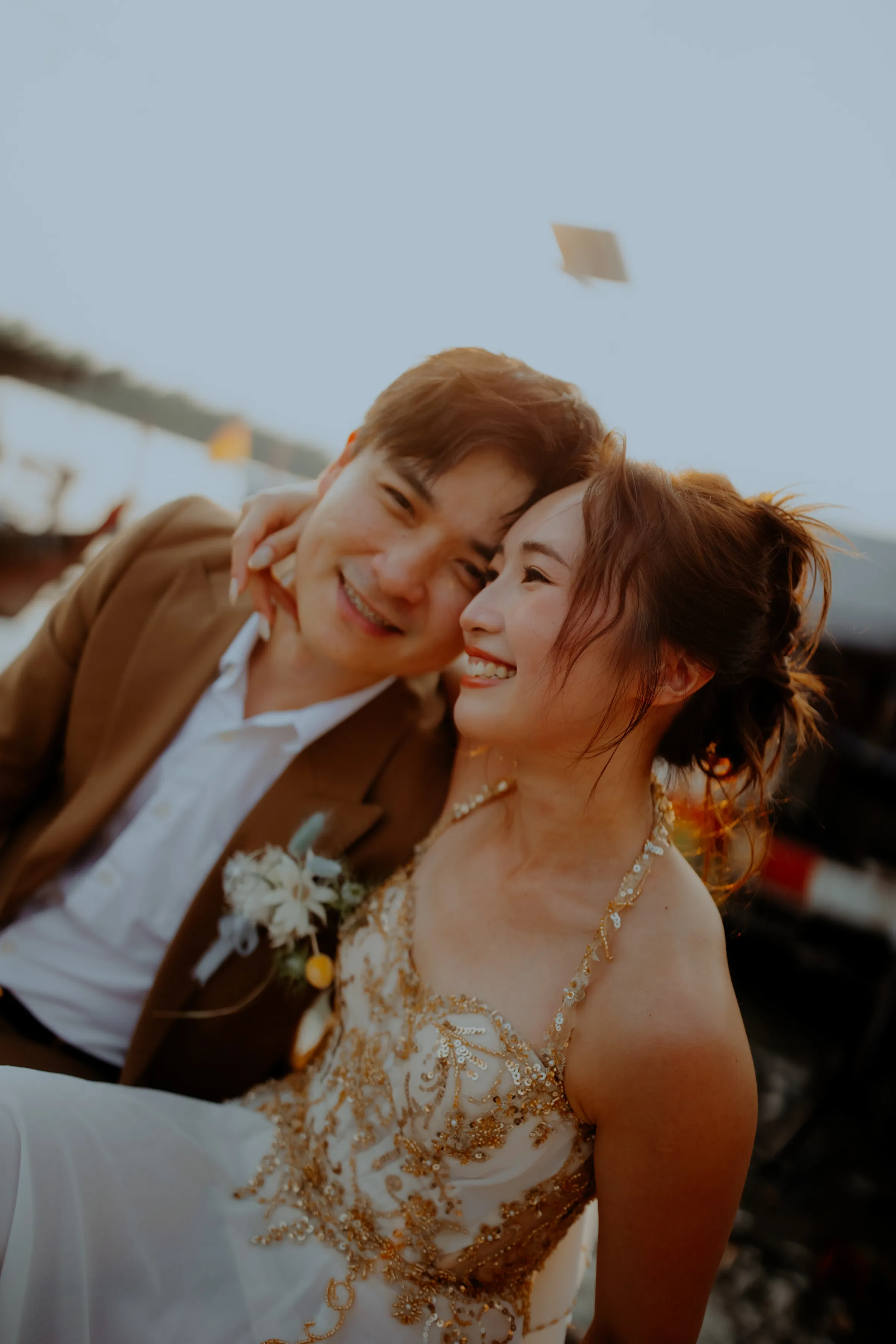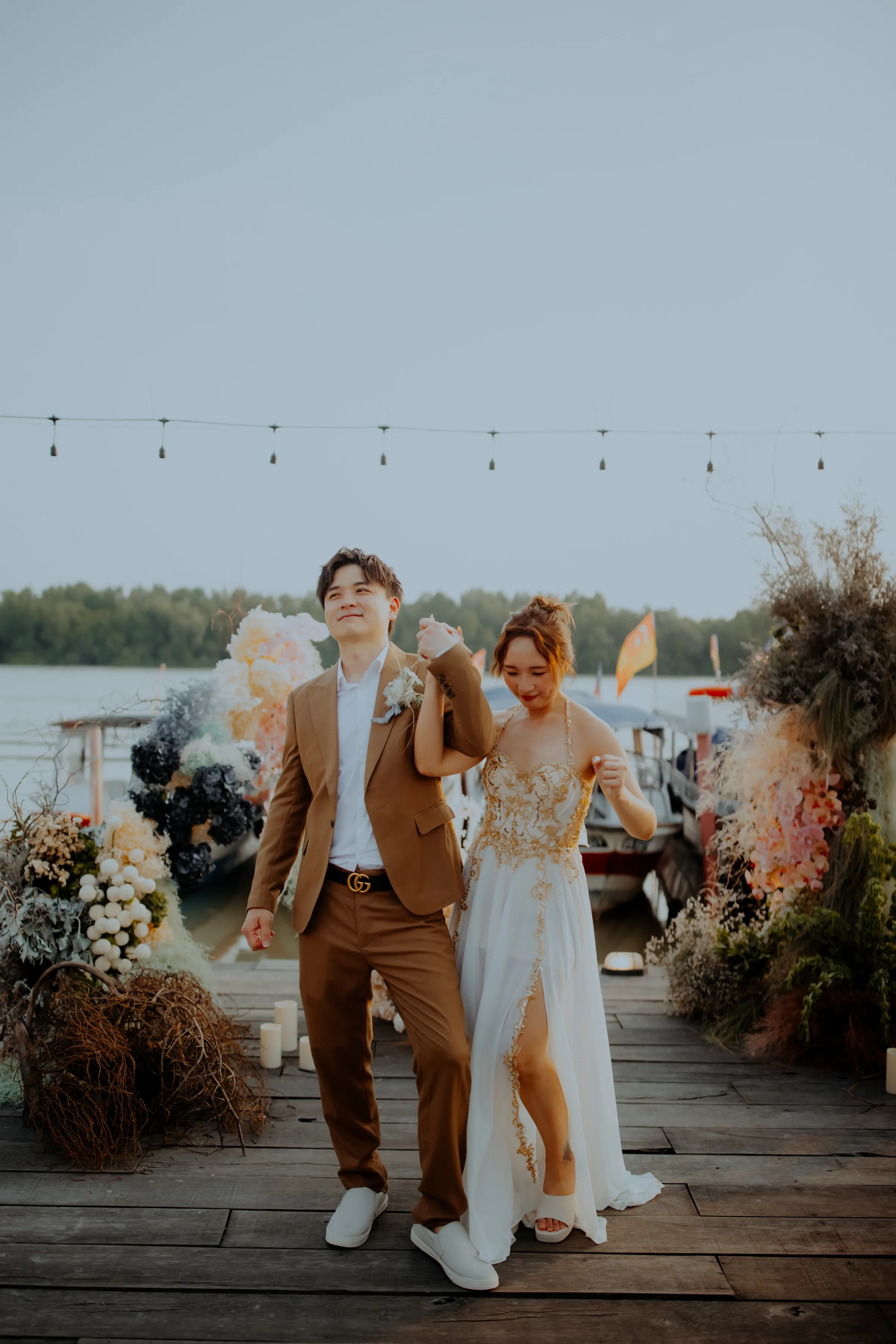 They found the perfect venue in an unexpected place—a charming café nestled within a traditional fishing village in Kuala Selangor. With wooden jetties, bobbing fishing boats, and sprawling mangroves as their backdrop, they created a unique wedding in this hidden gem by the water. This setting, with its deep waters, aged wooden planks, and the ever-changing hues of the sky, lent itself to a wedding aesthetic that felt both raw and ethereal.