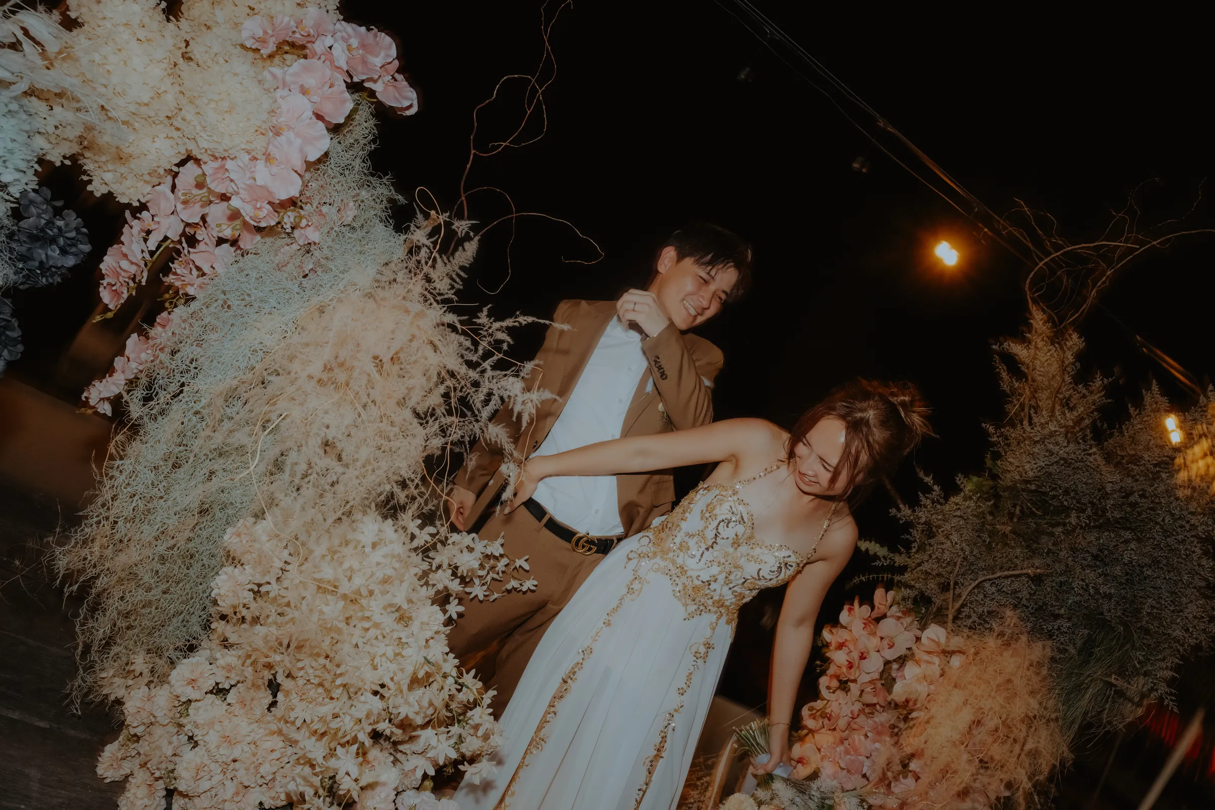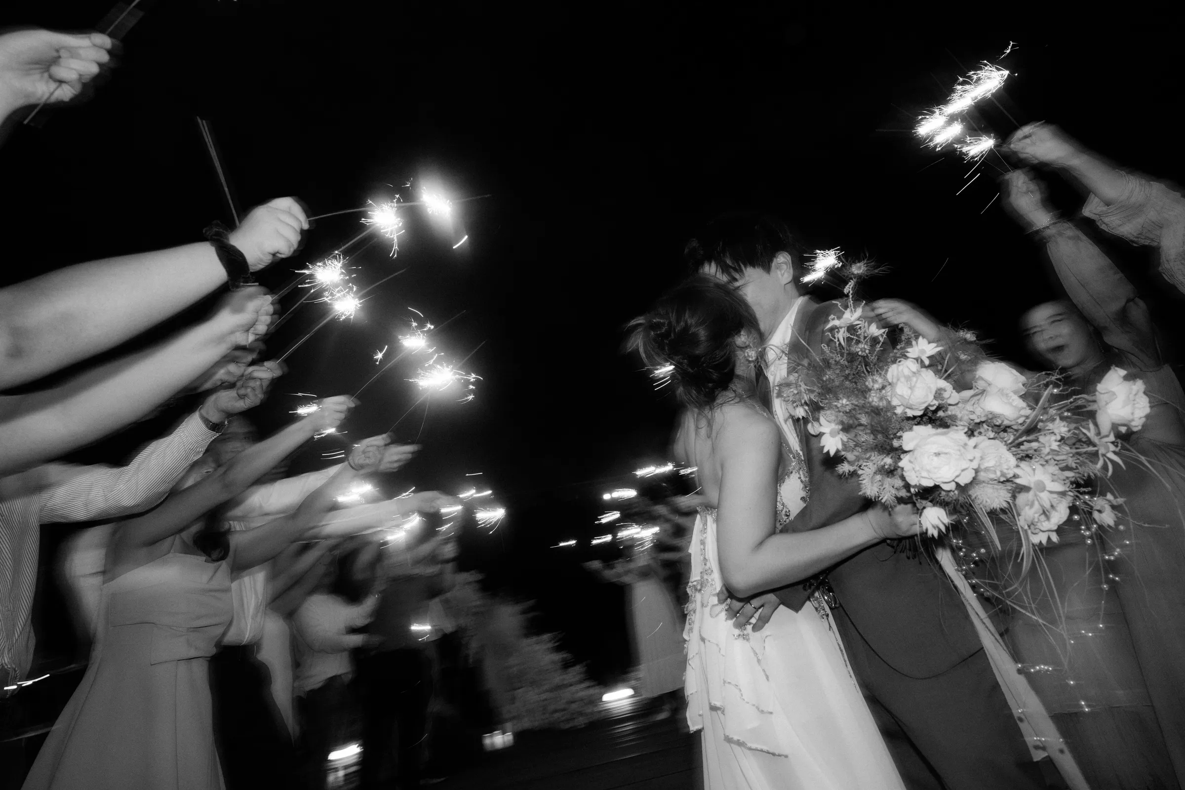 Later, under the moonlit sky, the couple shared their first dance, surrounded by loved ones holding sparklers high in the air. The final moment—a breathtaking kiss amidst the glow of golden sparks—was the perfect ending to an unforgettable night.