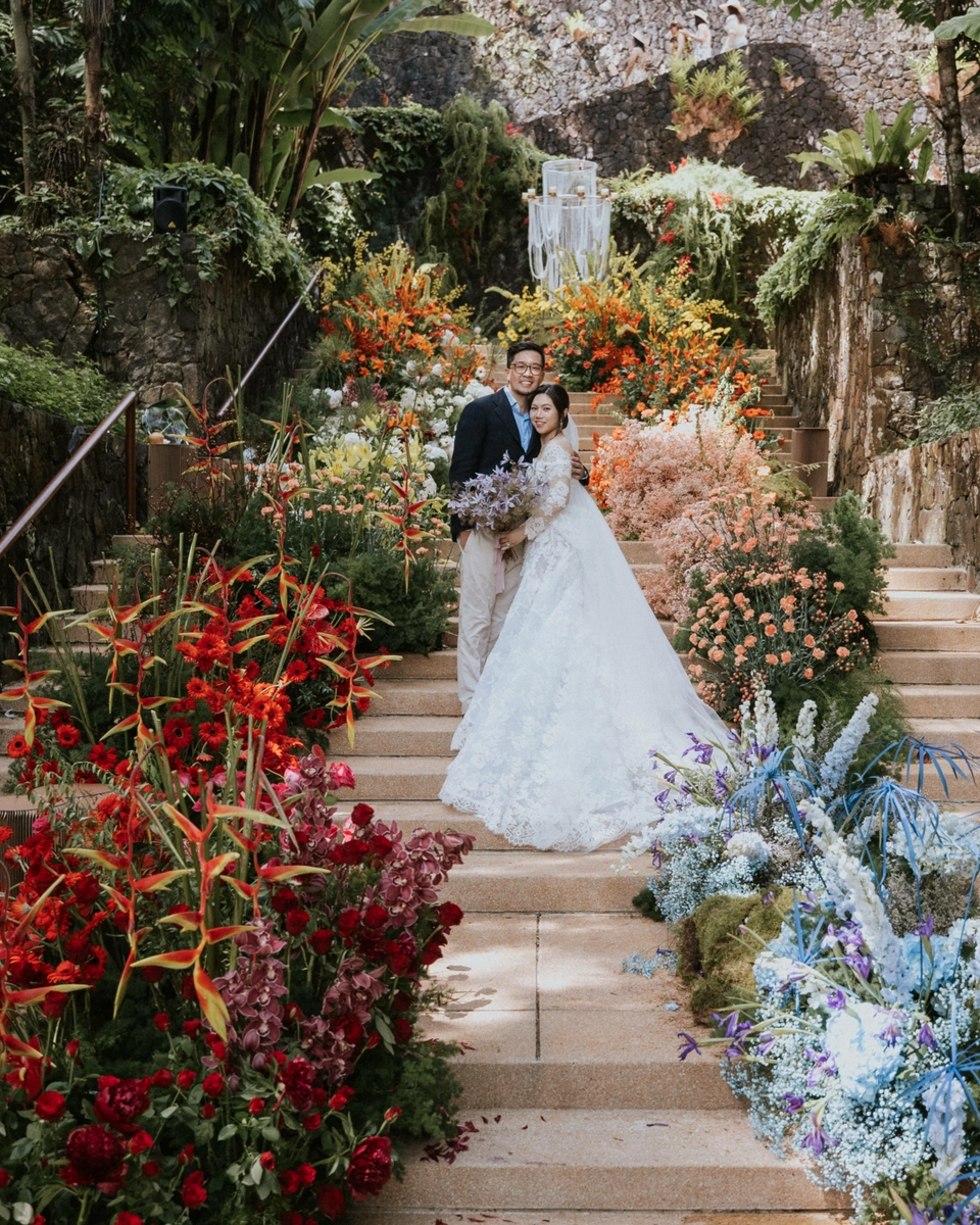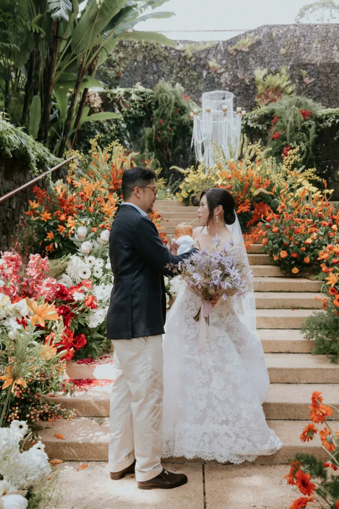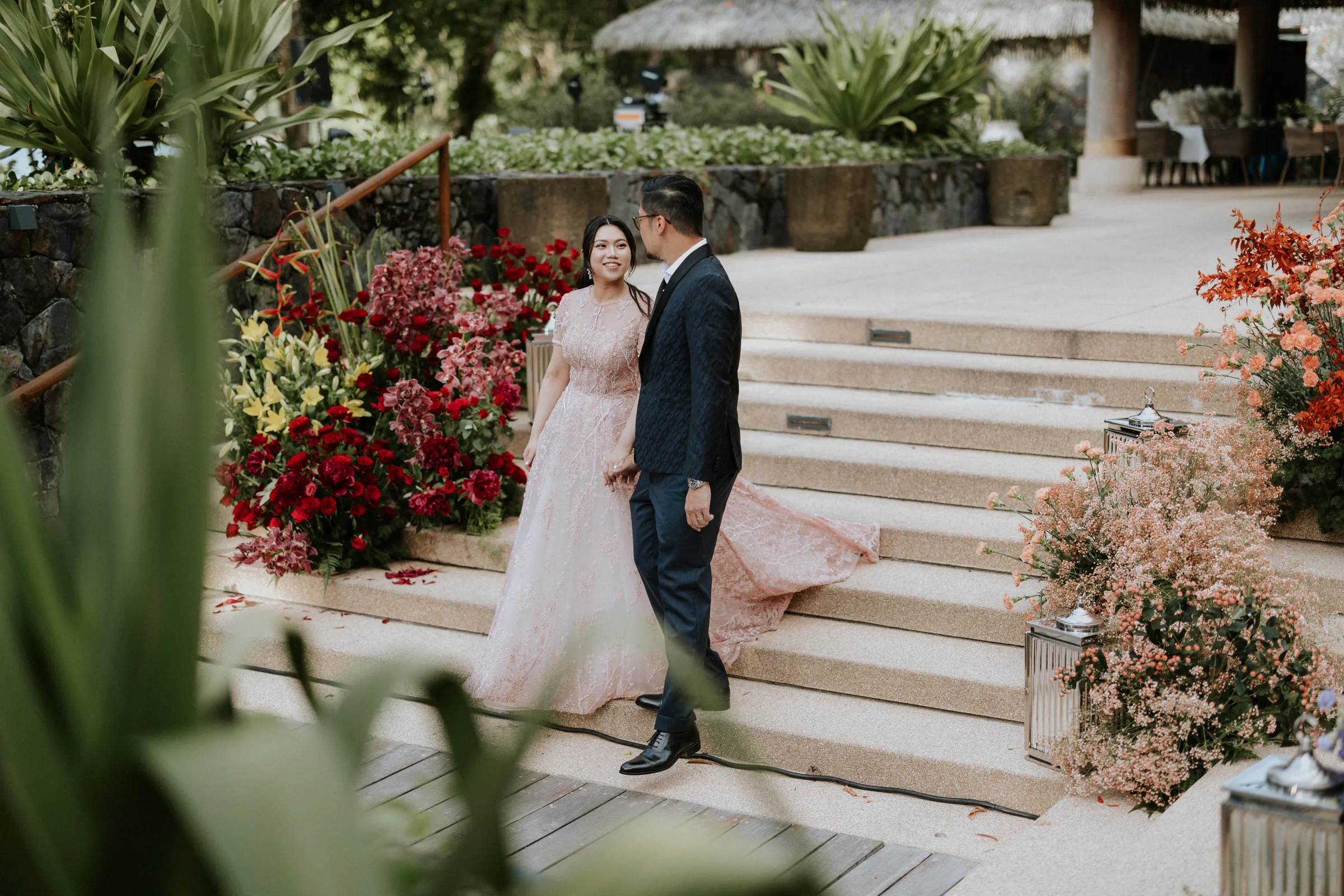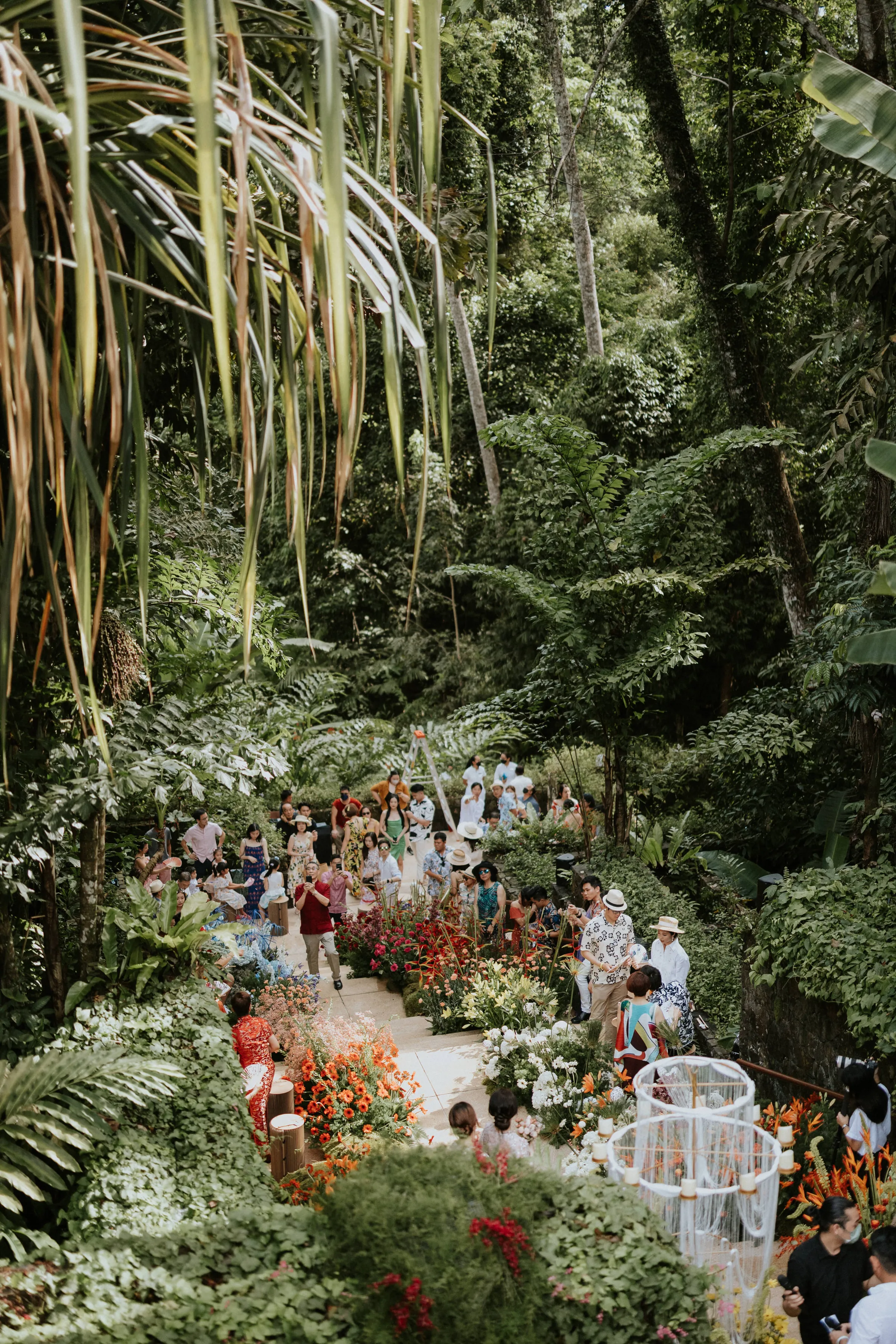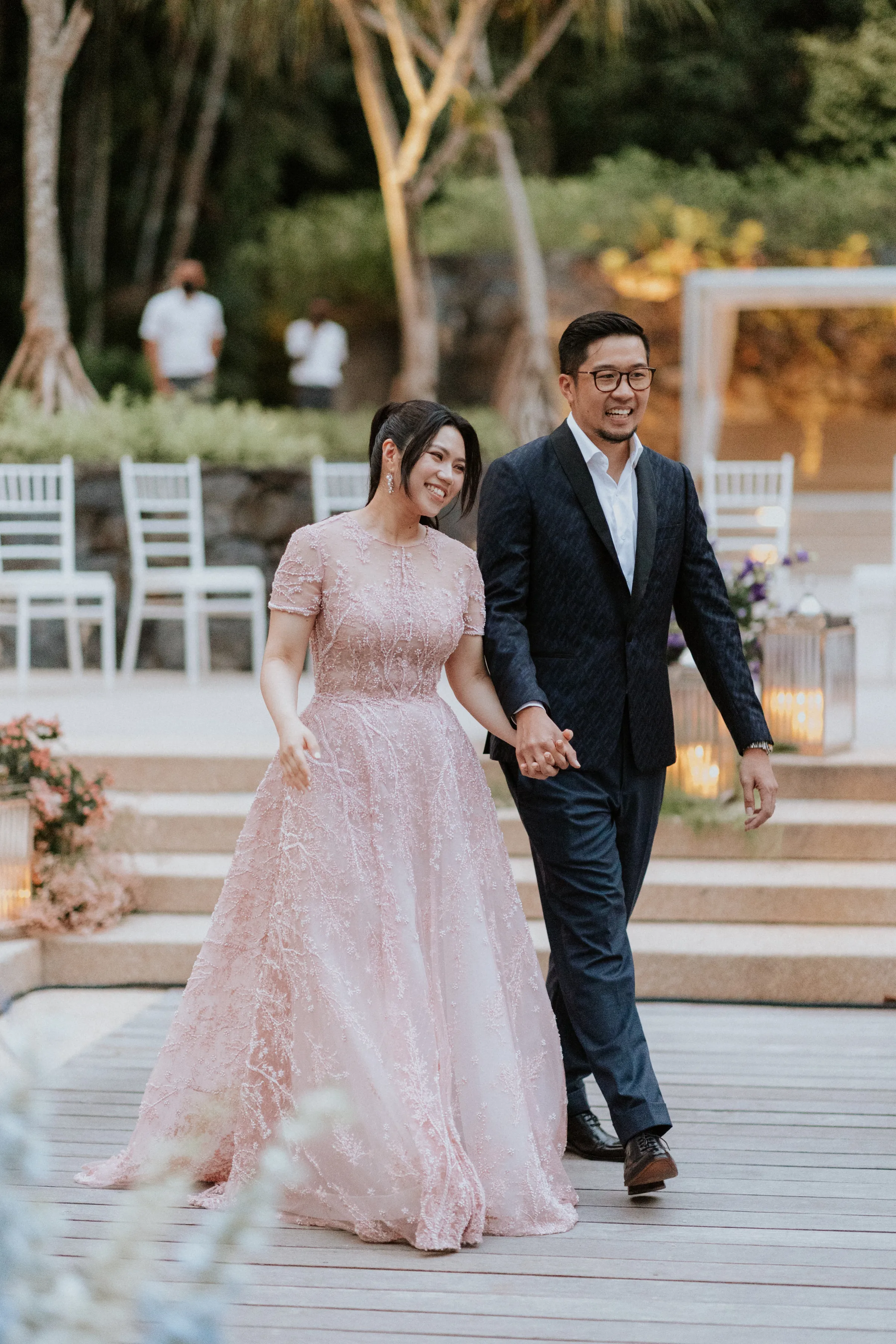 Despite not having been to The Datai, Langkawi, the venue came highly recommended by family and friends. When they did visit, the sense of being enveloped by the forest ridge and the immaculately curated landscape architecture authenticated the reviews they heard. “The moment I saw the grand stairways that connected the hotel to the beach I knew immediately how the ceremony would be,” Chia Wei says. “We also wanted our wedding weekend to feel like a retreat and a wonderful experience for our family and friends and The Datai checked all those boxes.”