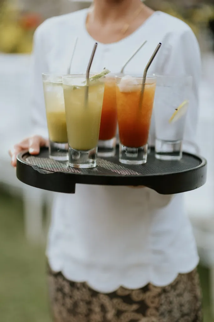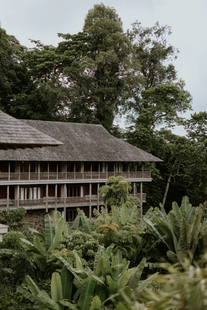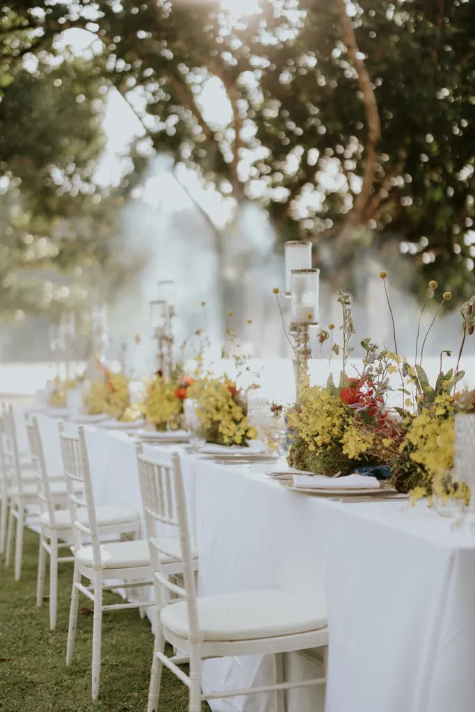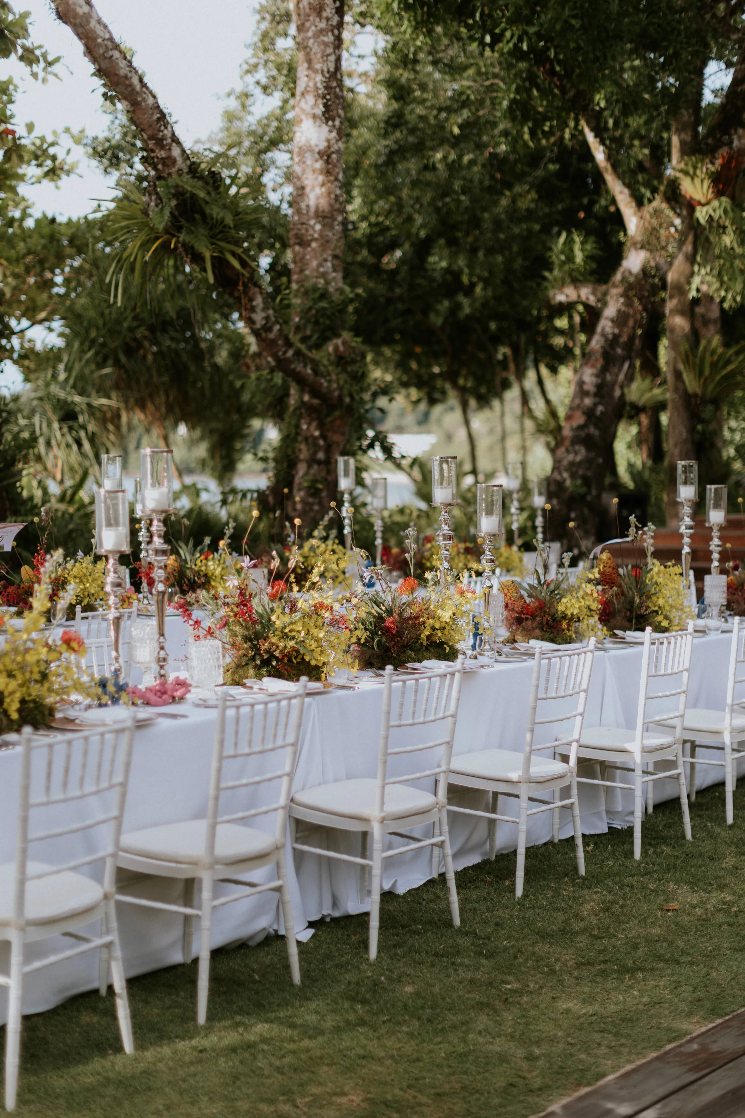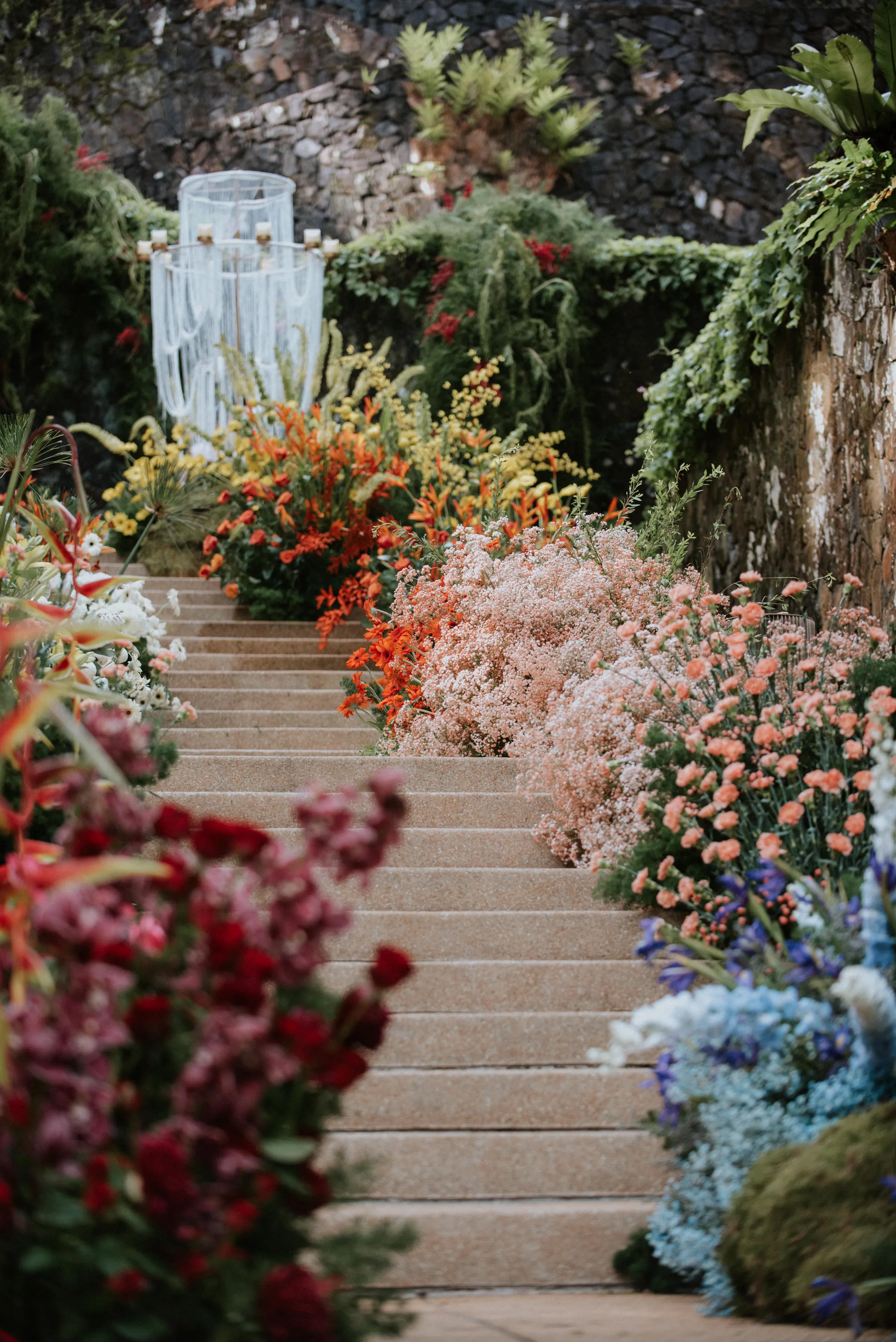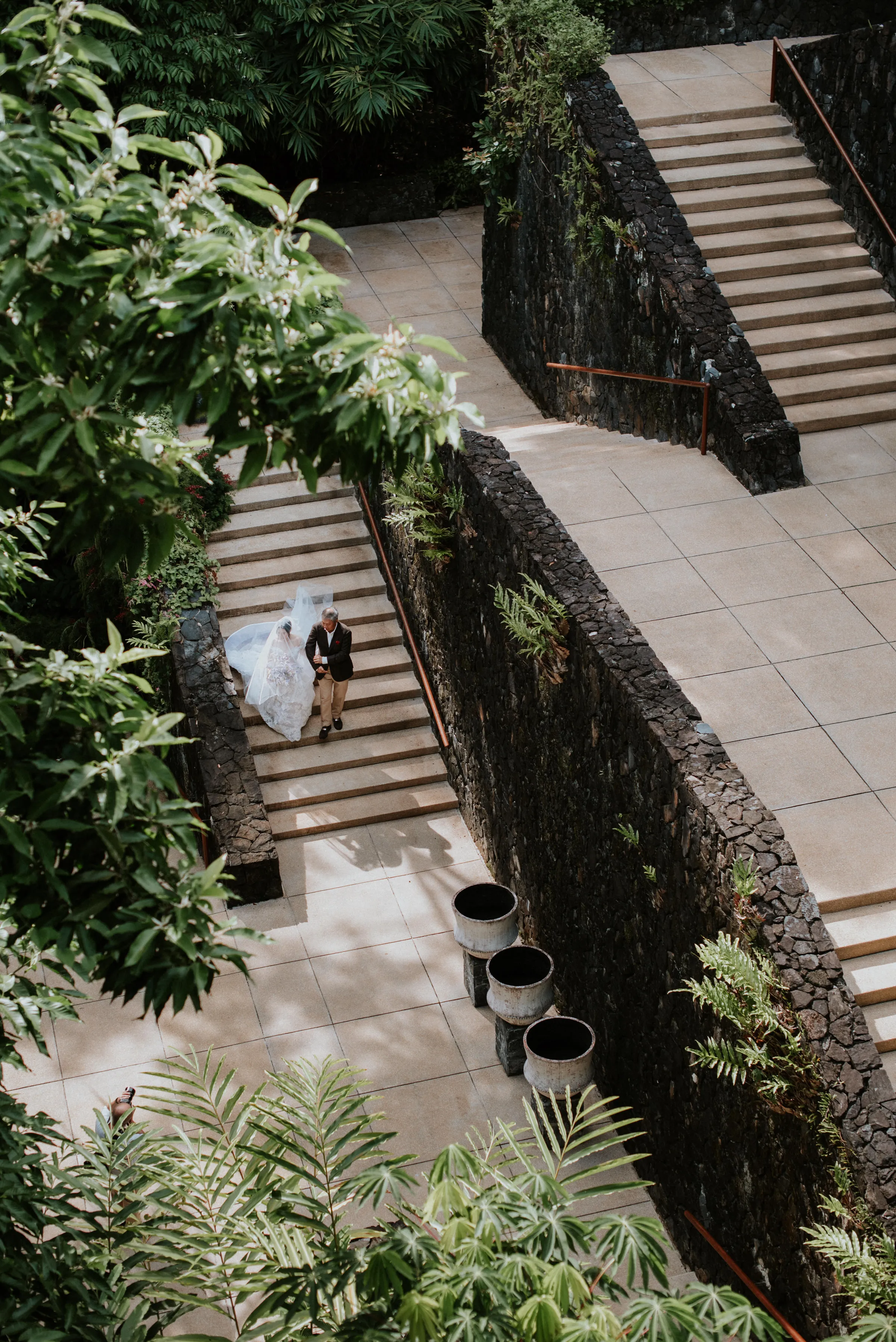 For the ceremony, the bride wore a stunning Oscar de la Renta A-line wedding gown with V-neckline, off-shoulder sleeves with lace appliques and looked every bit like a modern-day princess as she made her perceptible entrance down several flights of stairs to the altar. Brightly coloured displays of cascading florals pop against the virgin rainforest background. It was the perfect stage for a vow exchange between these two lovebirds. Below family and close friends played witness, the dress code was ‘havana’. Everyone enjoyed refreshments – fresh coconut and canapes after.