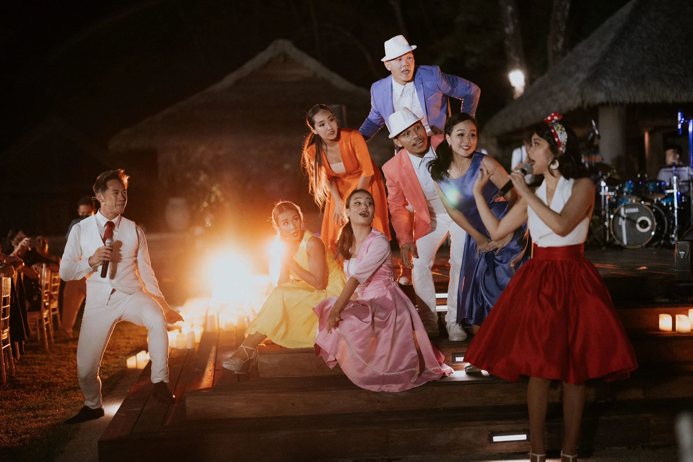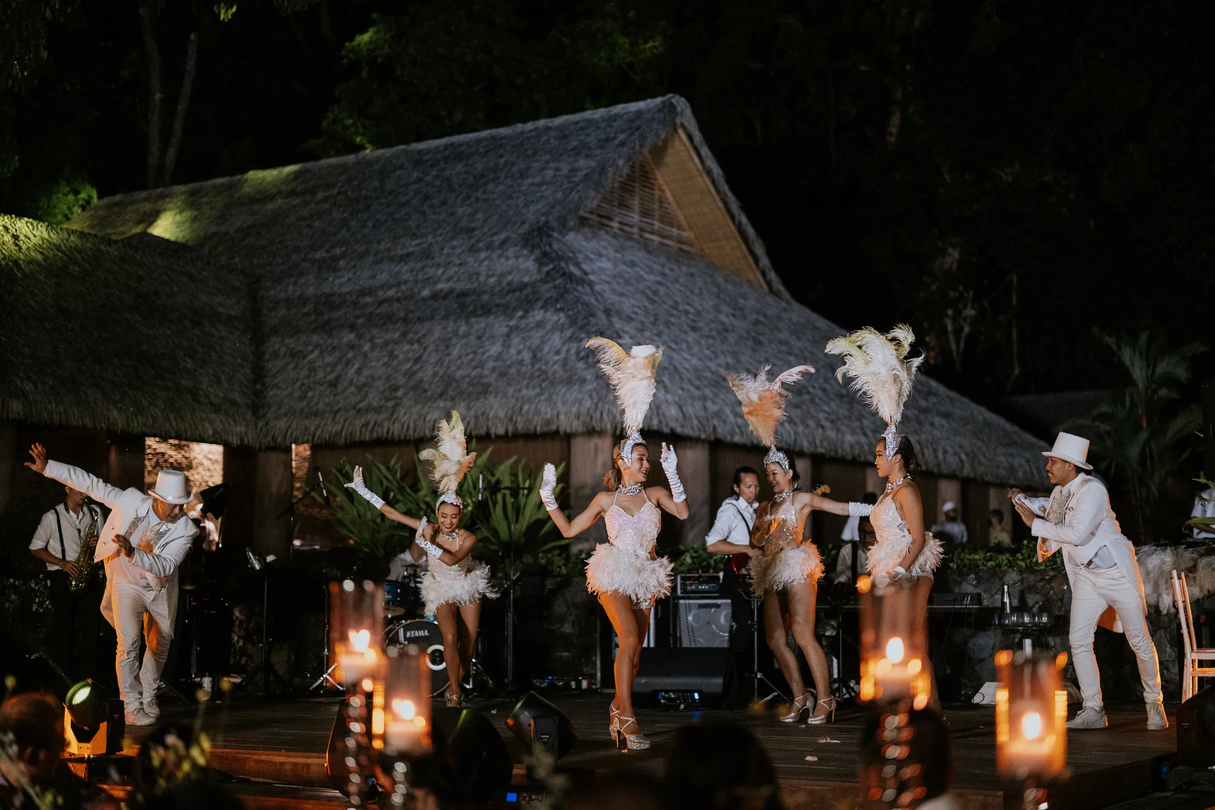 The reception was held outdoors, overlooking the Andaman Sea. Viking tables were embellished with lush floral arrangements, silver candelabras, votive candles and crystal centrepieces. Throughout the ceremony, guests were entertained by musicians, cabarets and finally- a full fledged musical takes the cake with an interactive 3rd act that got guests on their feet, dancing.