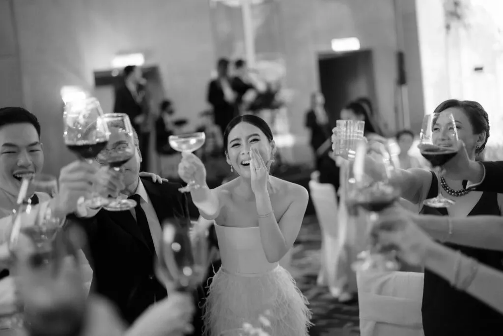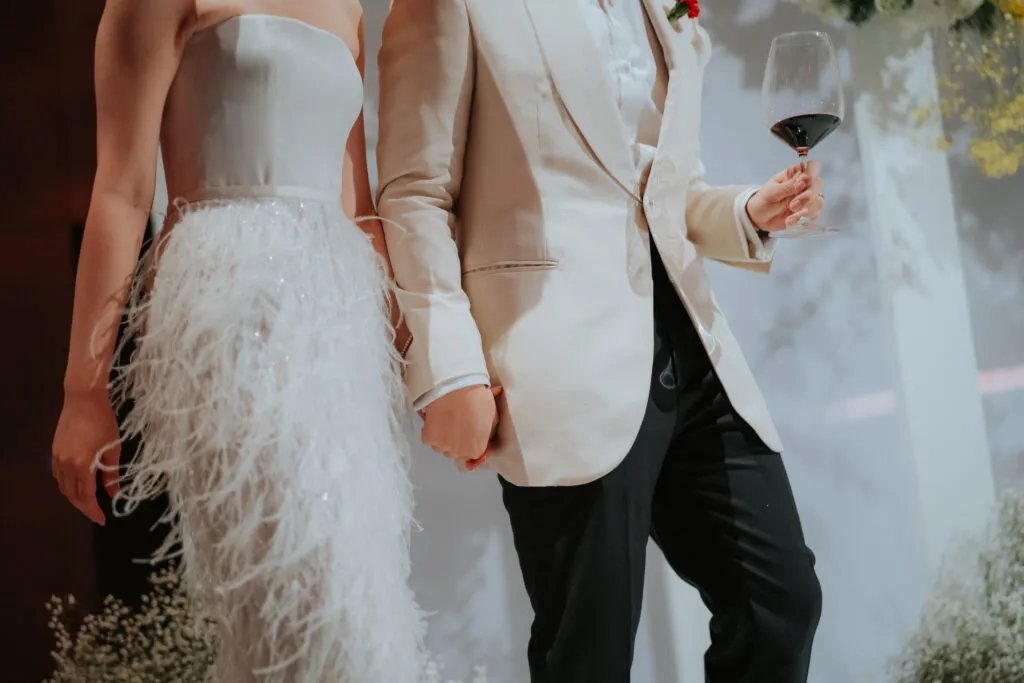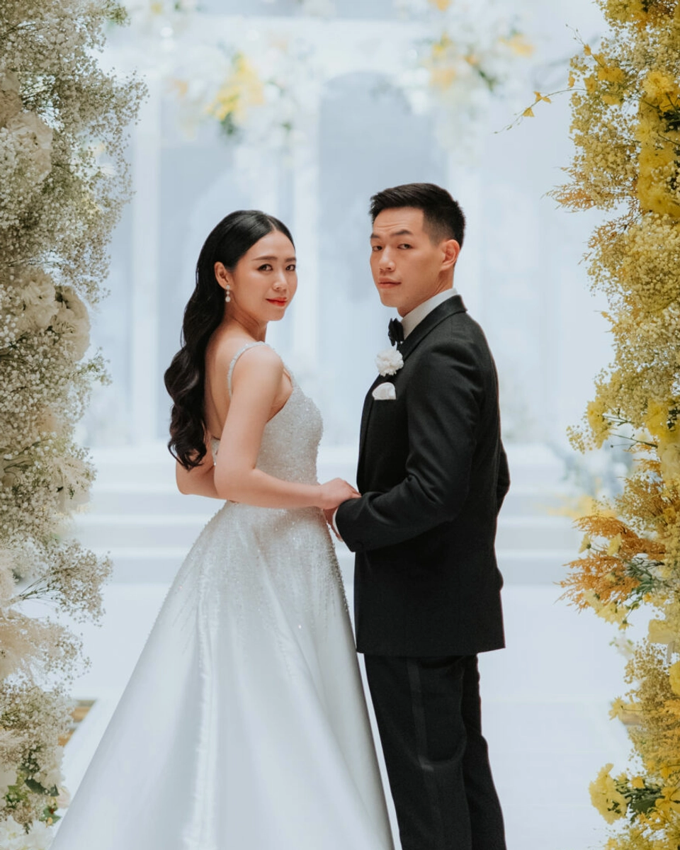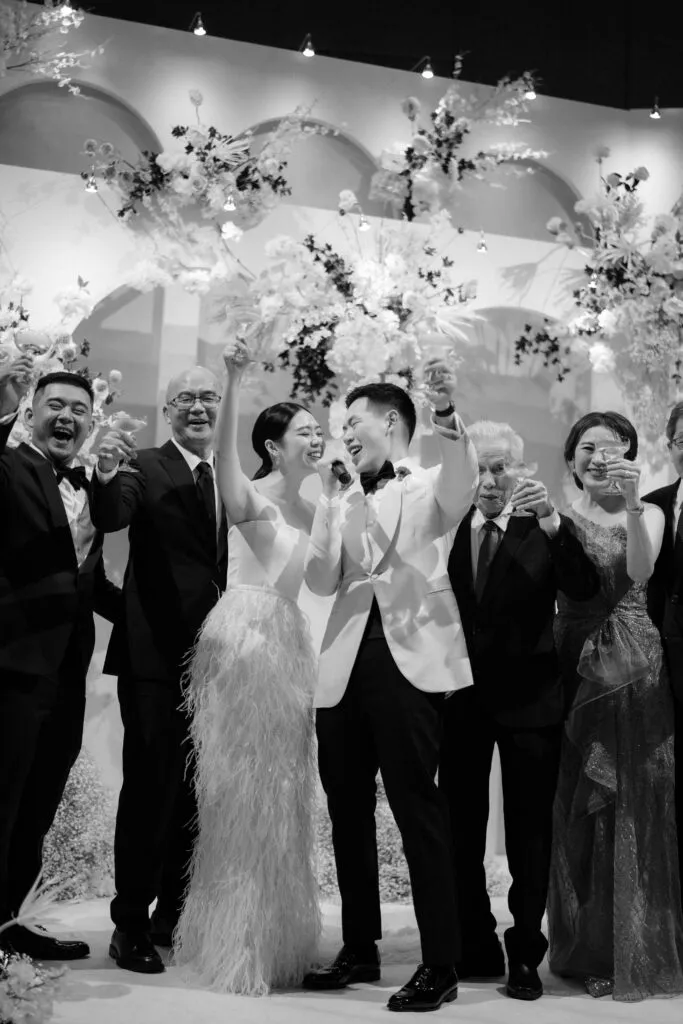 The final reception was held at Four Seasons Kuala Lumpur. The couple and their parents hosted about 180 guests and decided for separate receptions to avoid gathering too many people at the same time. The decor was elegant but it were the bride and groom’s looks that stole the show. The groom looked immaculate in both his black and white tuxedo and completed his look with a luxury timepiece. The bride made her first appearance in a glittering beaded Brian Khoo custom gown. For her second look, she donned a sculpted strapless top, a sleek contrast to the playfulness of feathers embroidered waist down by the same designer. When asked if she had any advice for brides planning their wedding; she replied that working with reputable vendors was essential as one could trust them to deliver a certain standard of service. “I only got to see and try on the dresses by Brian Khoo a few days prior to the wedding so I had to trust that it was going to meet my expectations and he exceeded it – in both workmanship and service.”