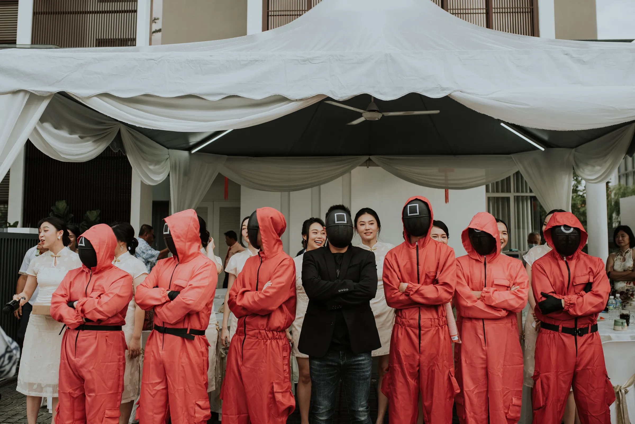 As the groom and his squad arrived at the bride’s home, they were greeted by half a dozen ominous looking pink soldiers from the popular Netflix TV series – Squid game and the group of very spirited bridesmaids. The men eventually succeeded at crashing the gate and the relieved groom was met with a gratified countenance of his bride.