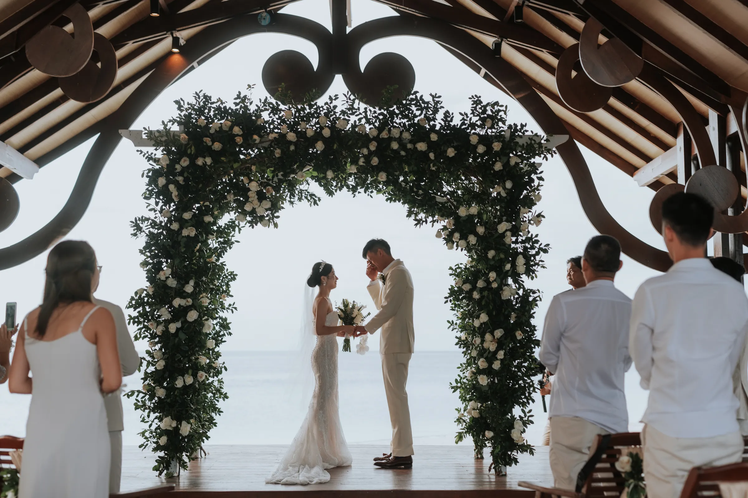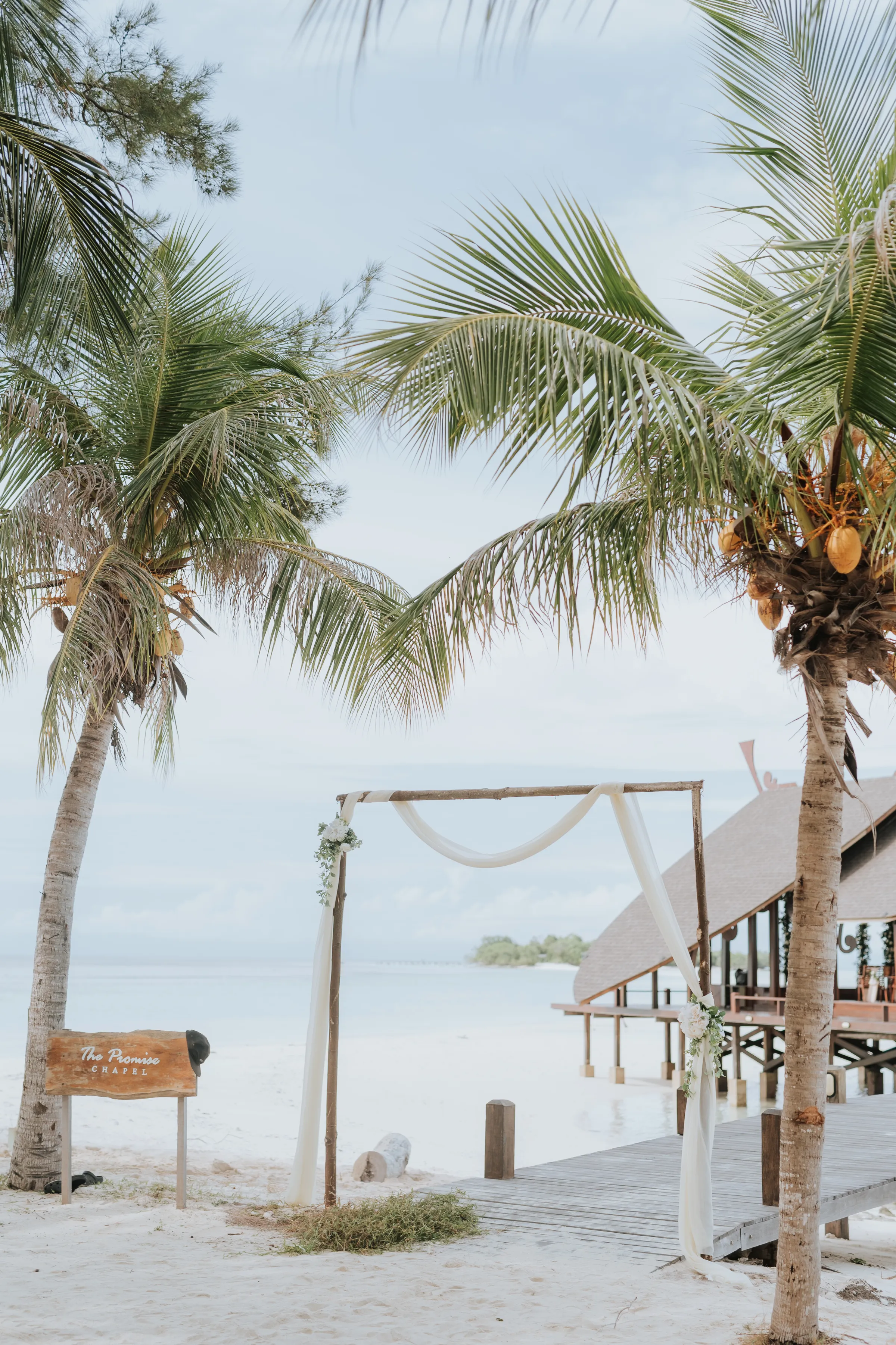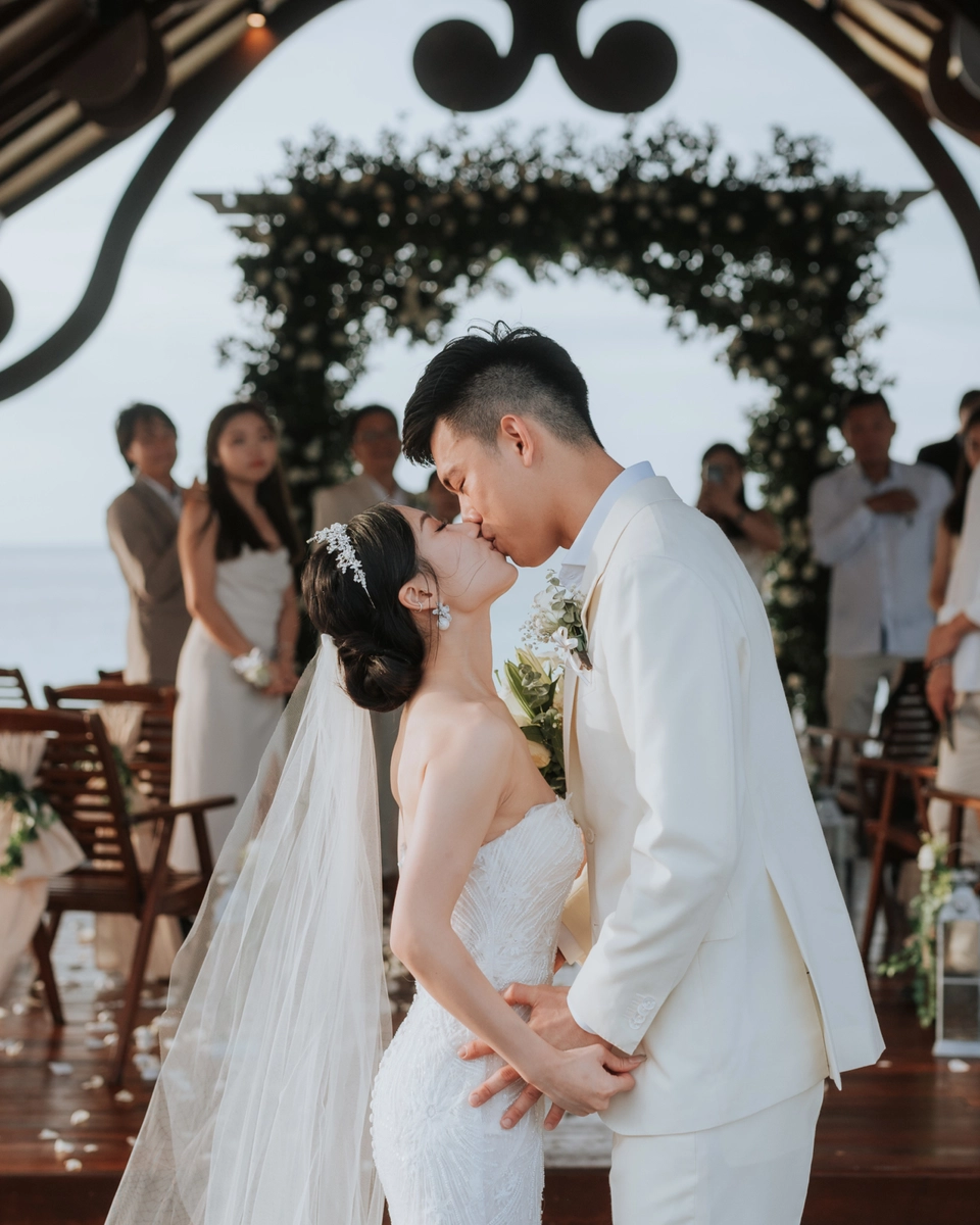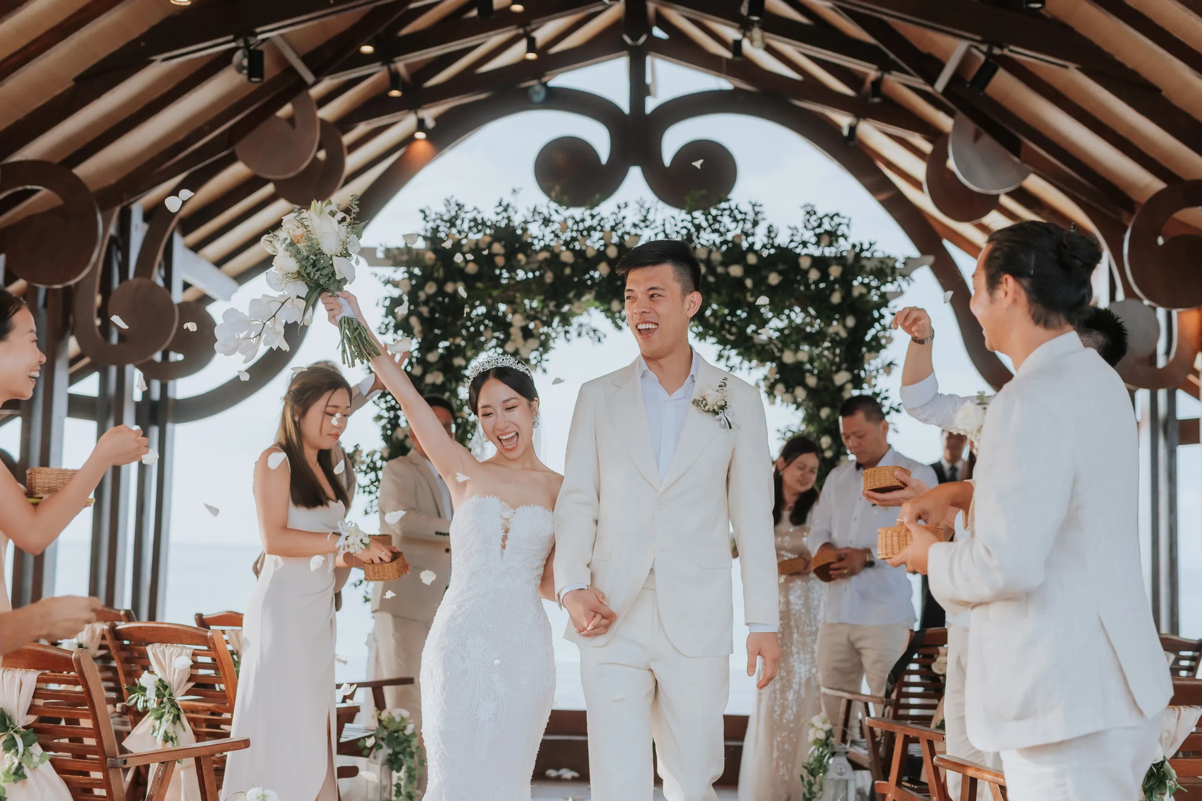 The promise chapel at Mataking Reef Resort was built in 2021, Austin and Sissi were only the 2nd couple to ever tie their knot there. Elegantly decorated with white roses and eucalyptus, the couple exchange heartfelt vows beneath the classic floral arch. As they walked back down the aisle together as husband and wife, hotel staff performed a local traditional love dance of blessing over the couple.