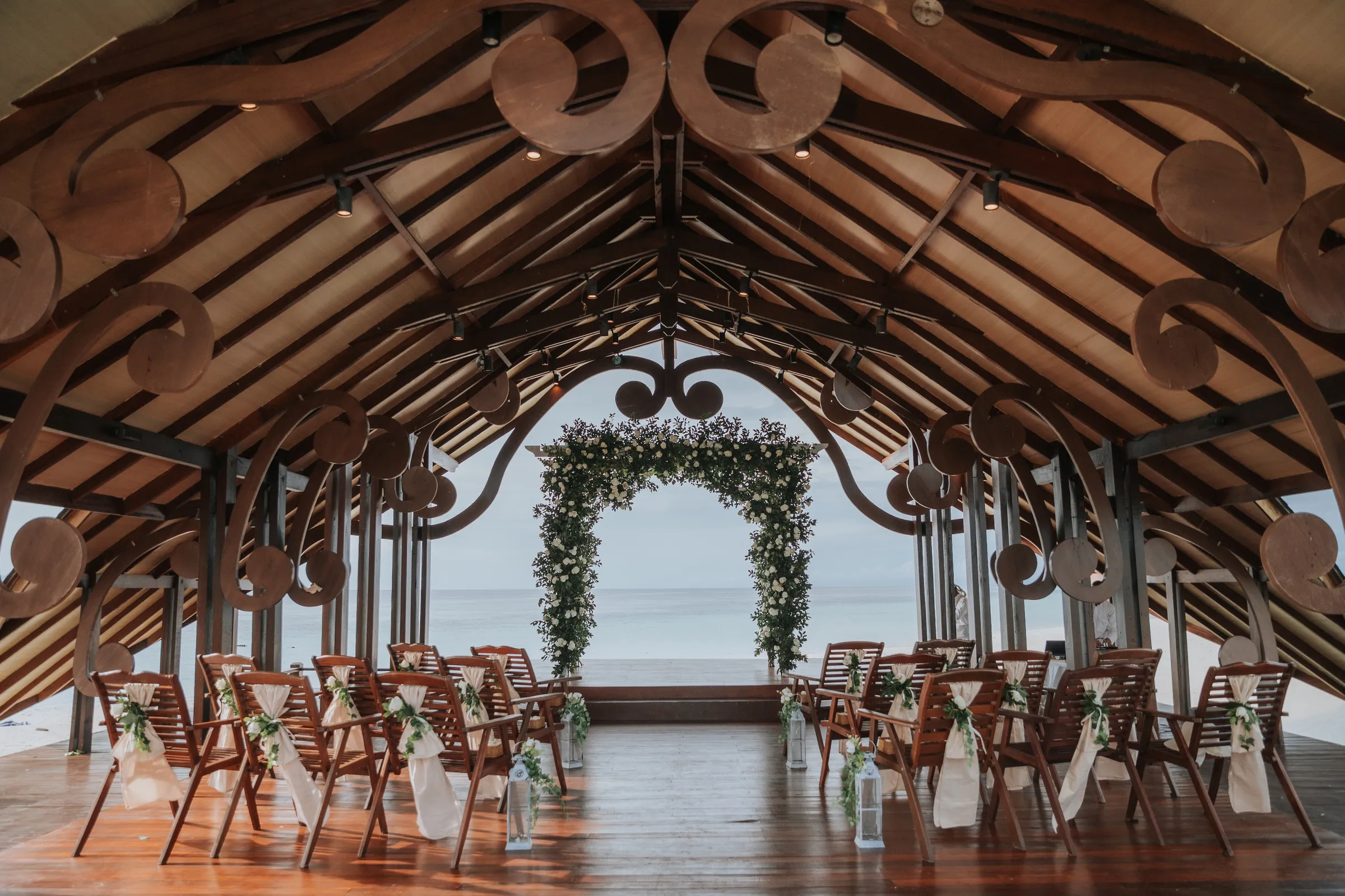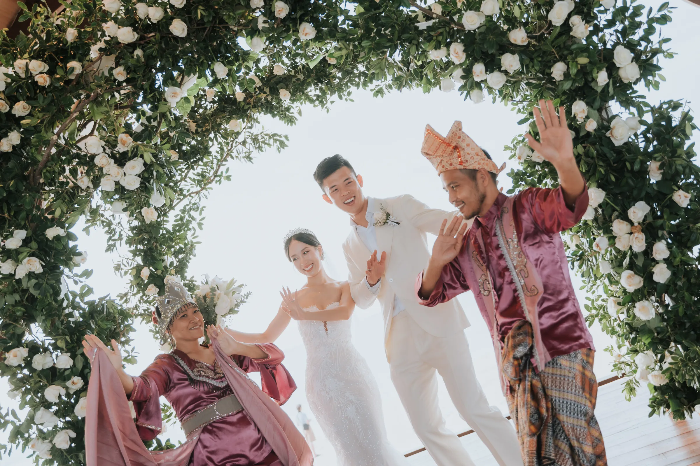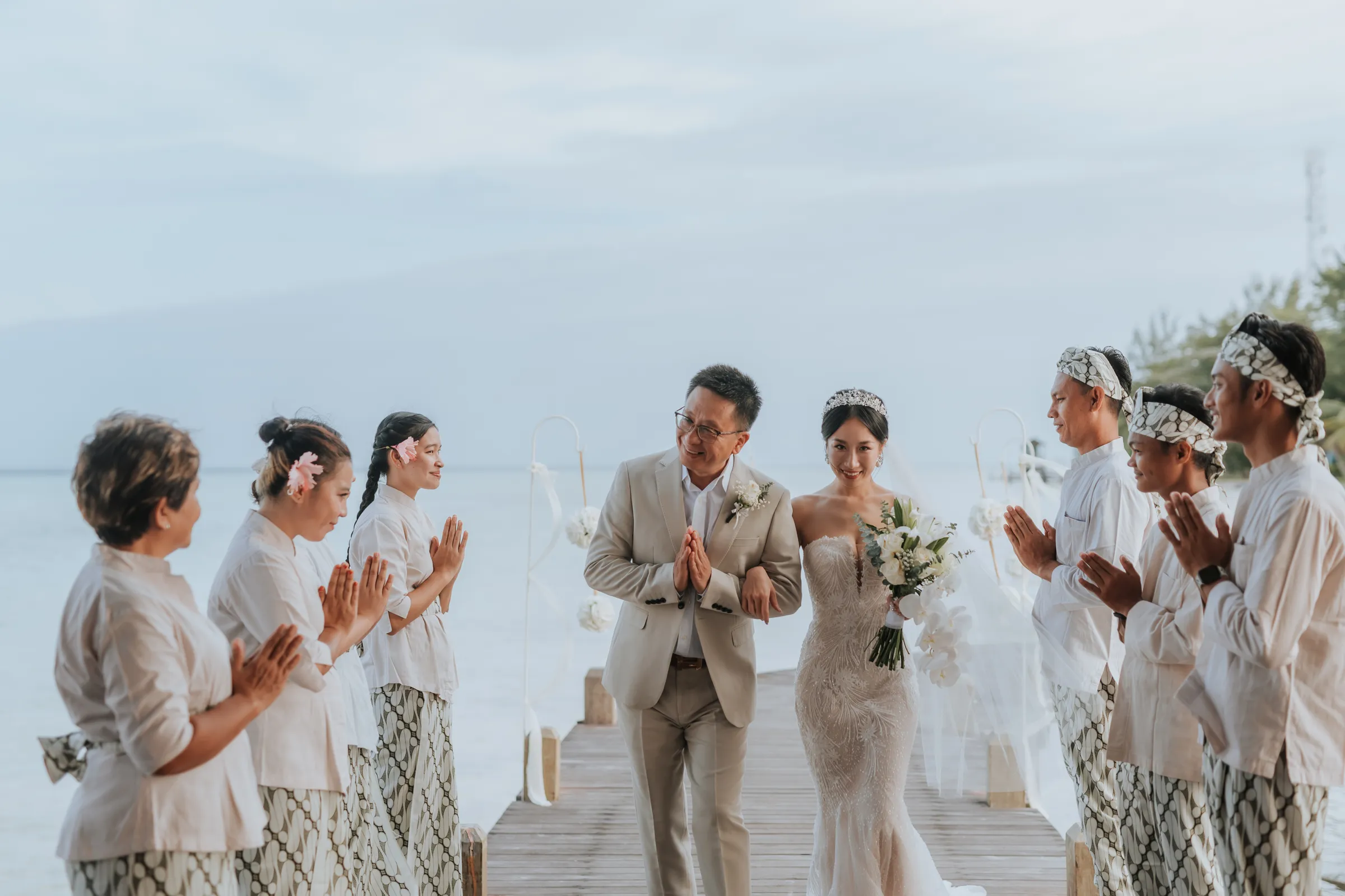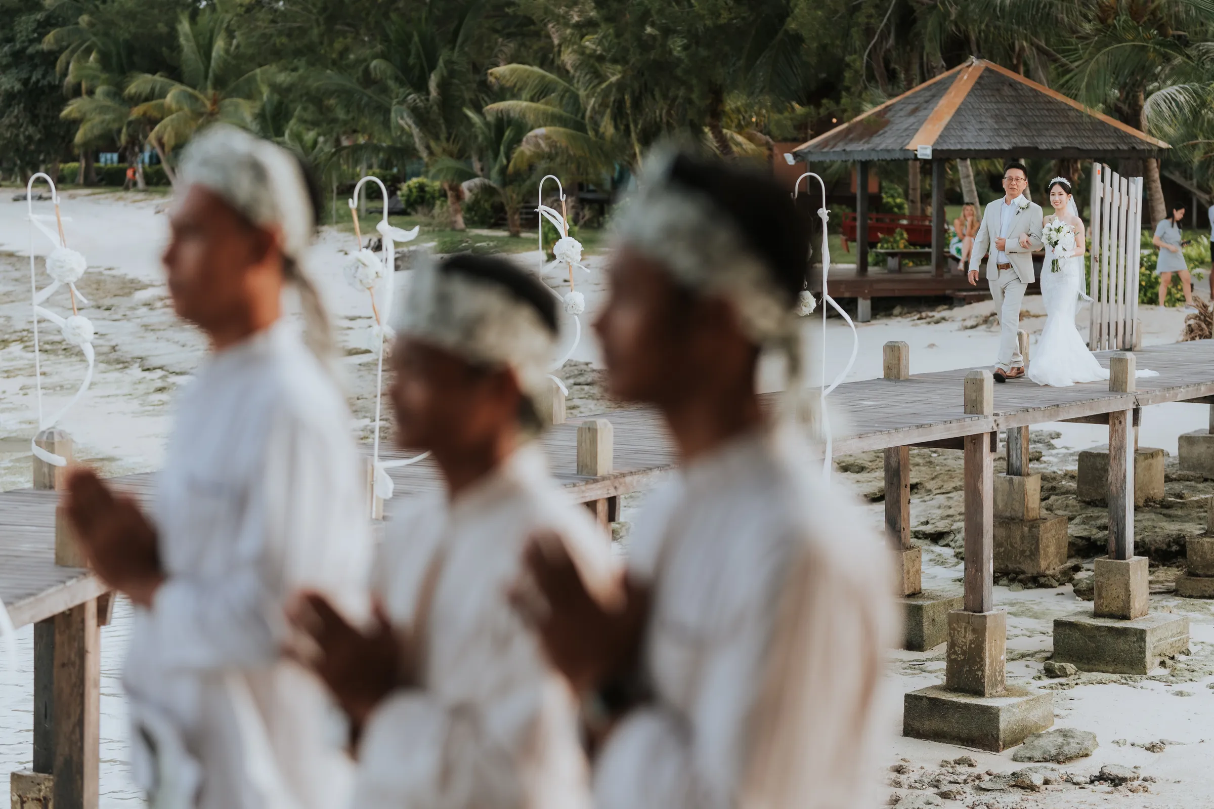 The promise chapel at Mataking Reef Resort was built in 2021, Austin and Sissi were only the 2nd couple to ever tie their knot there. Elegantly decorated with white roses and eucalyptus, the couple exchange heartfelt vows beneath the classic floral arch. As they walked back down the aisle together as husband and wife, hotel staff performed a local traditional love dance of blessing over the couple.