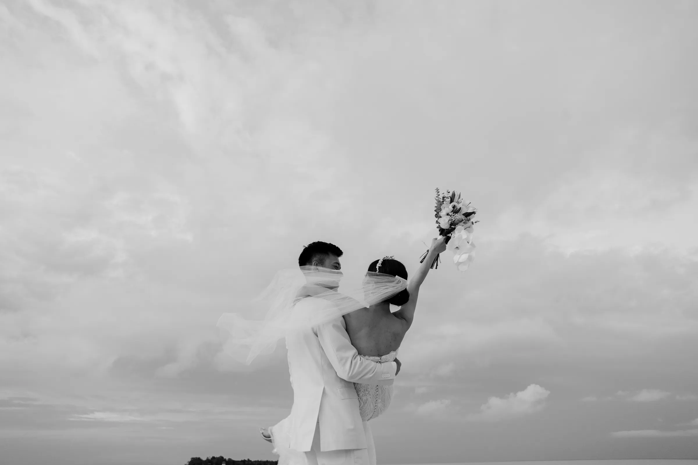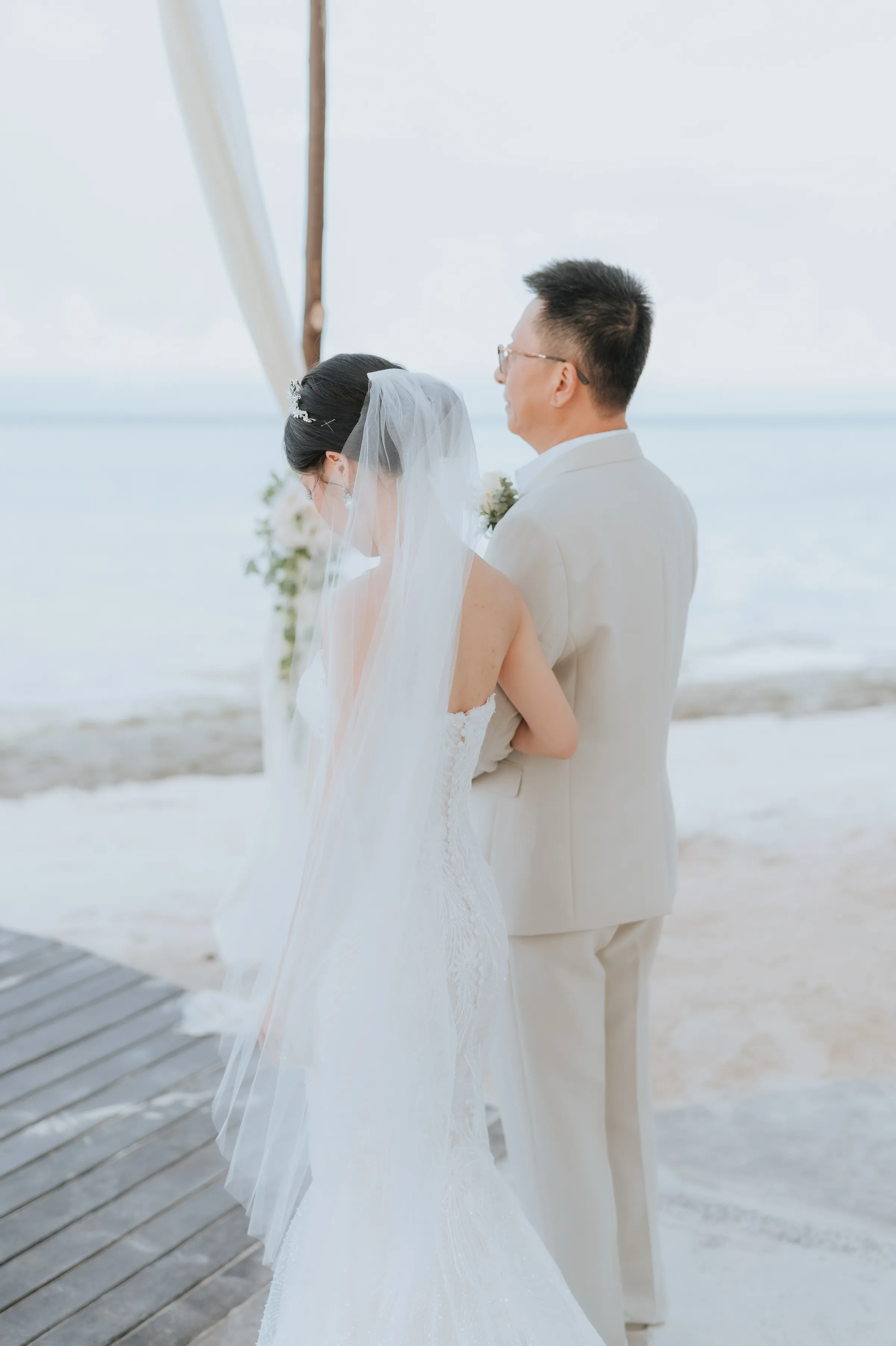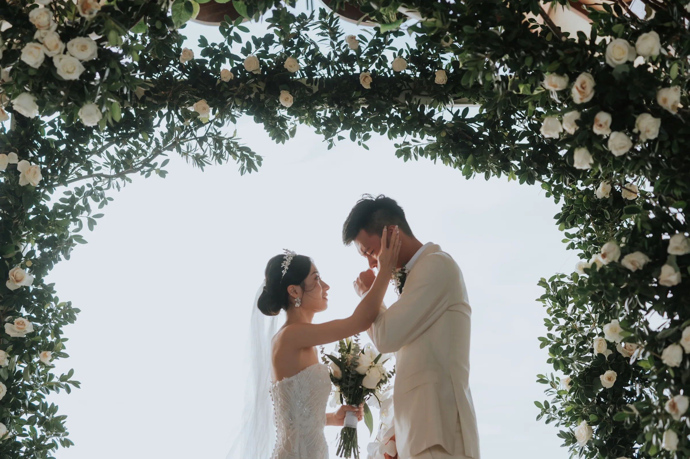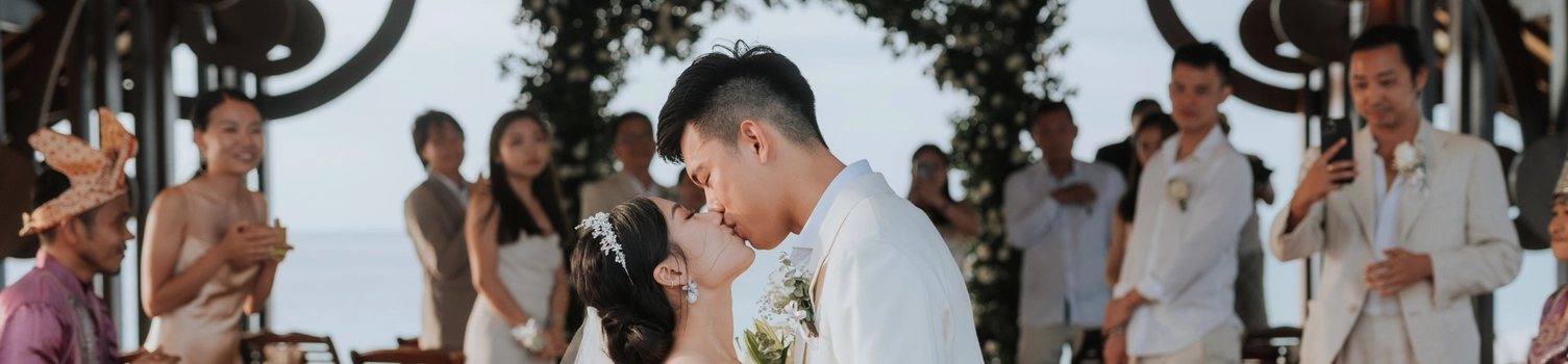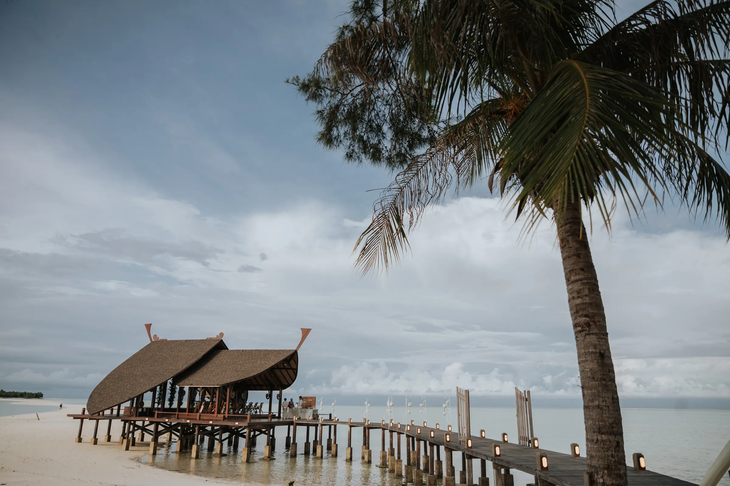 The promise chapel at Mataking Reef Resort was built in 2021, Austin and Sissi were only the 2nd couple to ever tie their knot there. Elegantly decorated with white roses and eucalyptus, the couple exchange heartfelt vows beneath the classic floral arch. As they walked back down the aisle together as husband and wife, hotel staff performed a local traditional love dance of blessing over the couple.