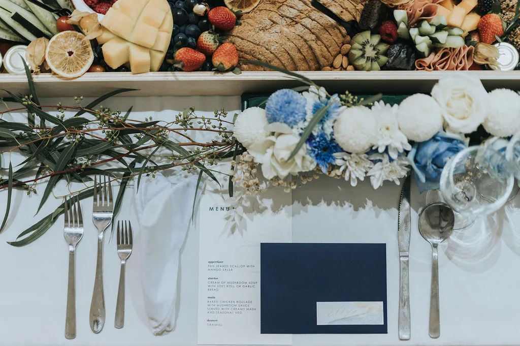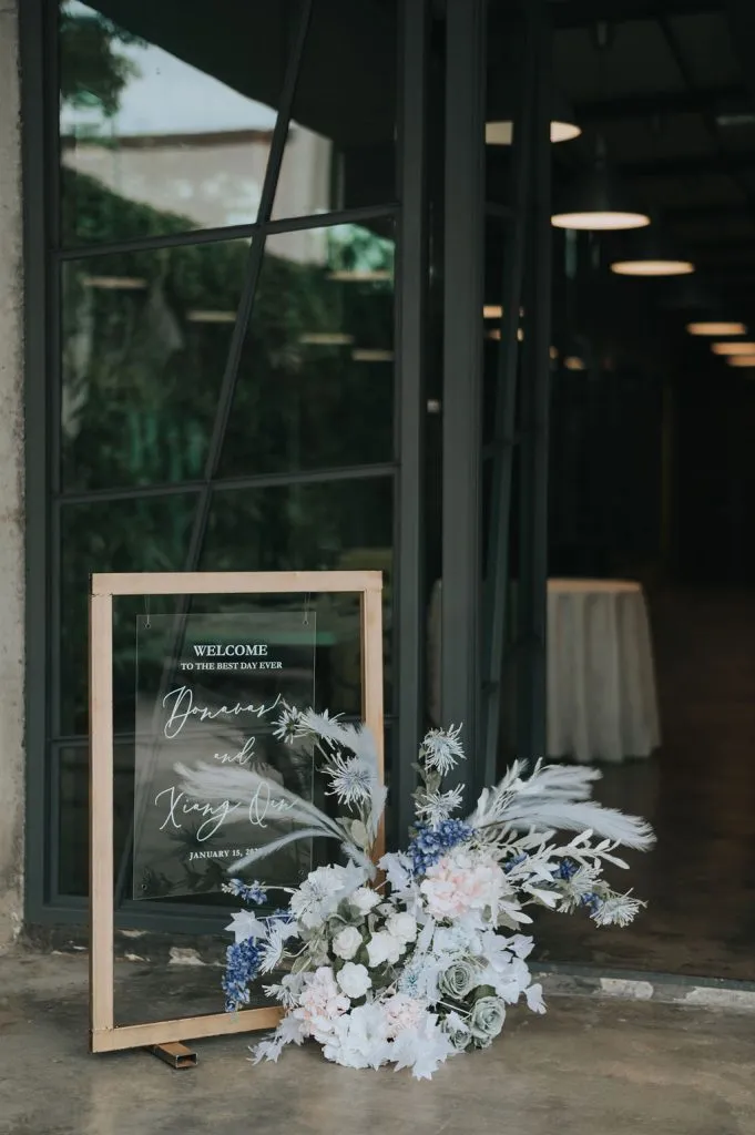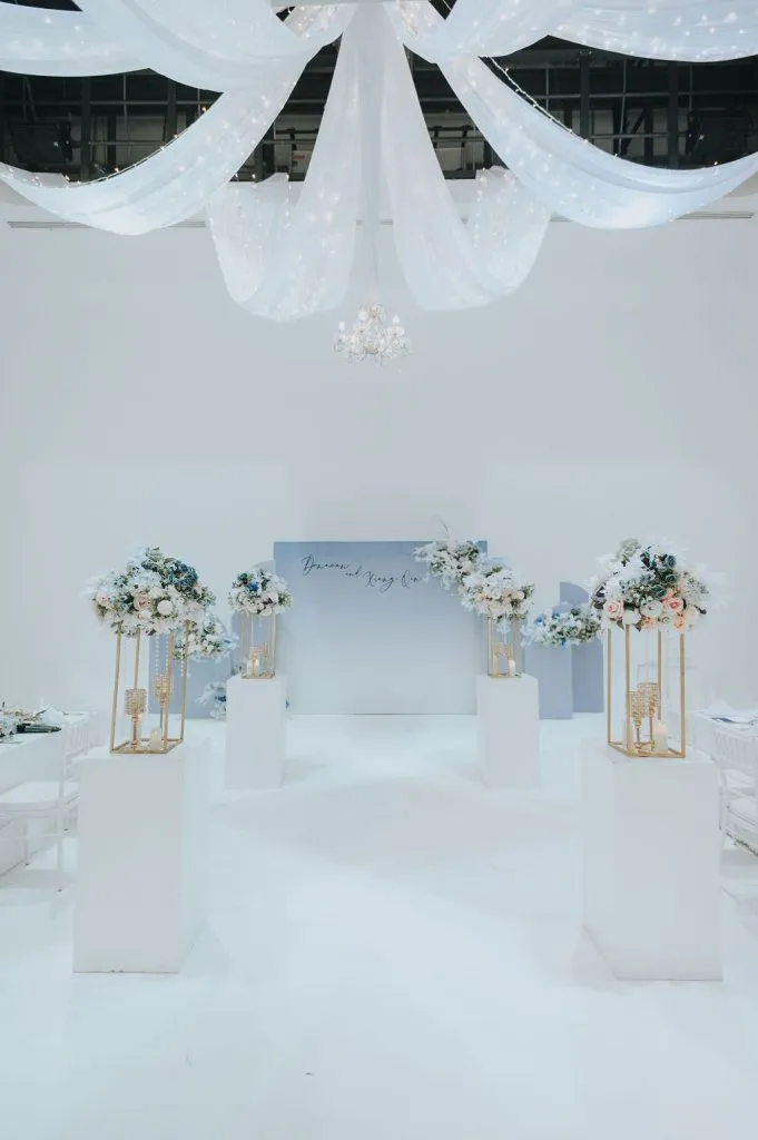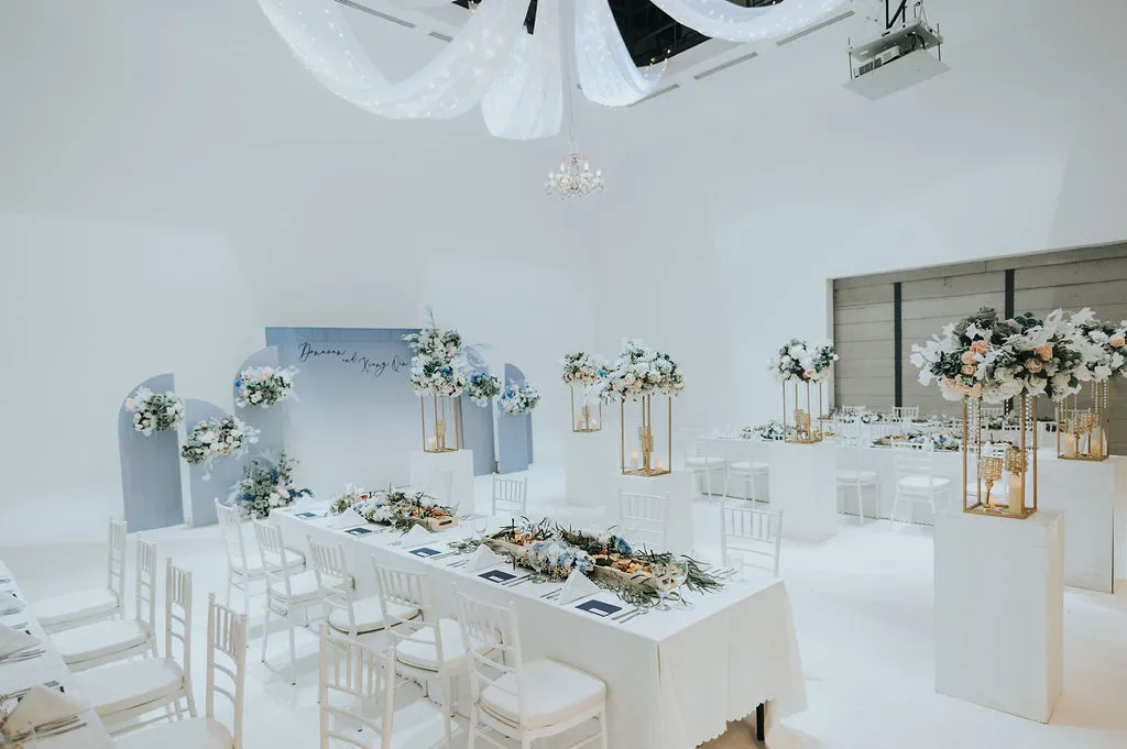 Most weddings at the Metal Bees Studio are held in the brick room. Unbeknownst to many, there are 4 rooms to choose from and this bride picked the raw room, an all white room serving as a blank canvas to highlight her dream of a blue themed wedding. Event Diaries nailed the brief and the decor was a sight for sore eyes. Floral installations and backdrops with scattered colours of sage, blue and white gradually blending from one hue to the other soften the jarring all-white facade yet maintain its art deco effect.