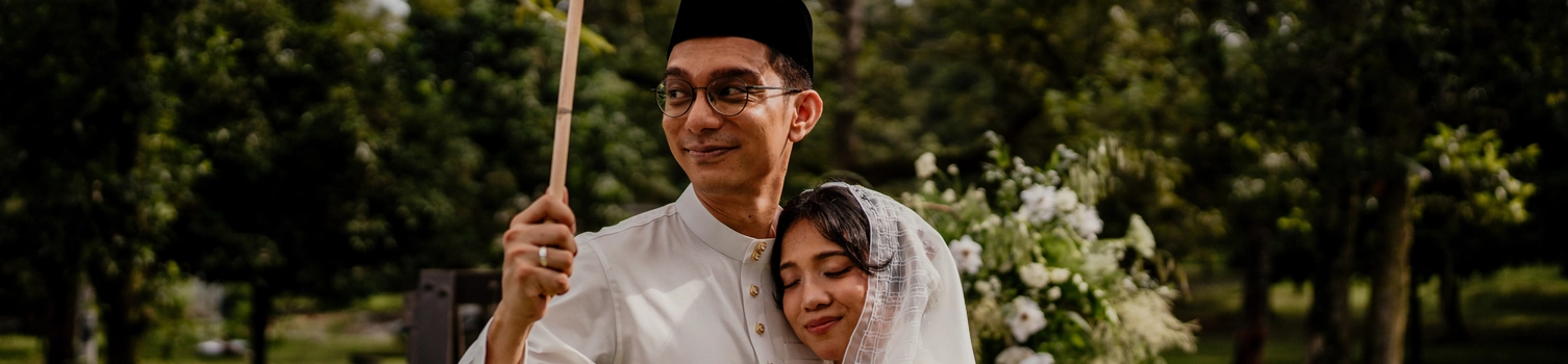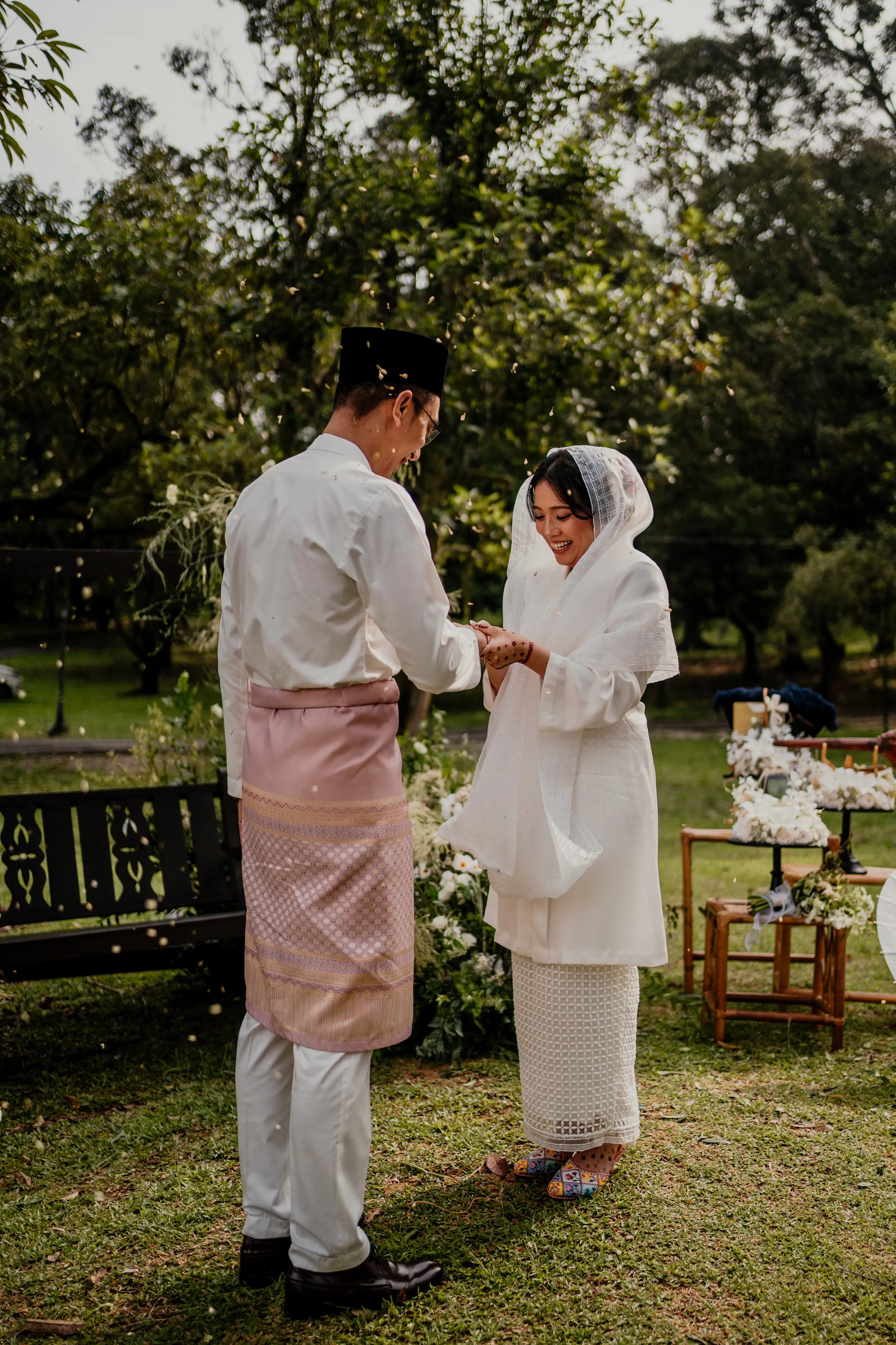 For their special day, Inas and Khairul embraced their Malay heritage during the morning Nikah ceremony, followed by 2 reception that were more relaxed, the first during lunch and the second at tea-time in the evening. The décor featured a soft and natural colour palette with a mix of white and green hues, emphasising freshness and simplicity. The overall theme was a harmonious blend of nature and tradition, creating a serene and picturesque backdrop for their celebration.