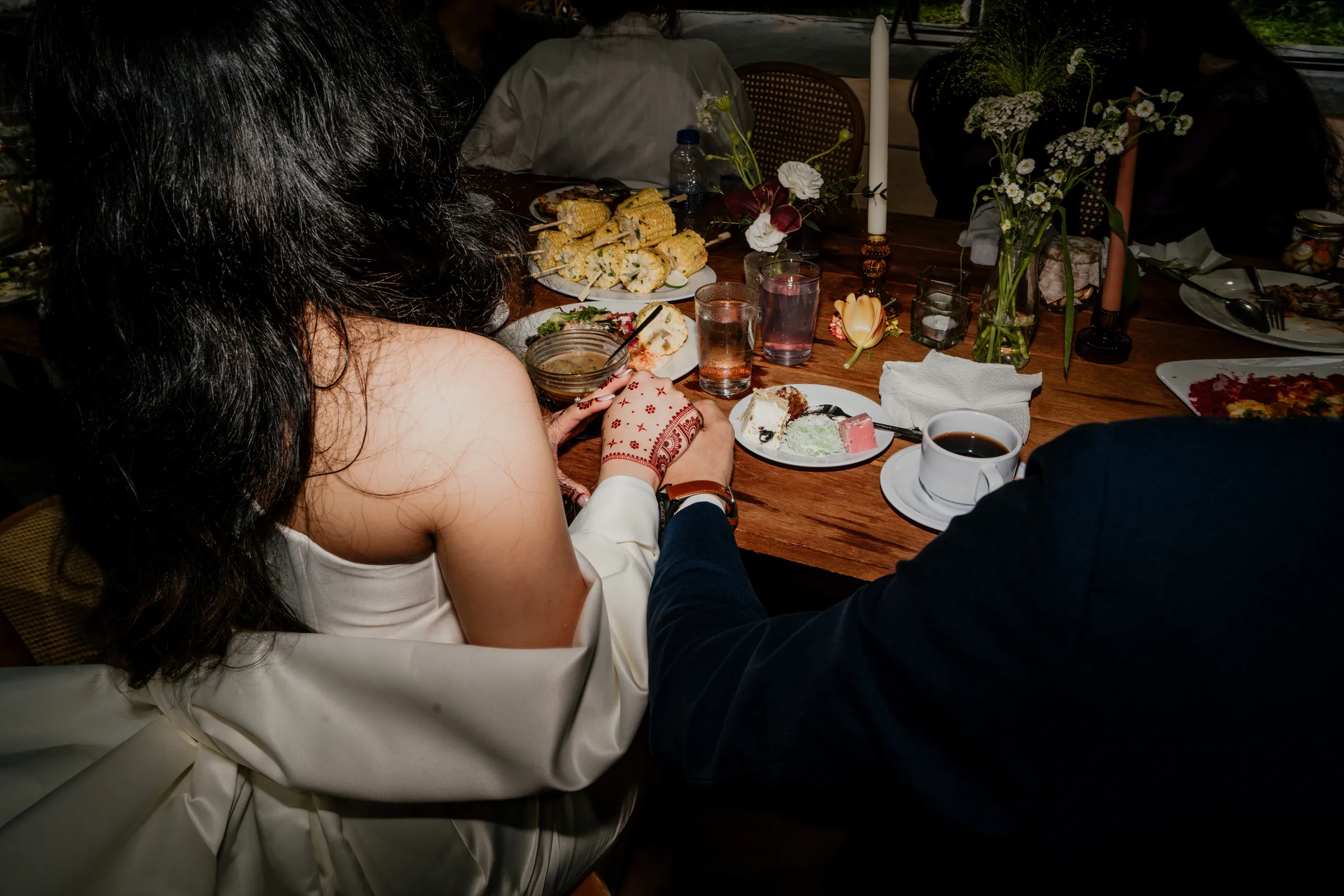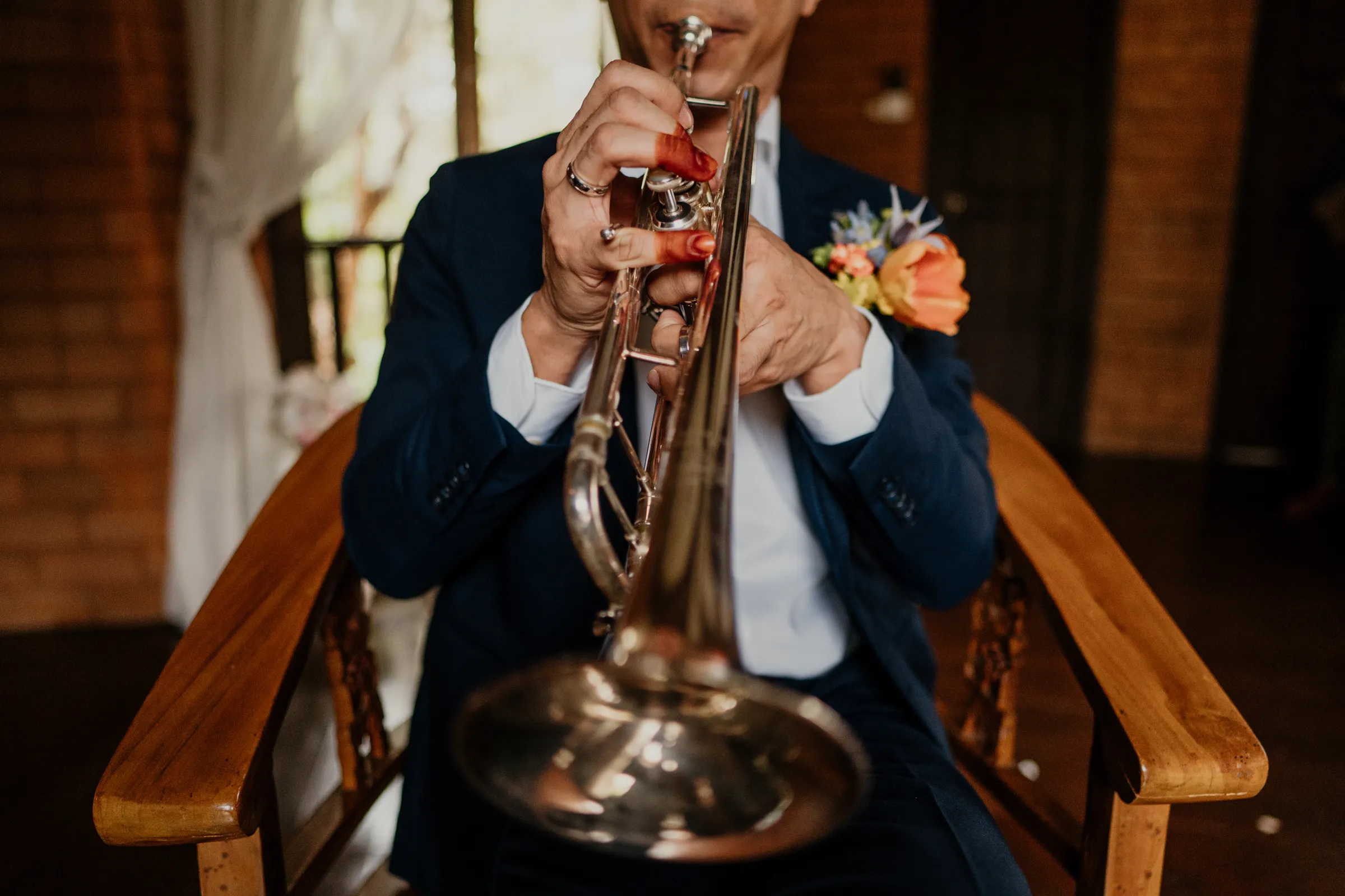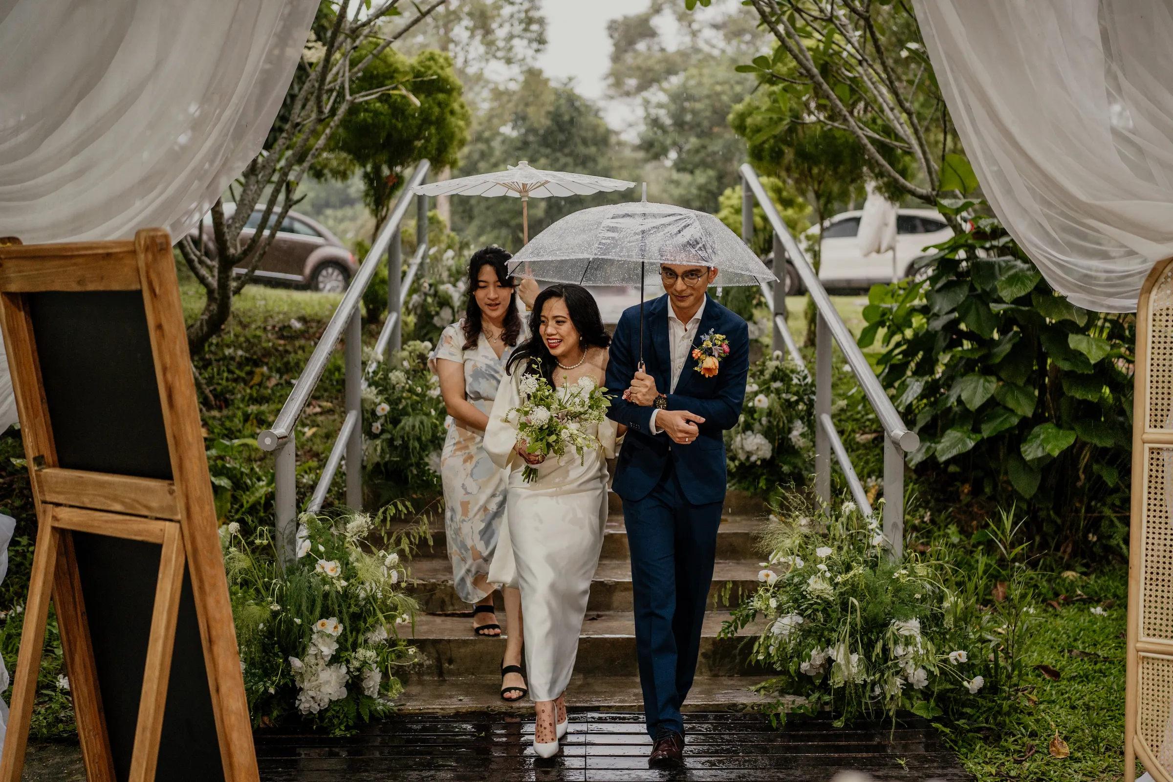 The tea-time reception began with a light drizzle, adding to the enchanting ambiance. Khairul’s best friend, Russell, took on the role of MC, ensuring the event ran smoothly. One of the highlights was a guitar-trumpet duo performance of “Getaran Jiwa” by P Ramlee, performed by Rizal and Khairul, paying homage to how this couple’s story began. The evening continued with a delicious spread by The Supper Club, heartfelt speeches from family, and musical performances by their friends Lewy, Russell, and Rizal.