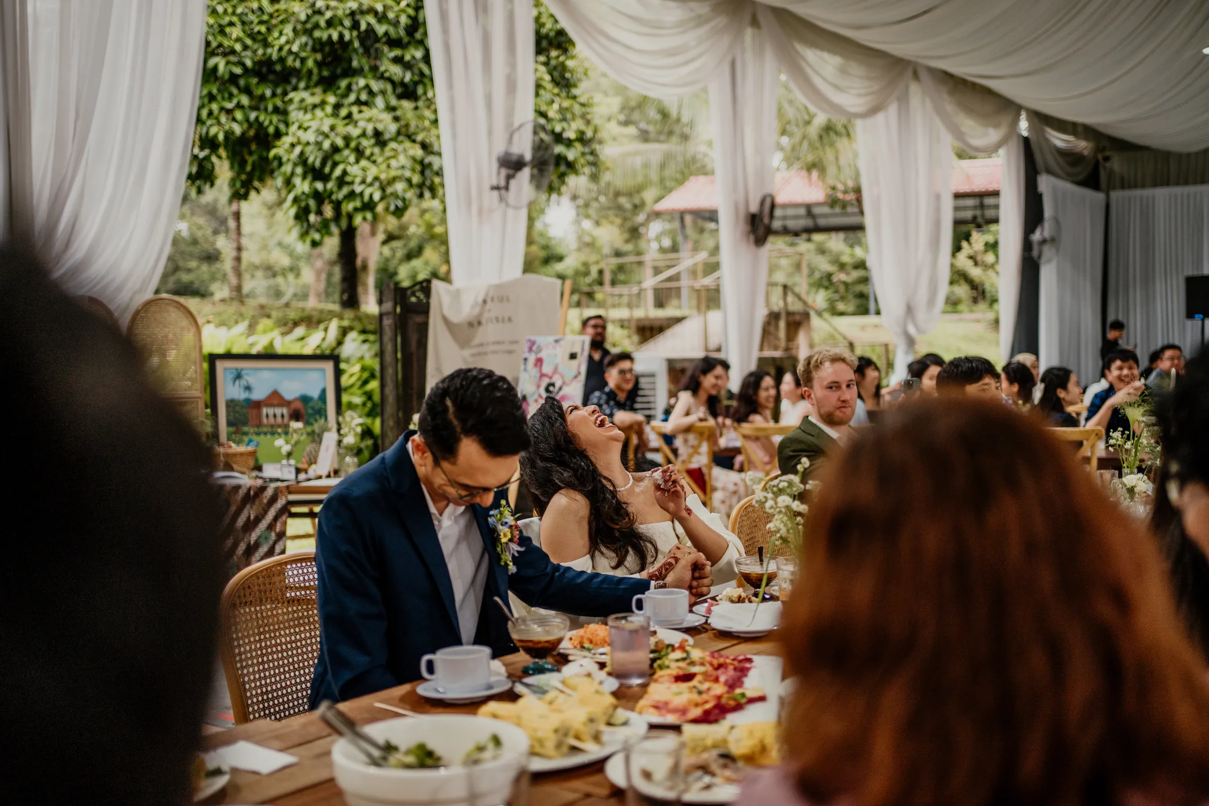 The day began with a beautiful Akad Nikah ceremony attended by their close family members. The weather seemed uncertain, but just as the ceremony started, the skies cleared, and sunshine, along with butterflies, blessed their union. It was a magical moment that set the tone for the rest of the day. After the Nikah, a lunchtime celebration followed. Inas’s sister, Irani, performed the Silat Dance with her friend, Hani, which moved Inas to tears. The soothing sounds of the Gamelan, creating a deeply cultural and heartfelt atmosphere throughout.