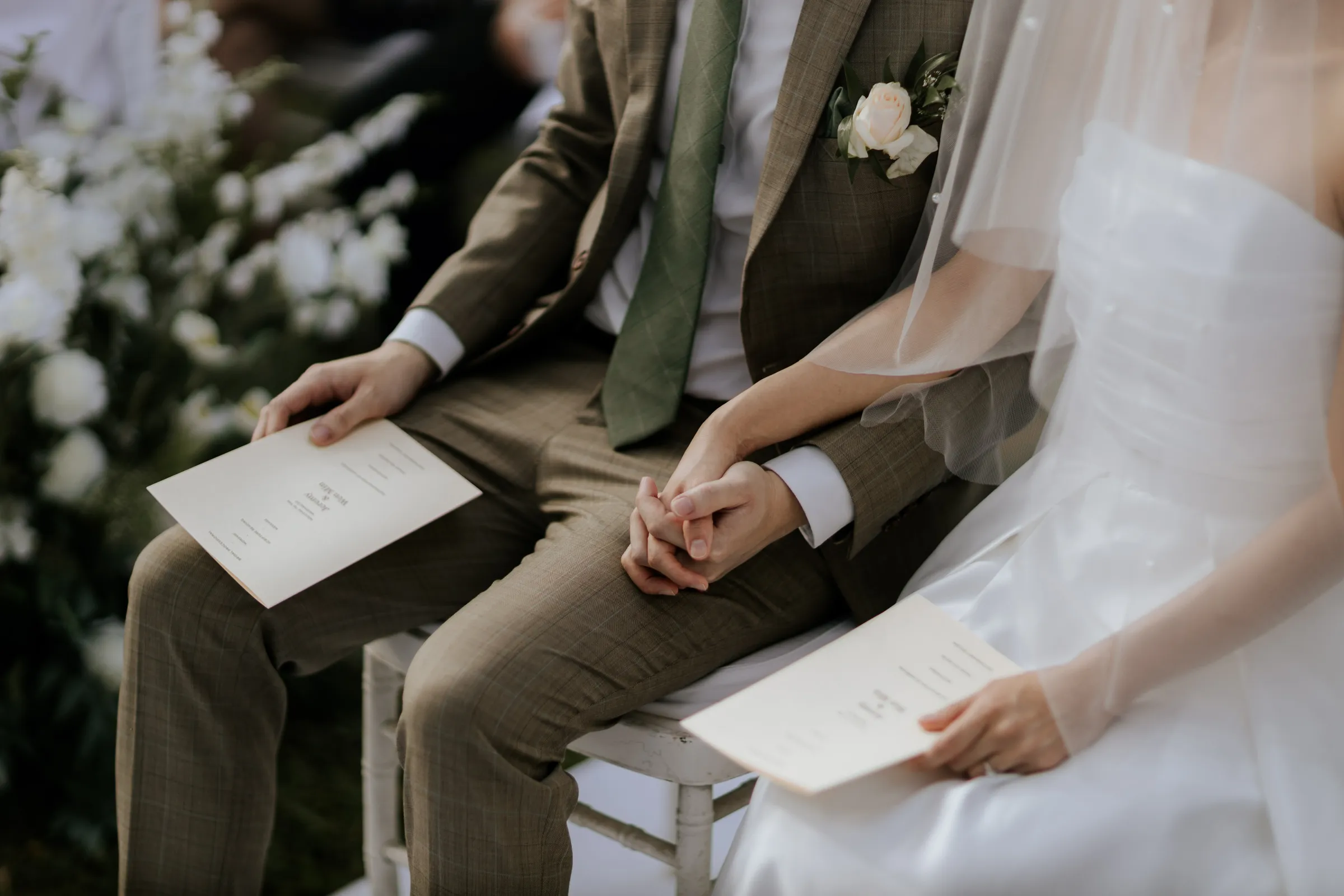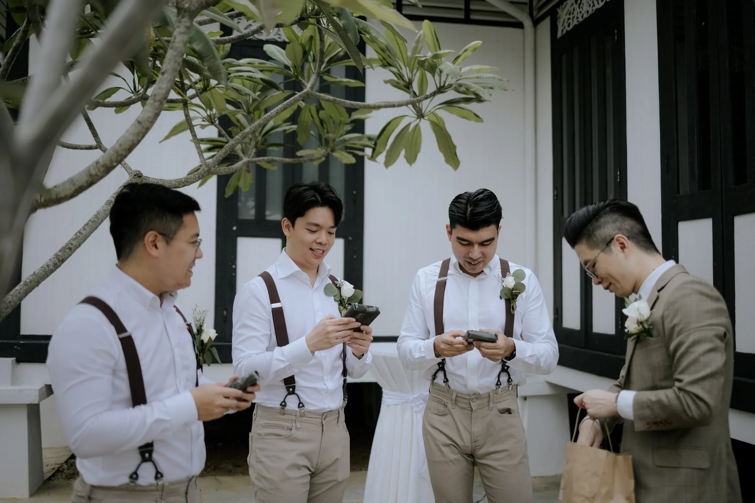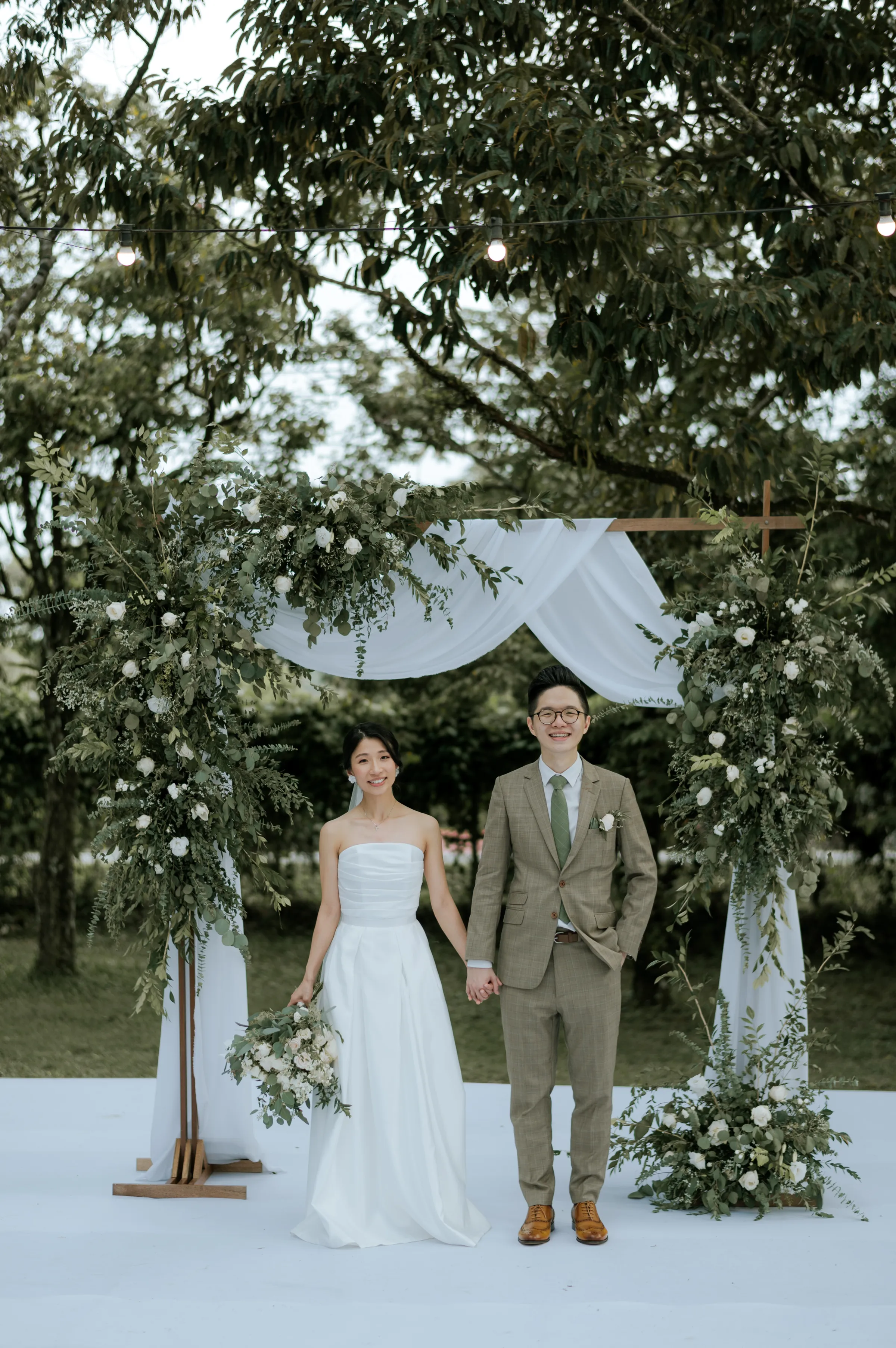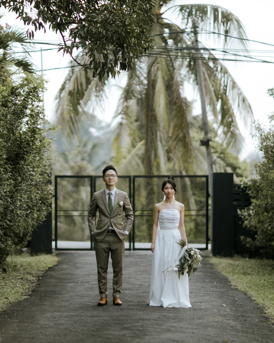 Synchronising their outfits, the bride wore a tailored-fit minimalist tube dress that complemented her lean figure perfectly. She completed her look with a custom-made a veil dotted with fresh pearls. Jeremy on the other hand, donned a complementary suit from 19th Stitch. “I only had to describe that my wedding will be done outdoor, and the put together the entire look for me, which I found to be perfect,” the groom explained. He wore a tailored-made suit in a unique tone in between a shade of olive green-brown, paired with a tie with a shade of army green.