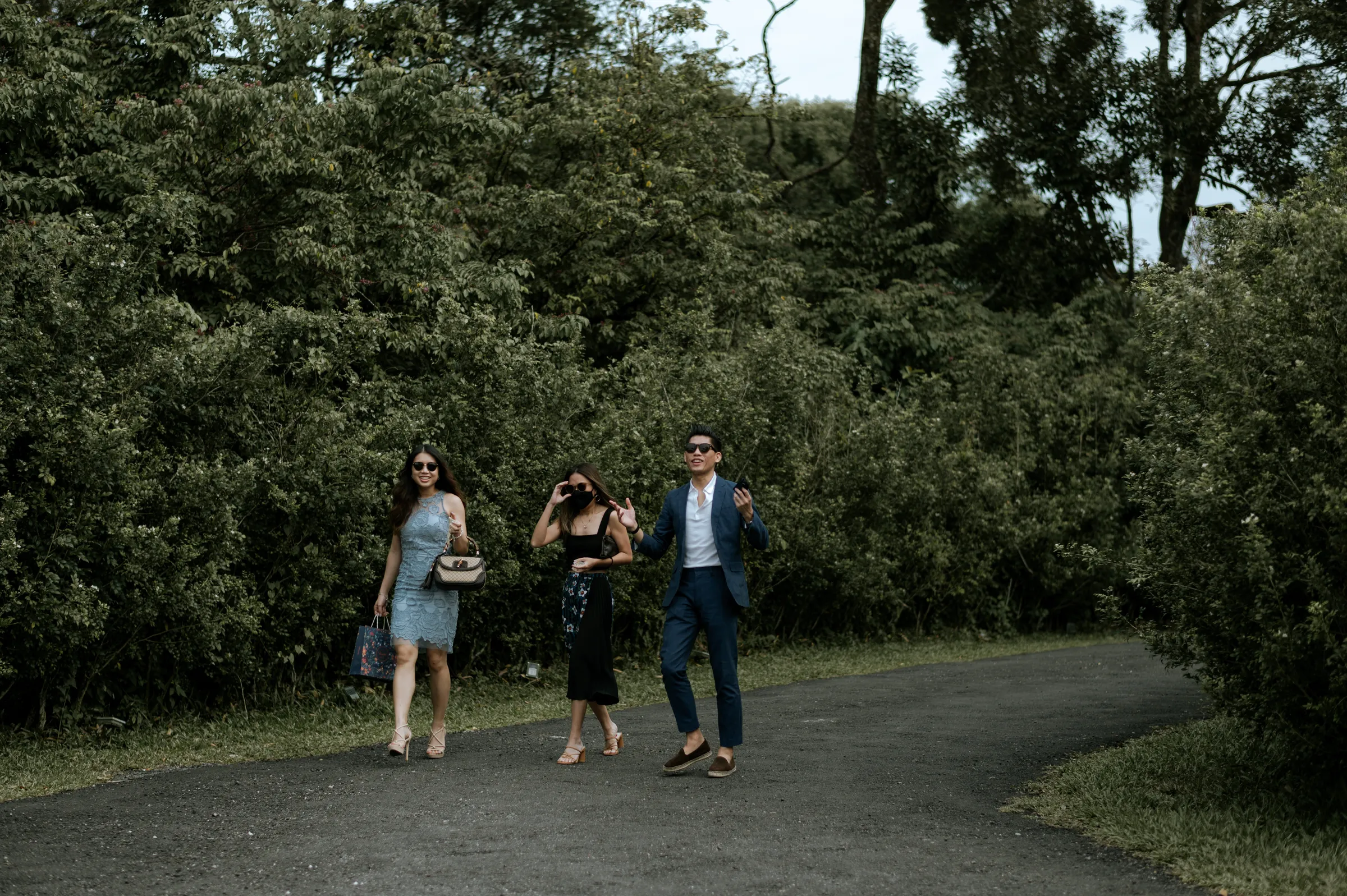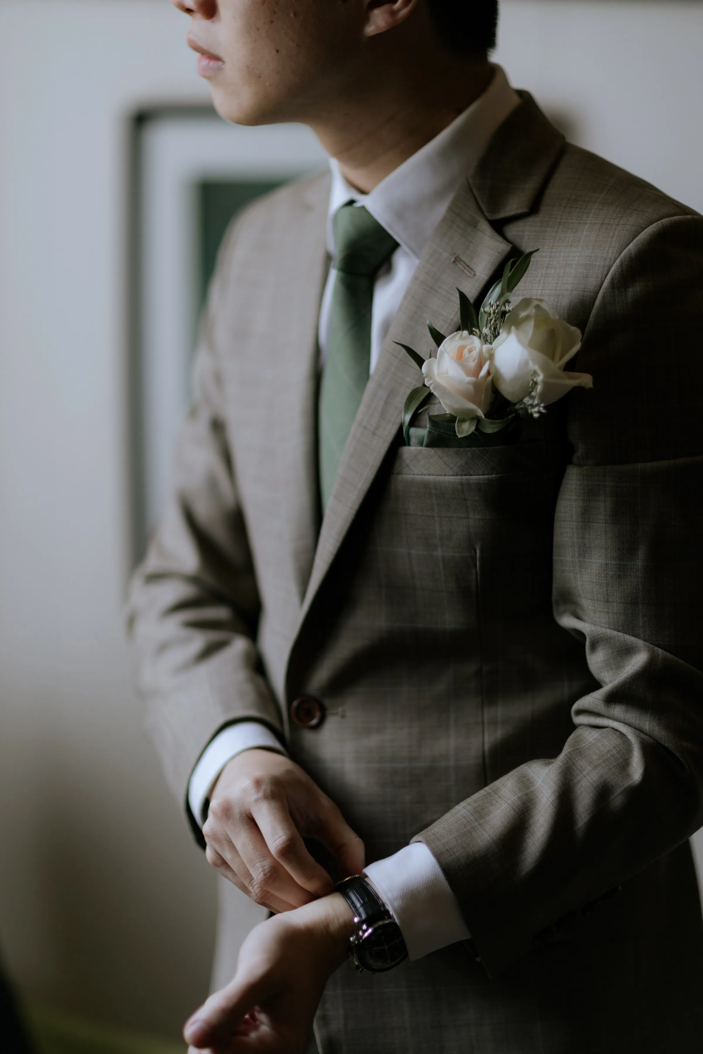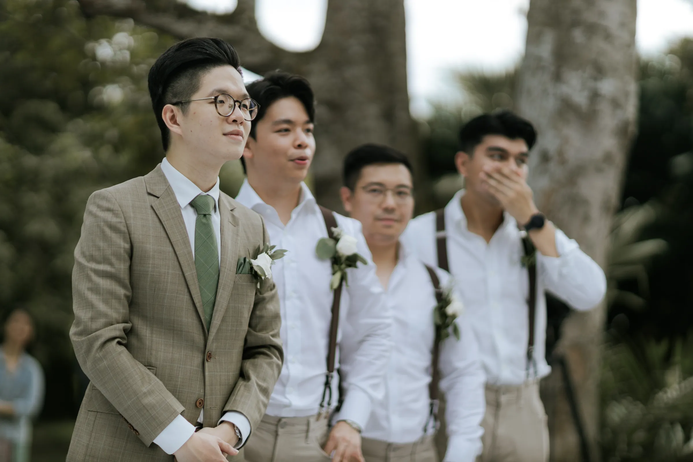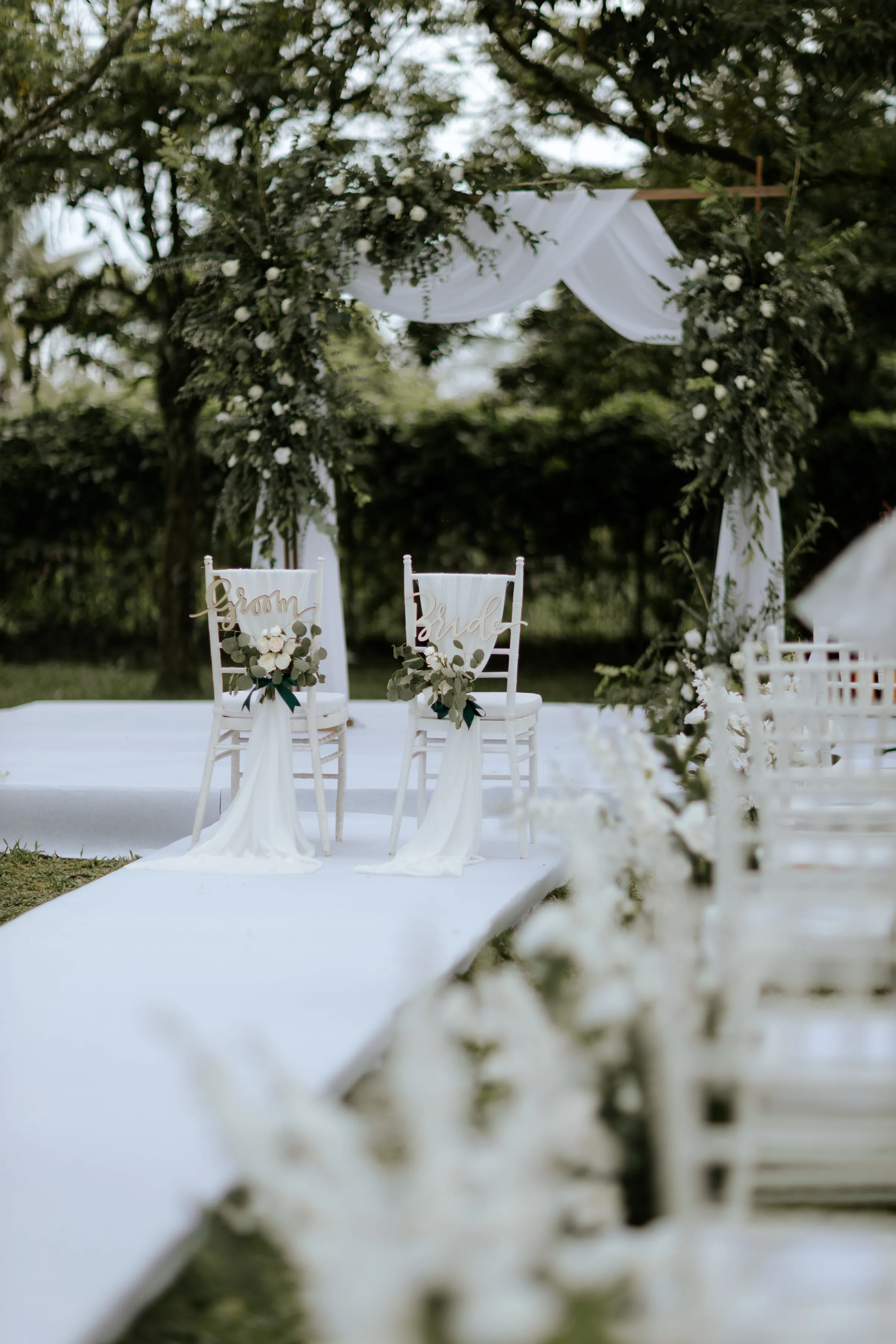 Synchronising their outfits, the bride wore a tailored-fit minimalist tube dress that complemented her lean figure perfectly. She completed her look with a custom-made a veil dotted with fresh pearls. Jeremy on the other hand, donned a complementary suit from 19th Stitch. “I only had to describe that my wedding will be done outdoor, and the put together the entire look for me, which I found to be perfect,” the groom explained. He wore a tailored-made suit in a unique tone in between a shade of olive green-brown, paired with a tie with a shade of army green.