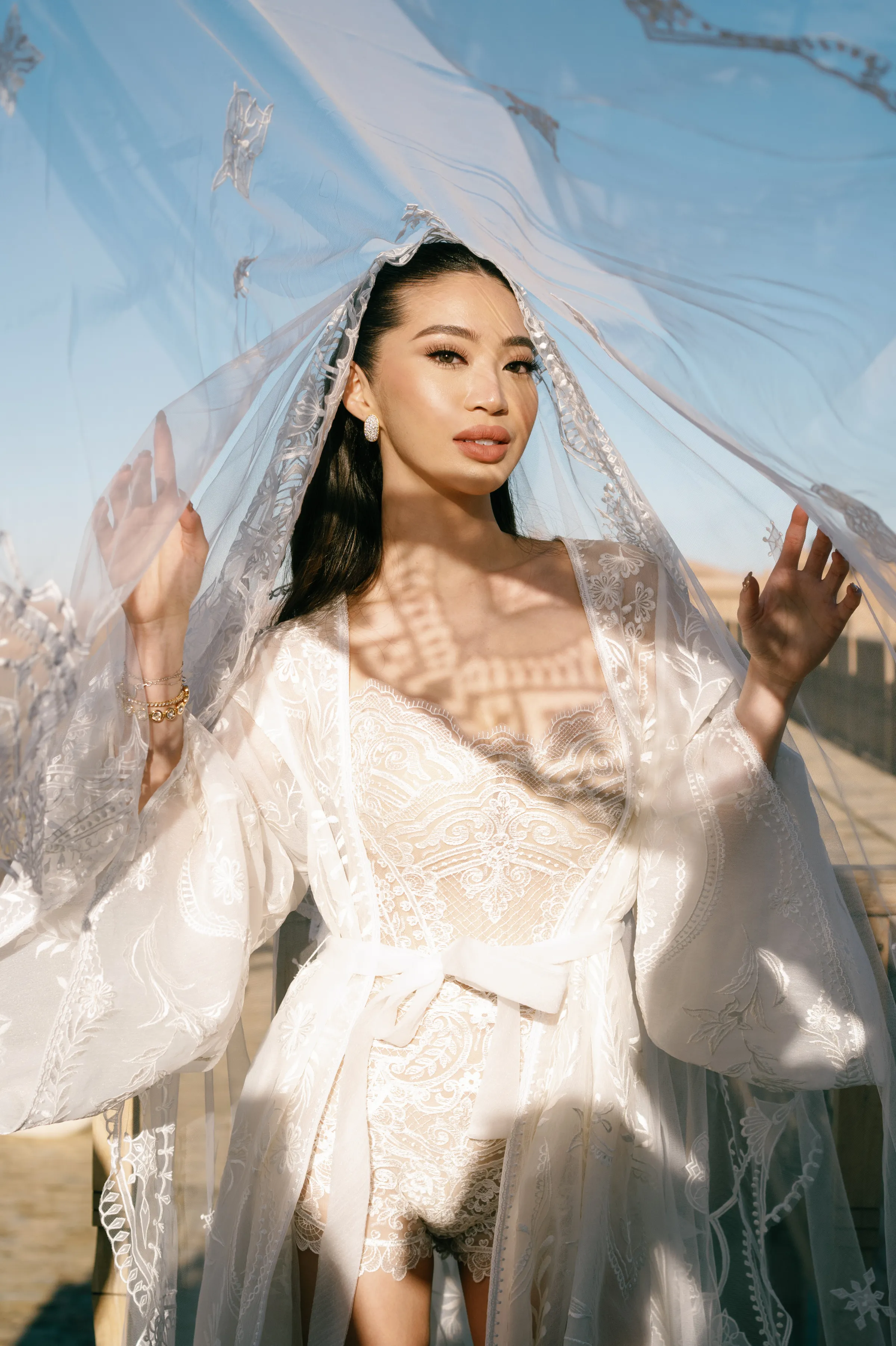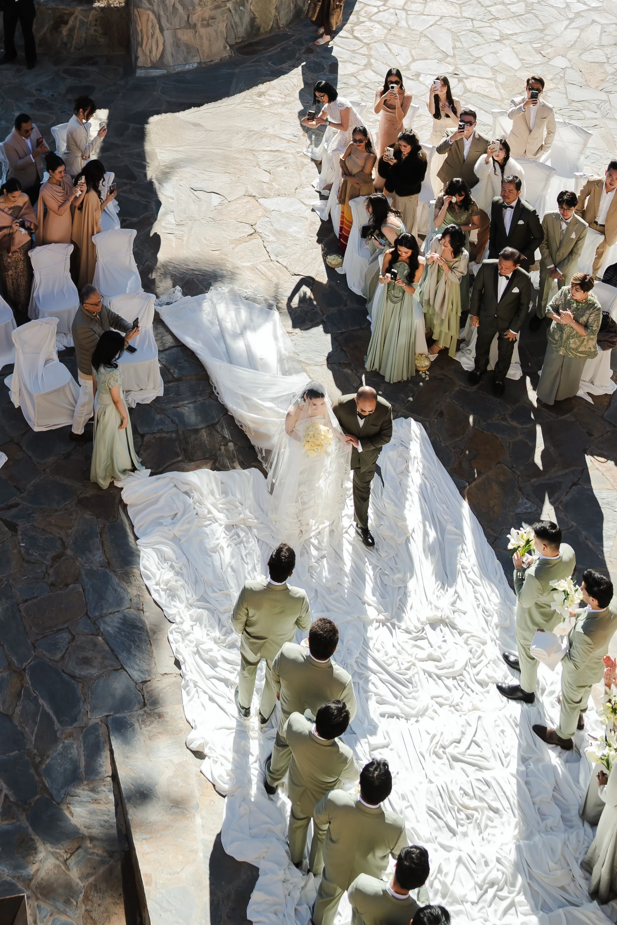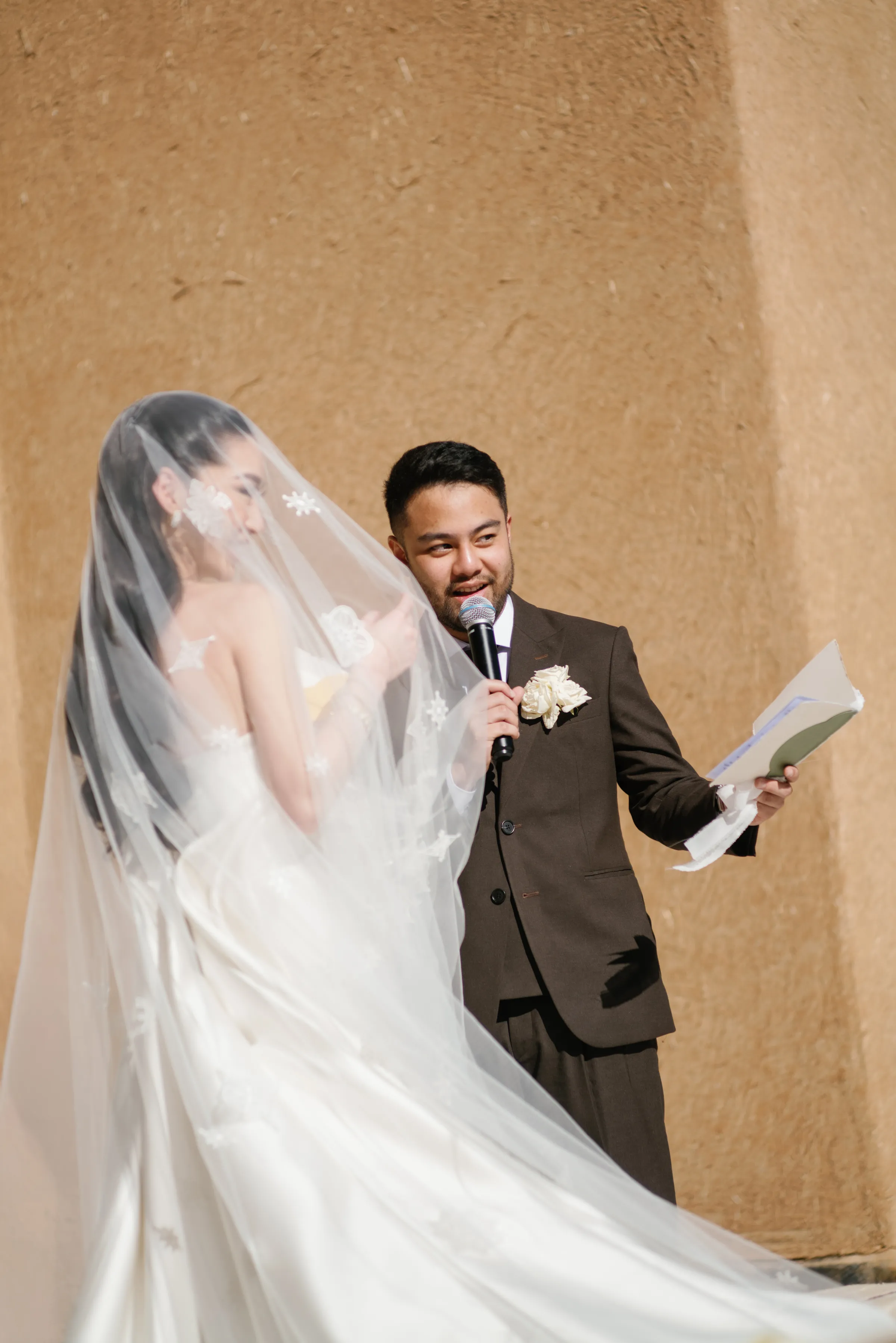 For the ceremony, Angie embodied timeless elegance in a structured satin wedding gown paired with a long, ethereal veil adorned with lace appliqué details that framed her face and flowed gracefully in the desert breeze. The soft, romantic silhouette complemented the golden landscape surrounding the venue.