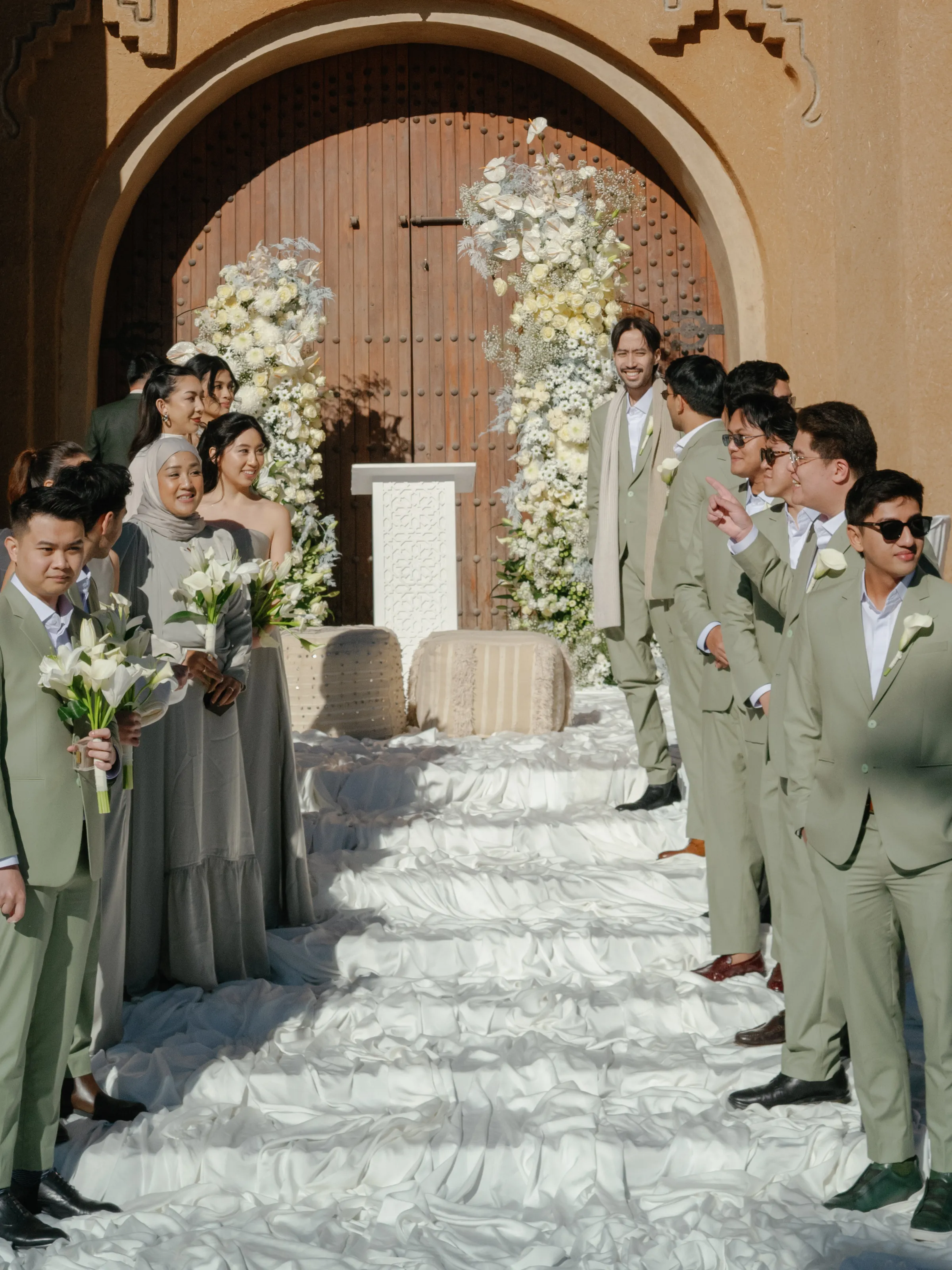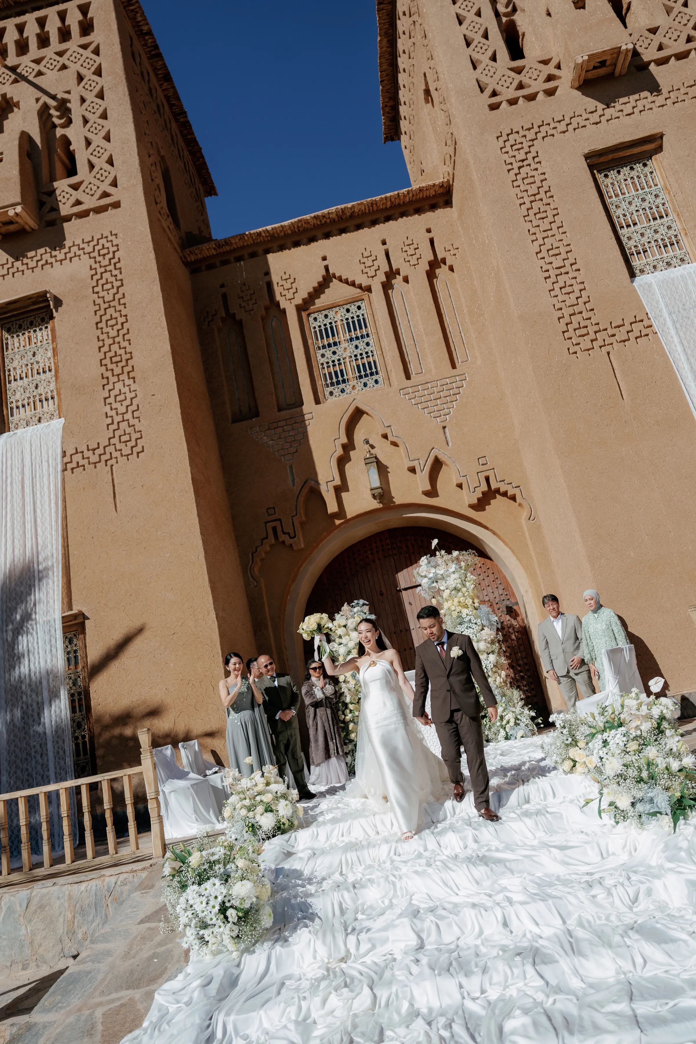 The ceremony venue reflected Marrakech’s architectural heritage, with a sand-toned structure featuring traditional Moroccan design elements. A grand floral arch composed of cascading white flowers framed the altar, while a textured white aisle runner created a soft, romantic contrast against the stone courtyard.