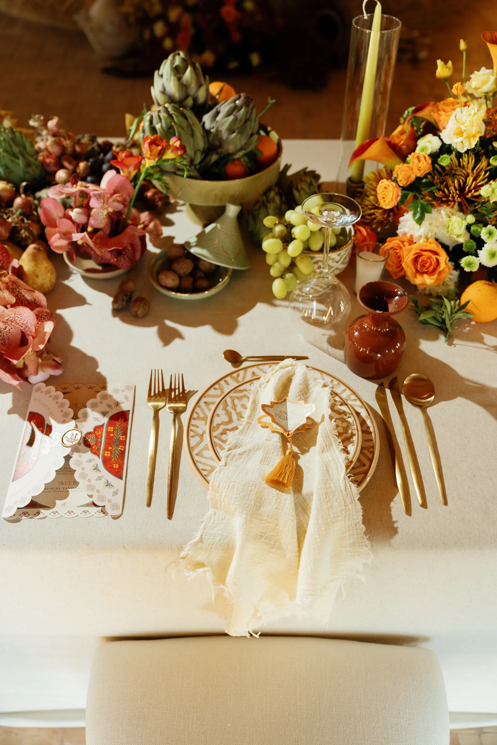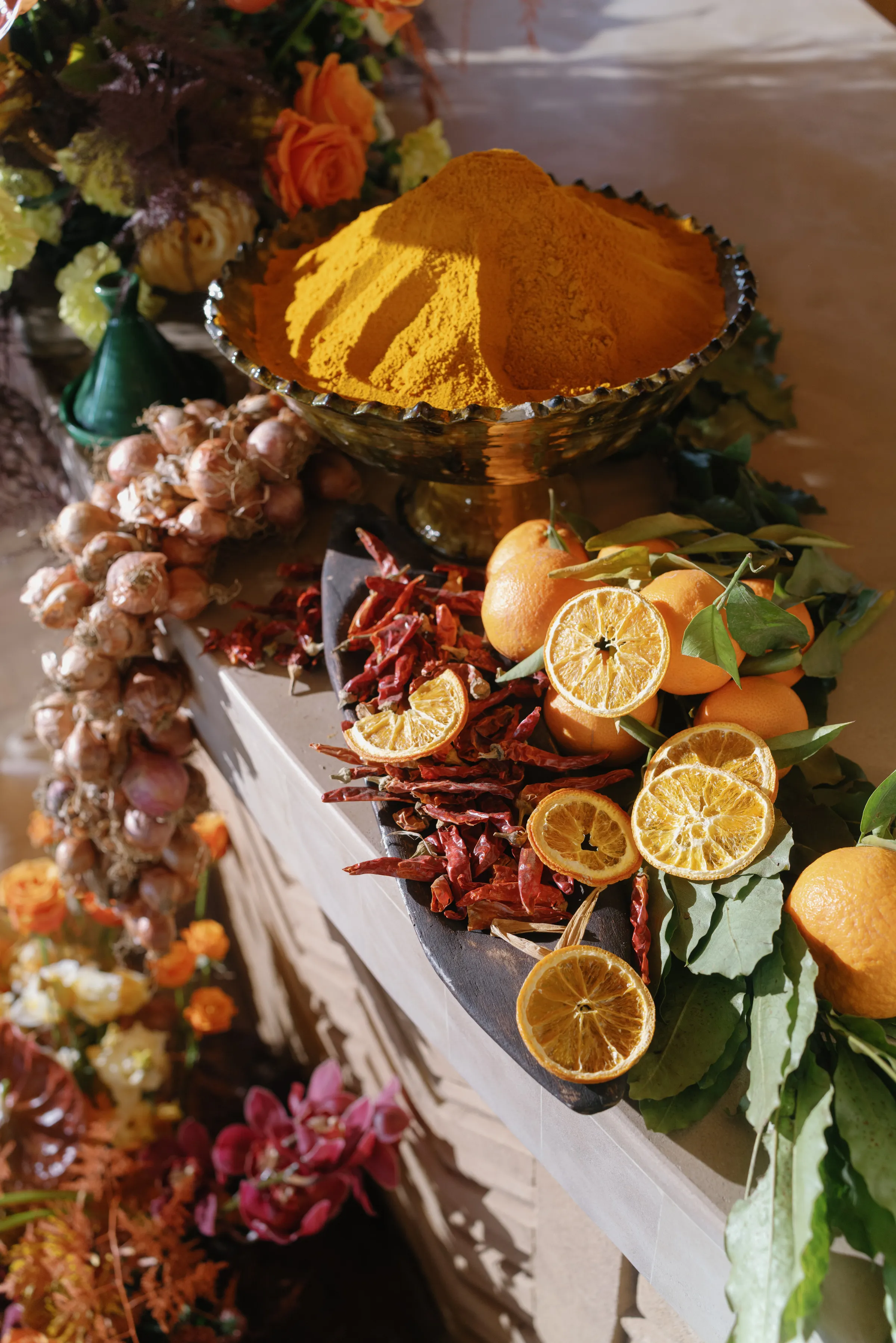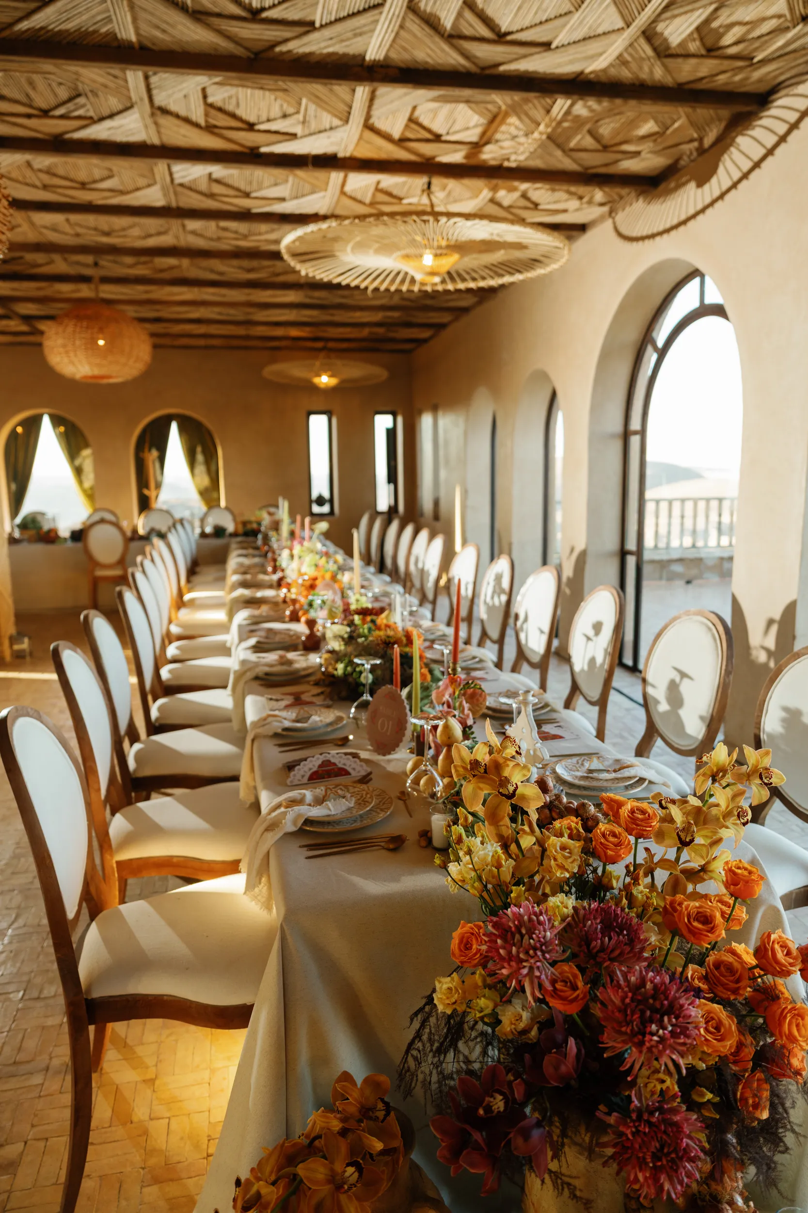 As evening approached, guests were welcomed to a long dinner table bathed in golden sunset light. The reception tables were adorned with warm-toned florals—burnt orange roses, deep rust chrysanthemums, golden orchids, and textured foliage—arranged in lush centerpieces that echoed the colors of local spice markets. Accentuated further by brass lanterns above the bar, woven textures and natural fiber, rich terracotta and spice tones. These details brought the inspiration of Moroccan spice markets to life, creating an immersive environment filled with warmth and sensory richness.