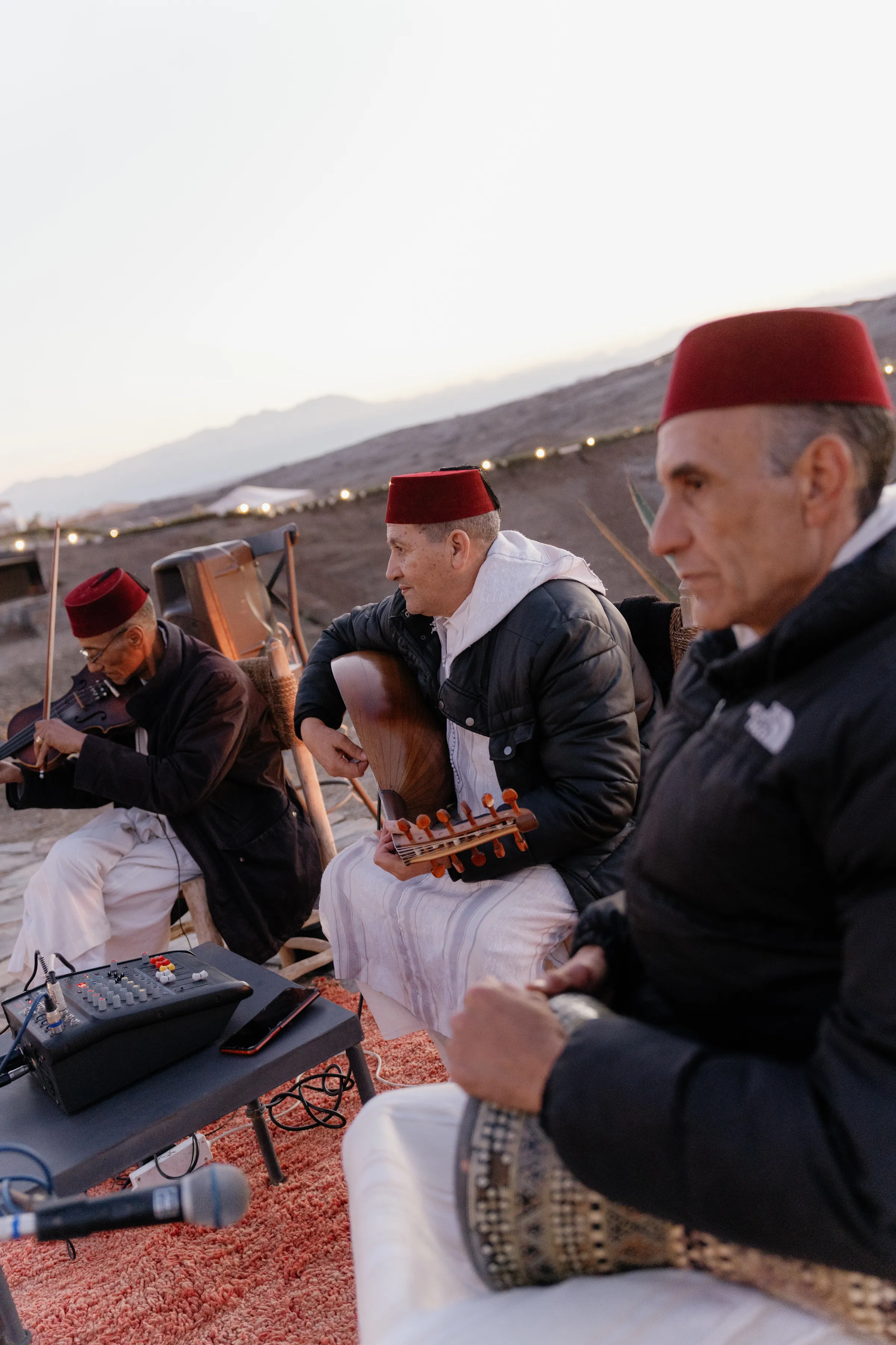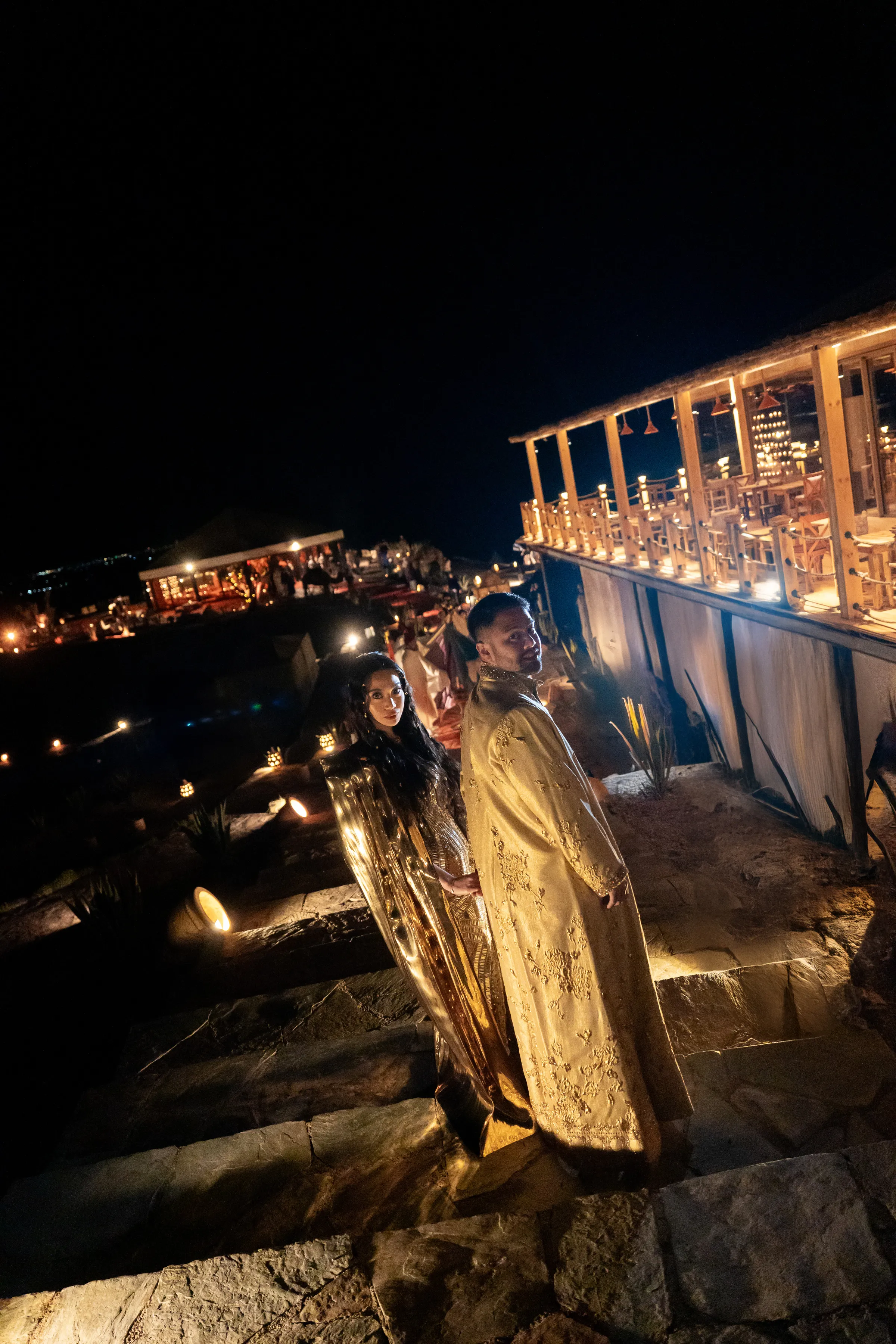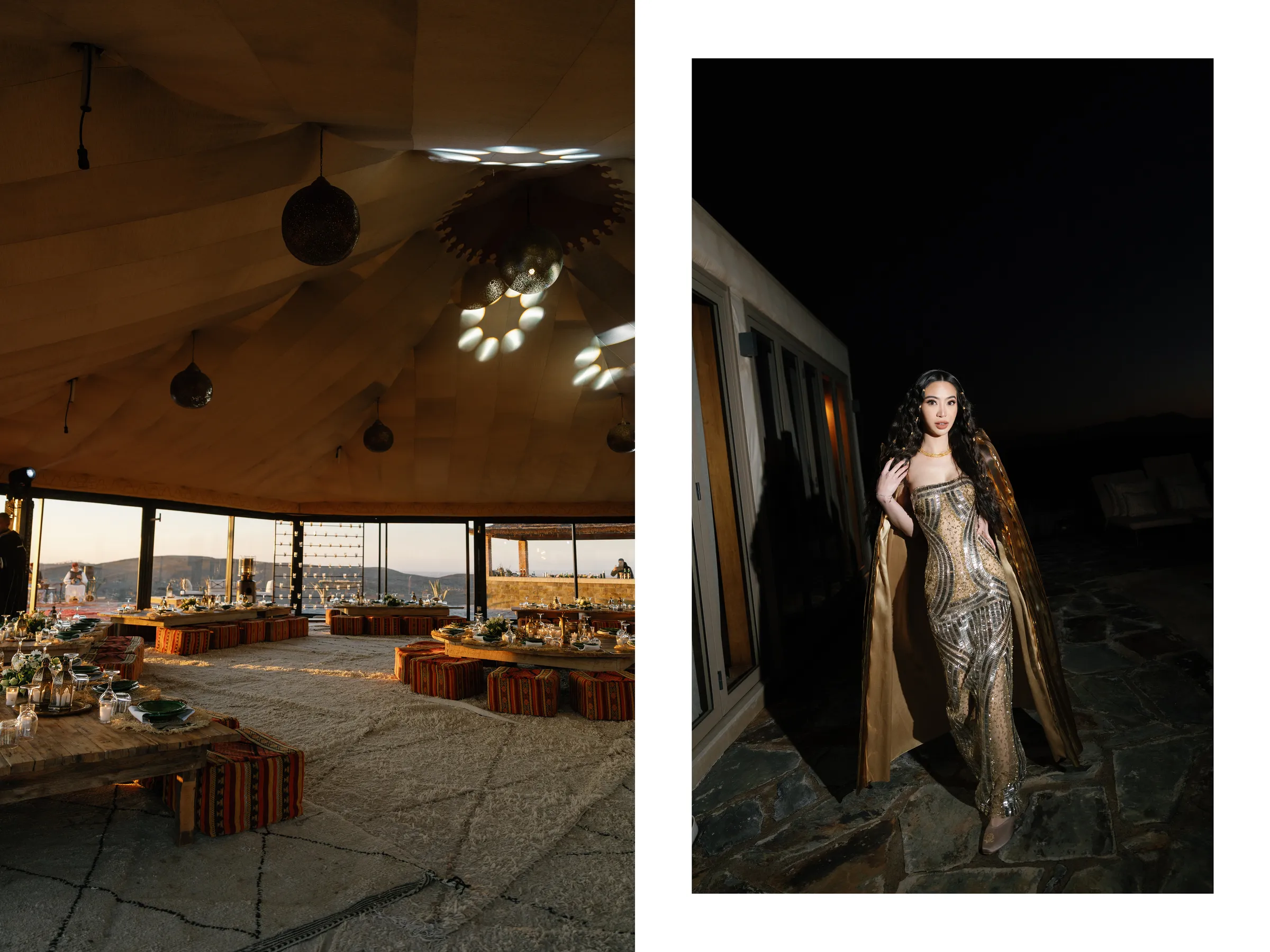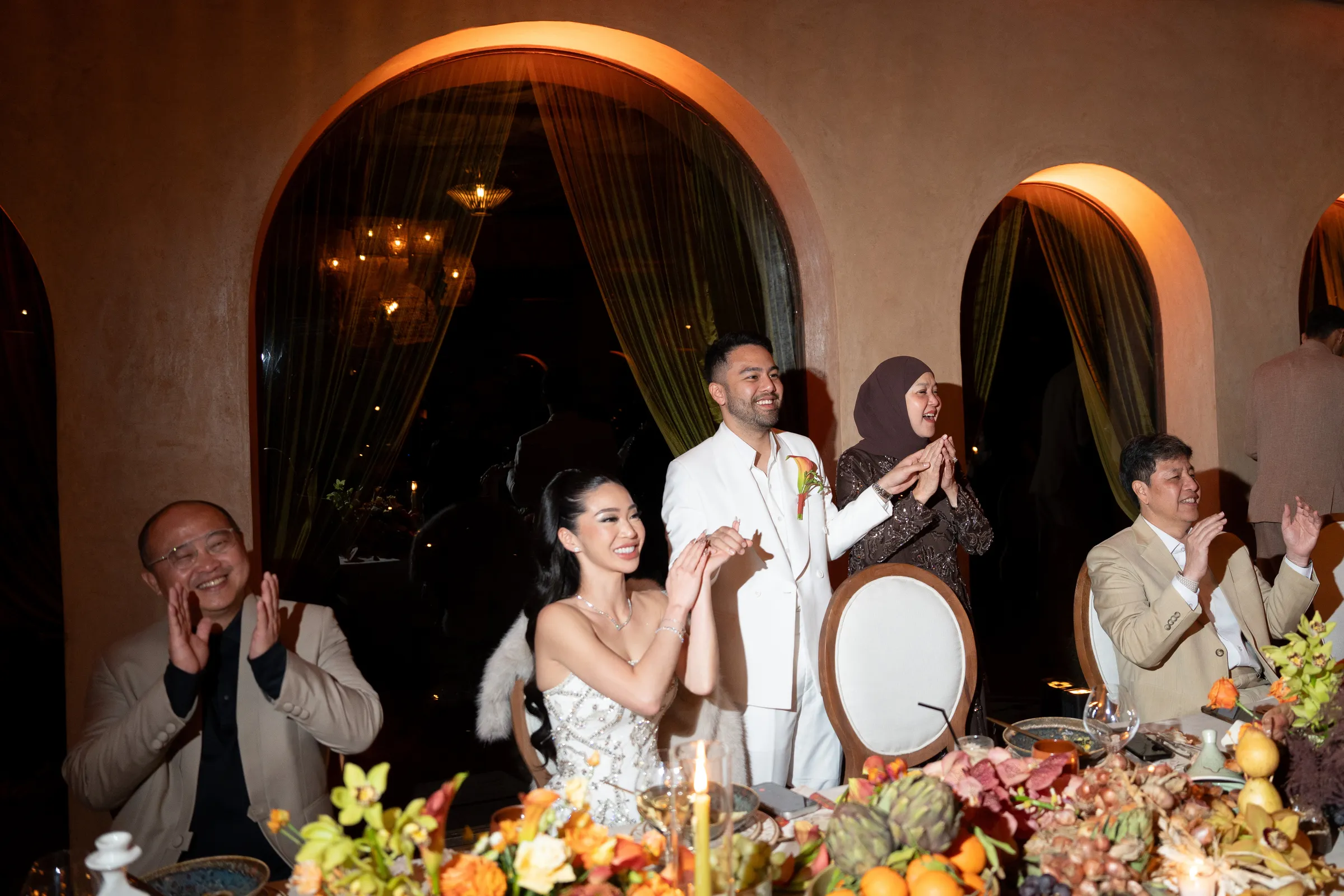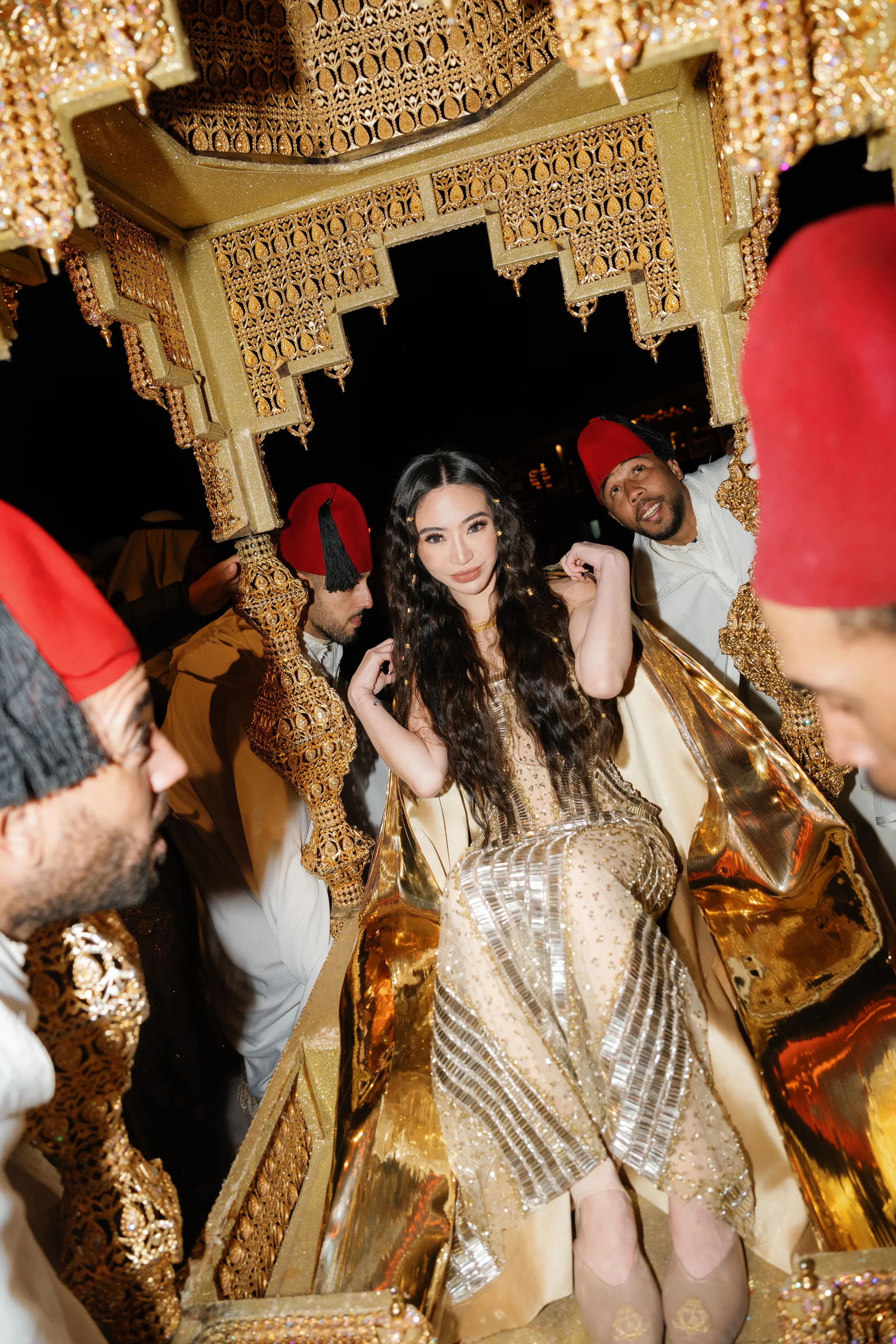 The celebration continued with a spectacular after-party in the Agafay Desert, where the couple embraced the theme “Arabian Night.” Guests fully immersed themselves in the experience, arriving in elaborate outfits inspired by Middle Eastern glamour and desert mystique. The evening featured traditional Moroccan performances, including a vibrant entrance moment where performers carried the bride and groom high on a ceremonial chair—an energetic highlight that brought the entire tent alive with music and celebration. Under glowing lanterns and patterned light projections, the desert transformed into a luxurious Arabian-inspired party that perfectly closed the wedding festivities.