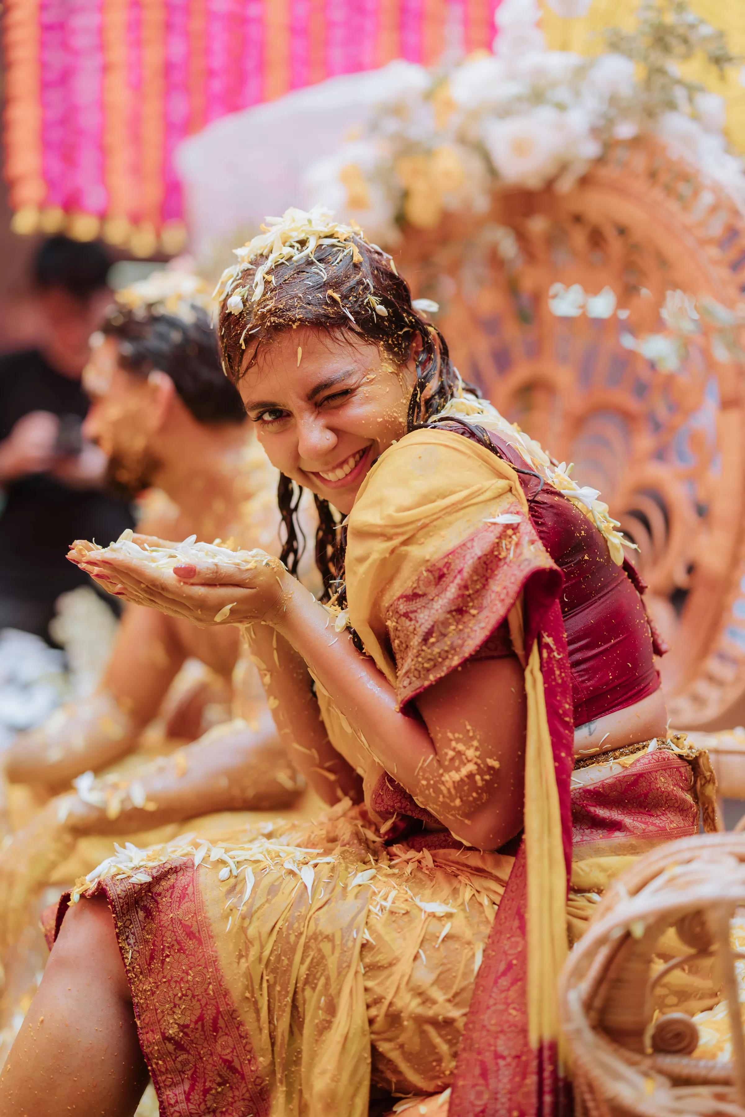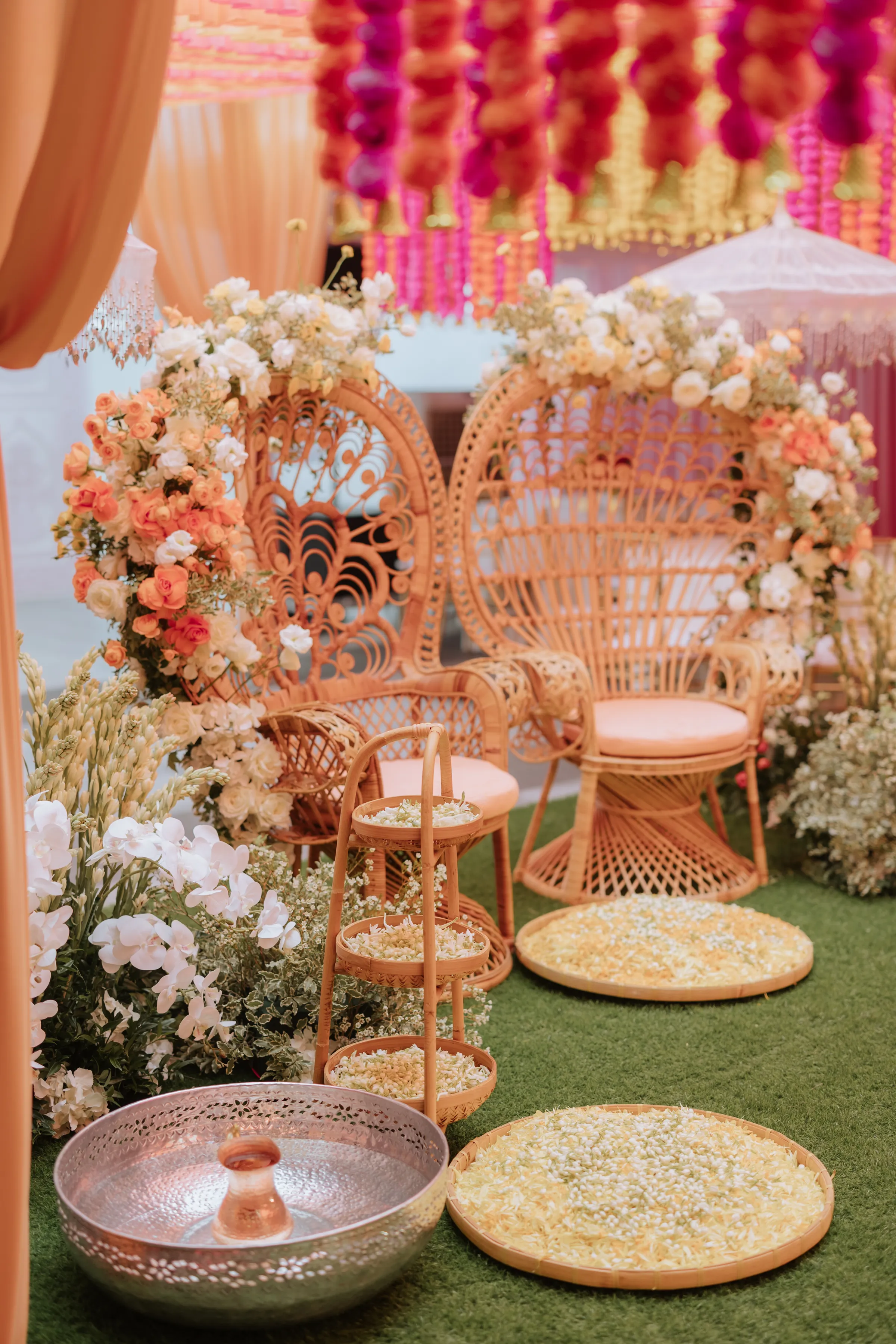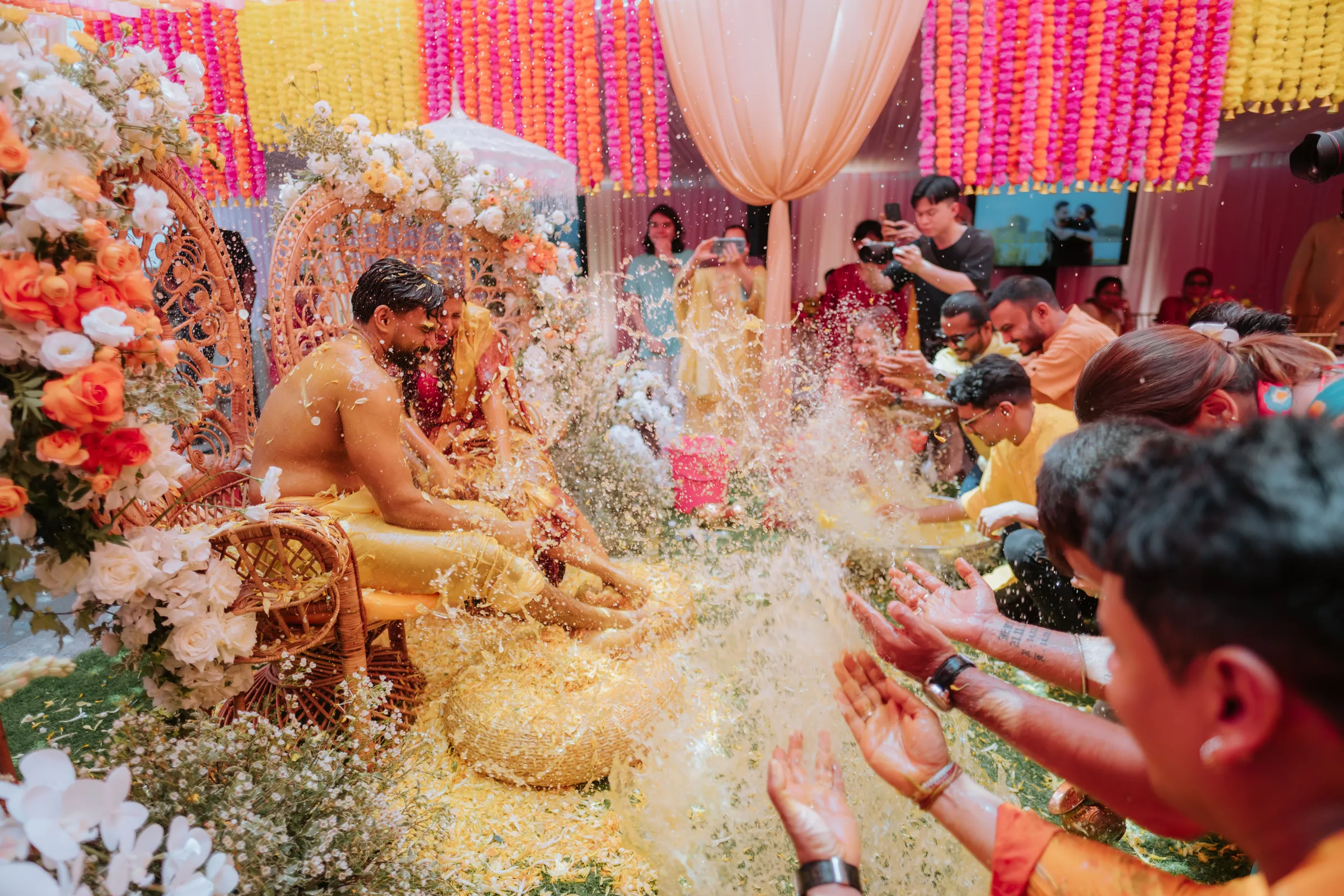 The celebrations began at Akash’s family home with the Gaye Holud, a joyful turmeric ceremony steeped in Bengali tradition. Delnah wore a vibrant maroon and yellow saree with gold zari work, her look playful and radiant. Against a backdrop of marigold, fuchsia, and saffron, the couple were showered in petals, laughter, and tradition. Cane peacock chairs, cascading blooms of orange and ivory, and baskets filled with jasmine petals set the tone for a vibrant, familial affair. It was a sensory celebration — bright, messy, and unapologetically fun.