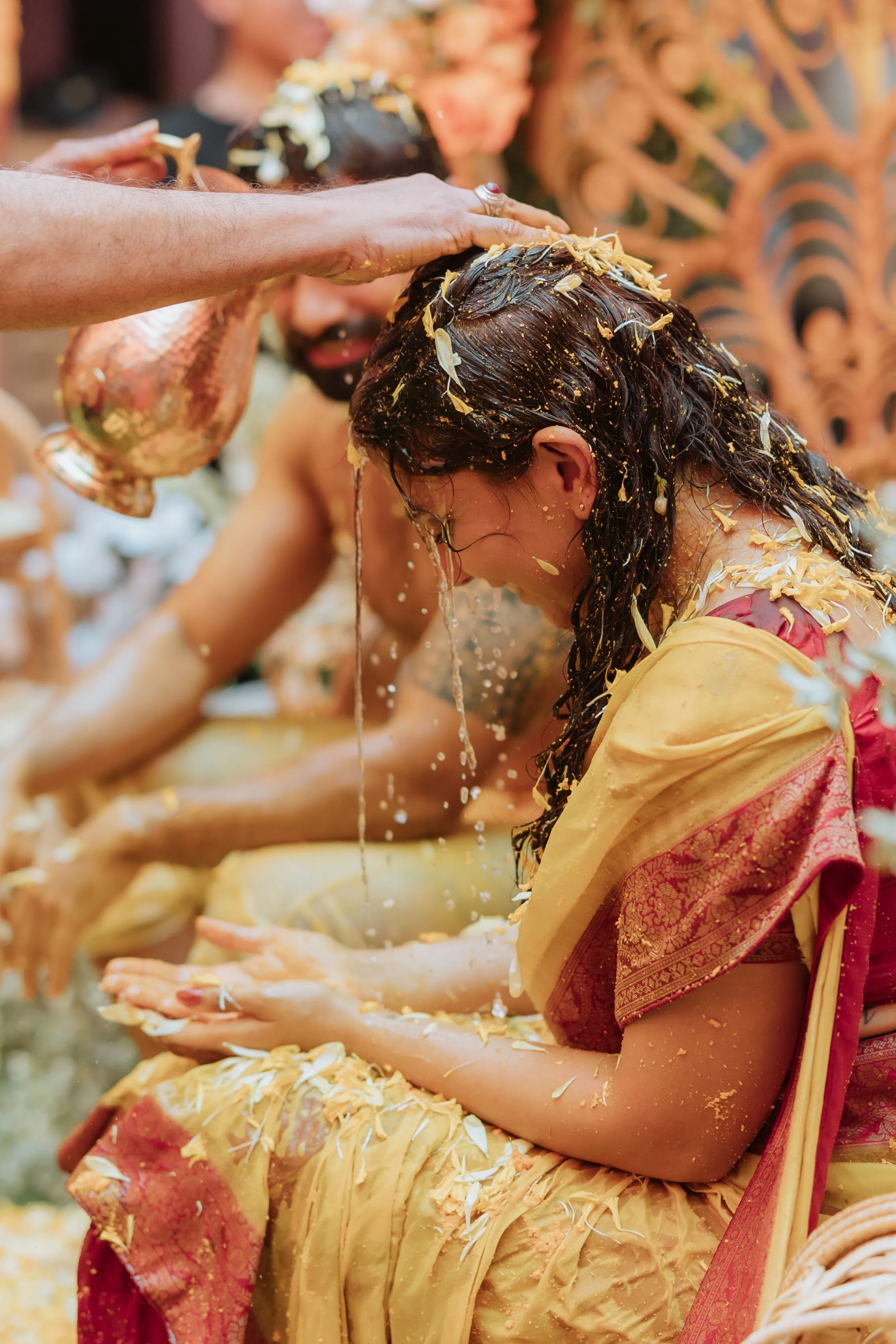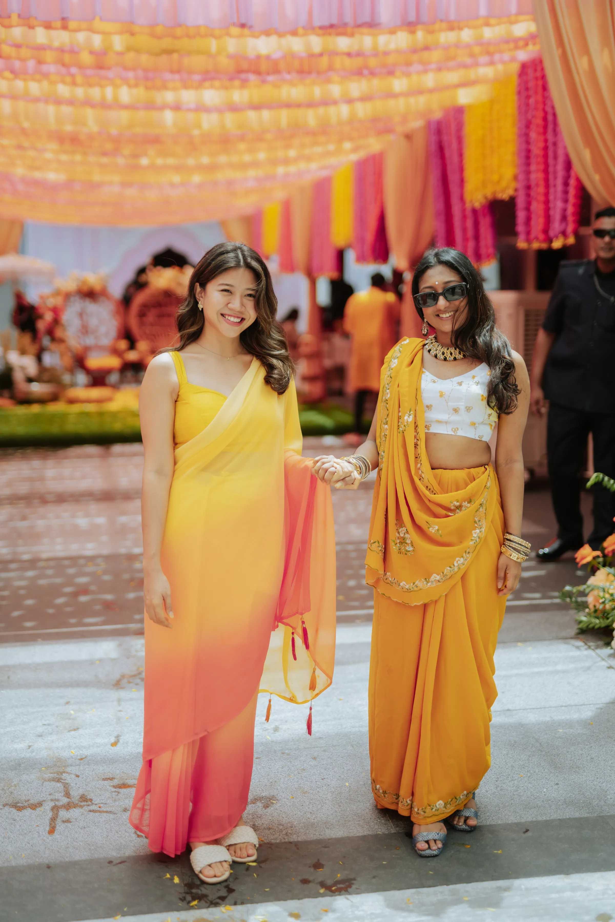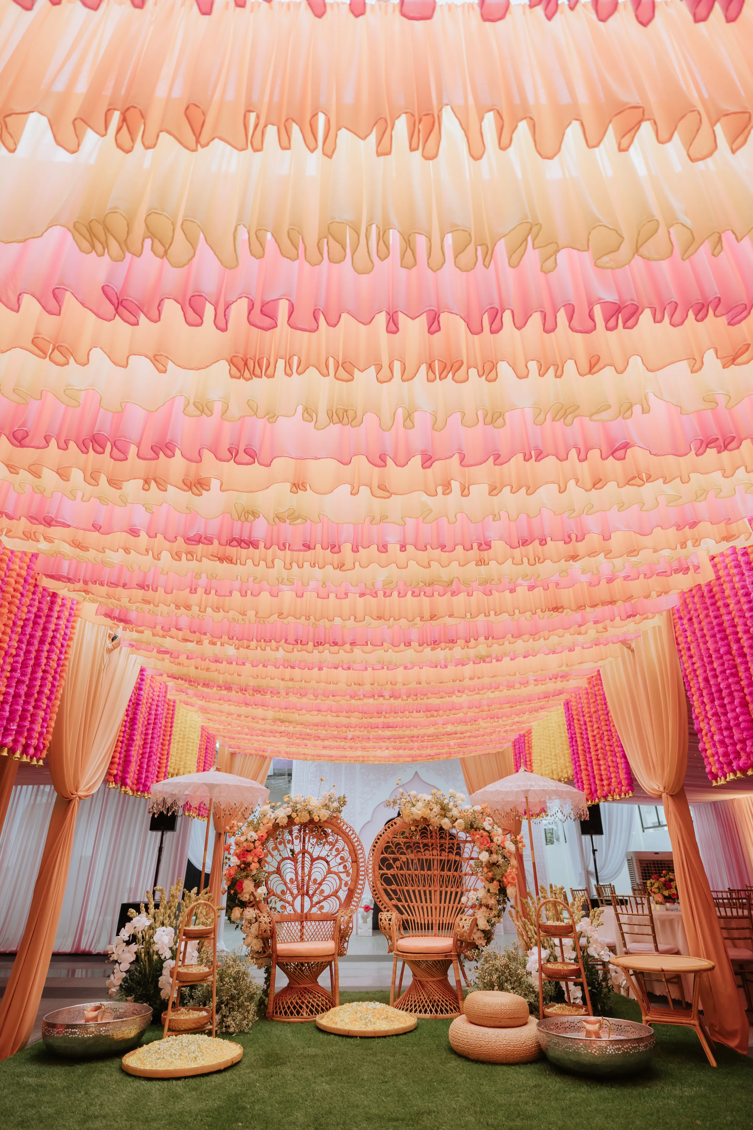 The celebrations began at Akash’s family home with the Gaye Holud, a joyful turmeric ceremony steeped in Bengali tradition. Delnah wore a vibrant maroon and yellow saree with gold zari work, her look playful and radiant. Against a backdrop of marigold, fuchsia, and saffron, the couple were showered in petals, laughter, and tradition. Cane peacock chairs, cascading blooms of orange and ivory, and baskets filled with jasmine petals set the tone for a vibrant, familial affair. It was a sensory celebration — bright, messy, and unapologetically fun.
