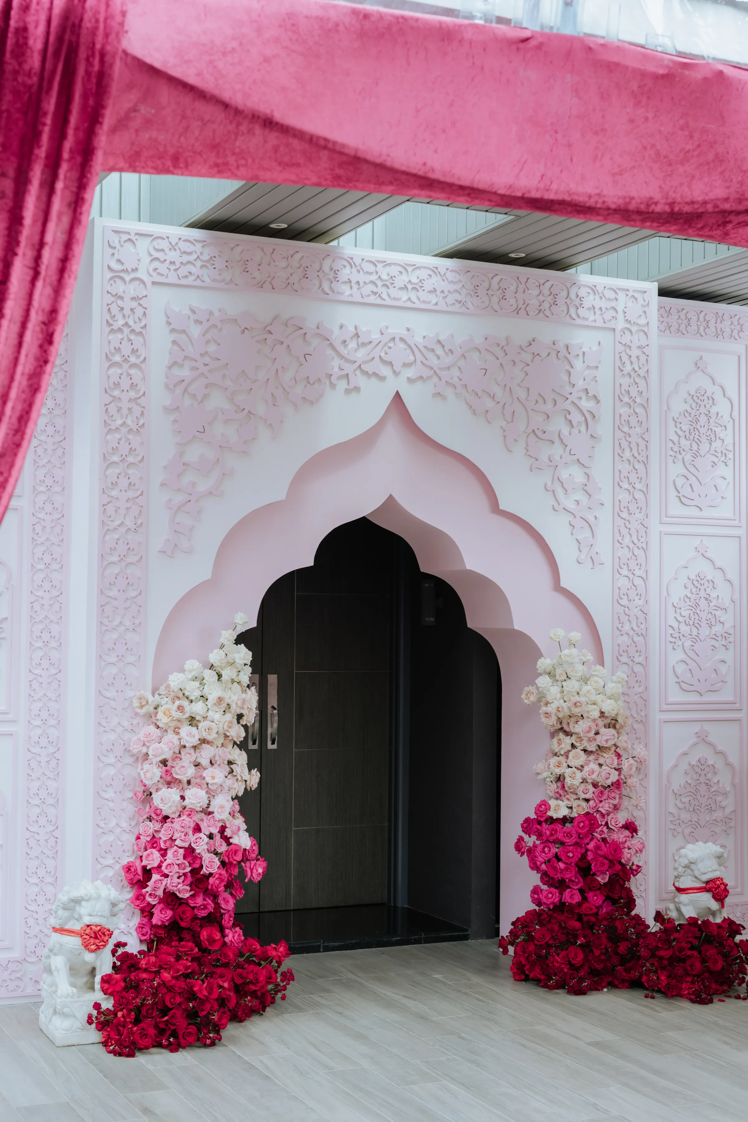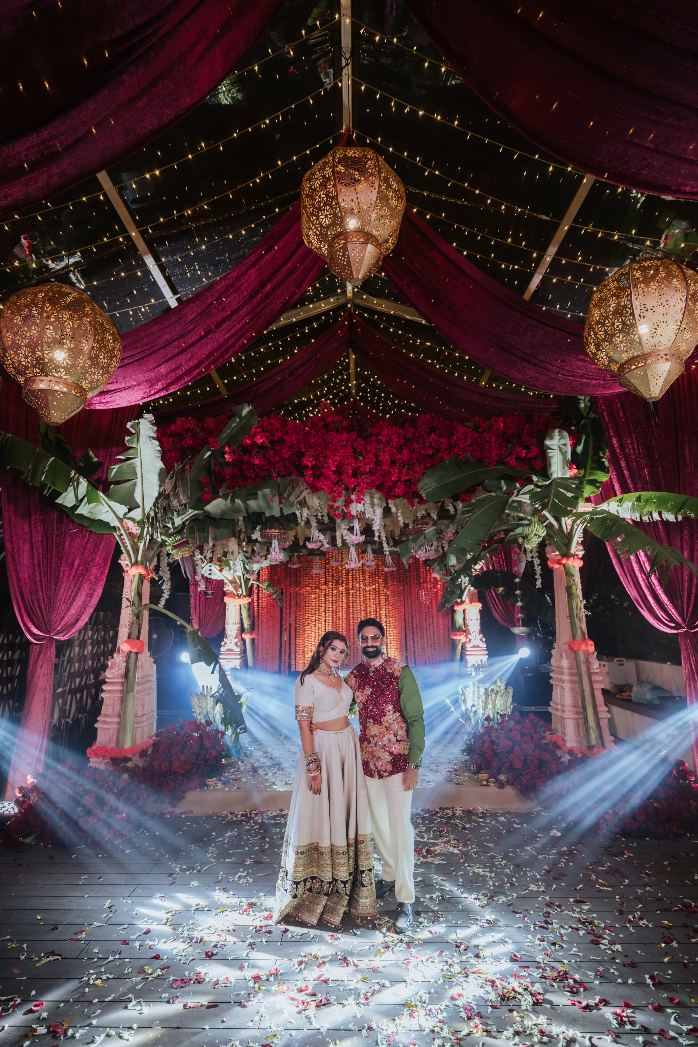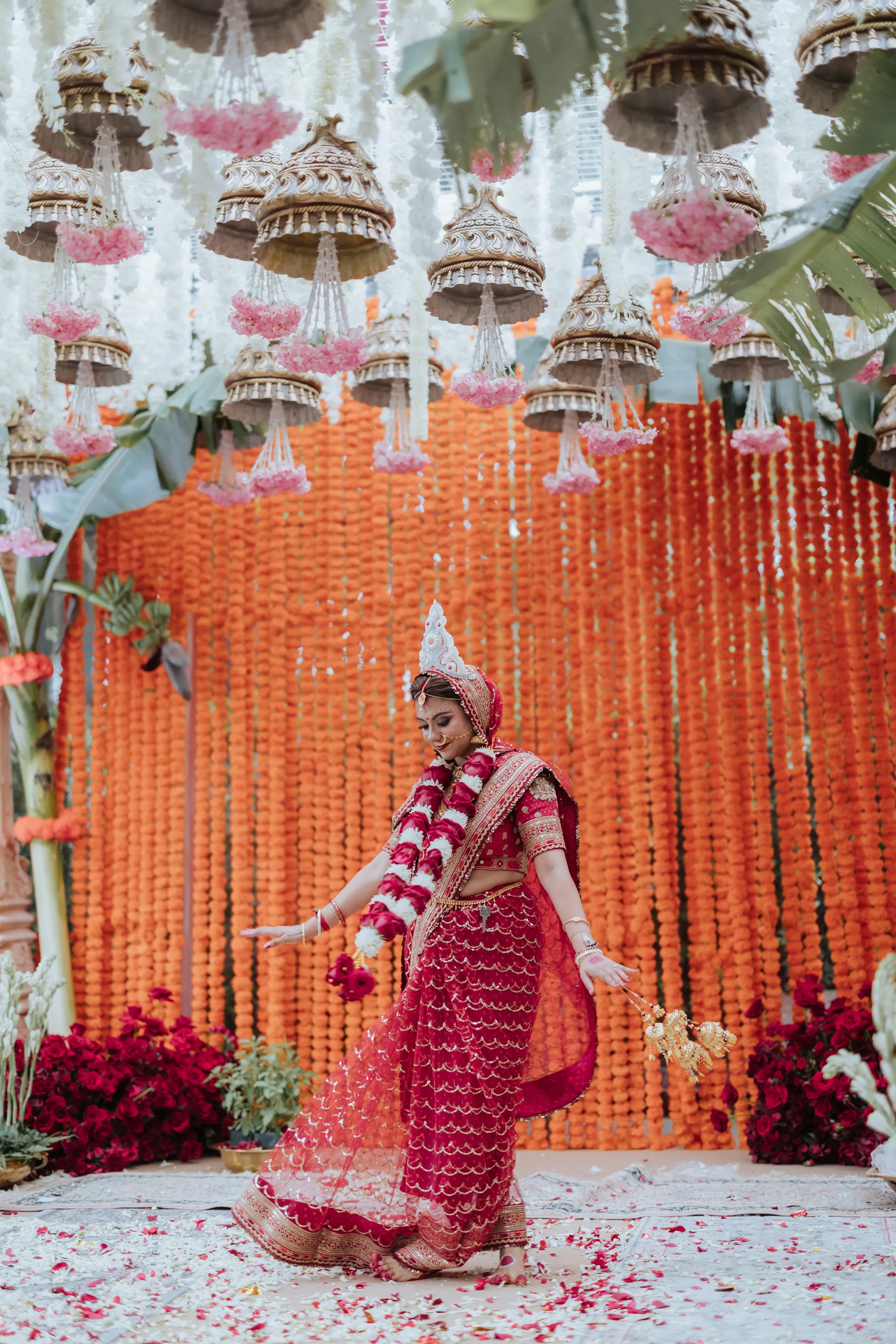 The Bengali wedding ceremony was the emotional heart of the week — ornate, ceremonial, and layered with generational meaning. Delnah was a vision in a deep red saree with scalloped gold embroidery and elaborate temple jewelry, while Akash wore a traditional white dhoti, both looks completed with the Topor and Mukut headwear; marks of a quintessential Bengali wedding. The setting was as striking as the attire. A custom-built mandap stood beneath a canopy of fuchsia velvet drapes, banana leaves, and chandeliers of cascading flowers. Guests were greeted by a dhol ensemble at the entrance, amplifying the celebratory spirit with live beats. A custom deep pink-toned bar and ornate carved backdrop further added a regal touch — a fusion of Bengali tradition with modern design flair.