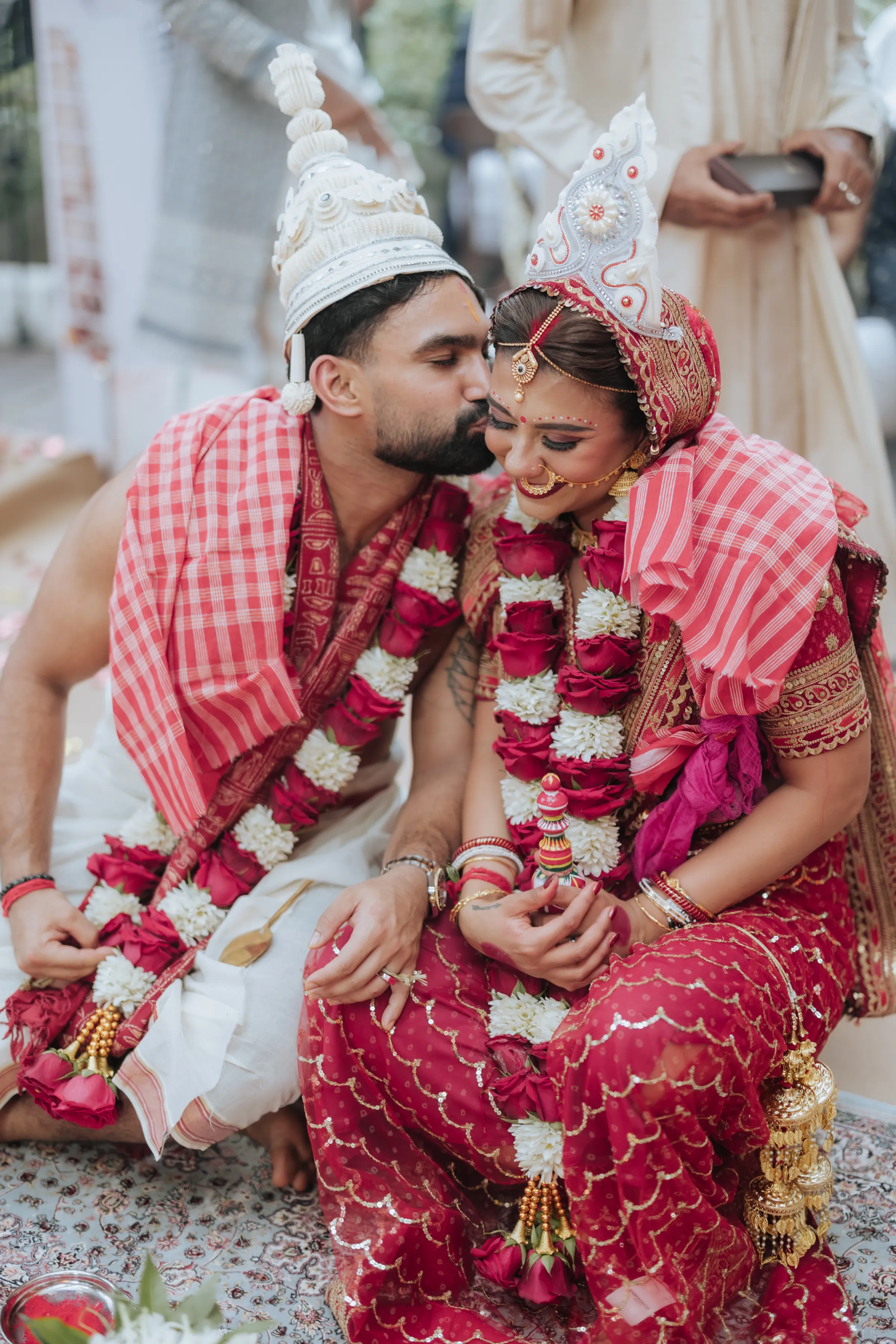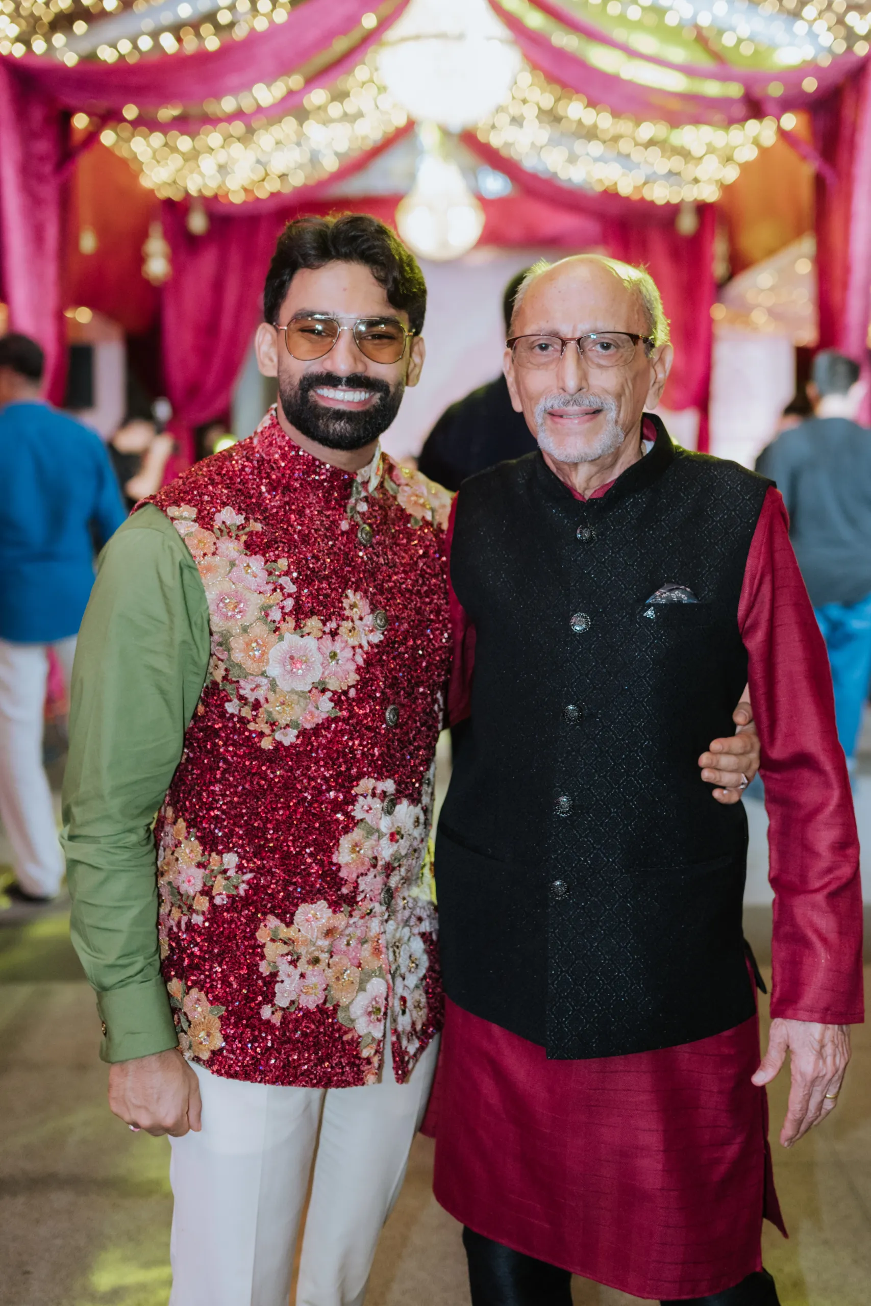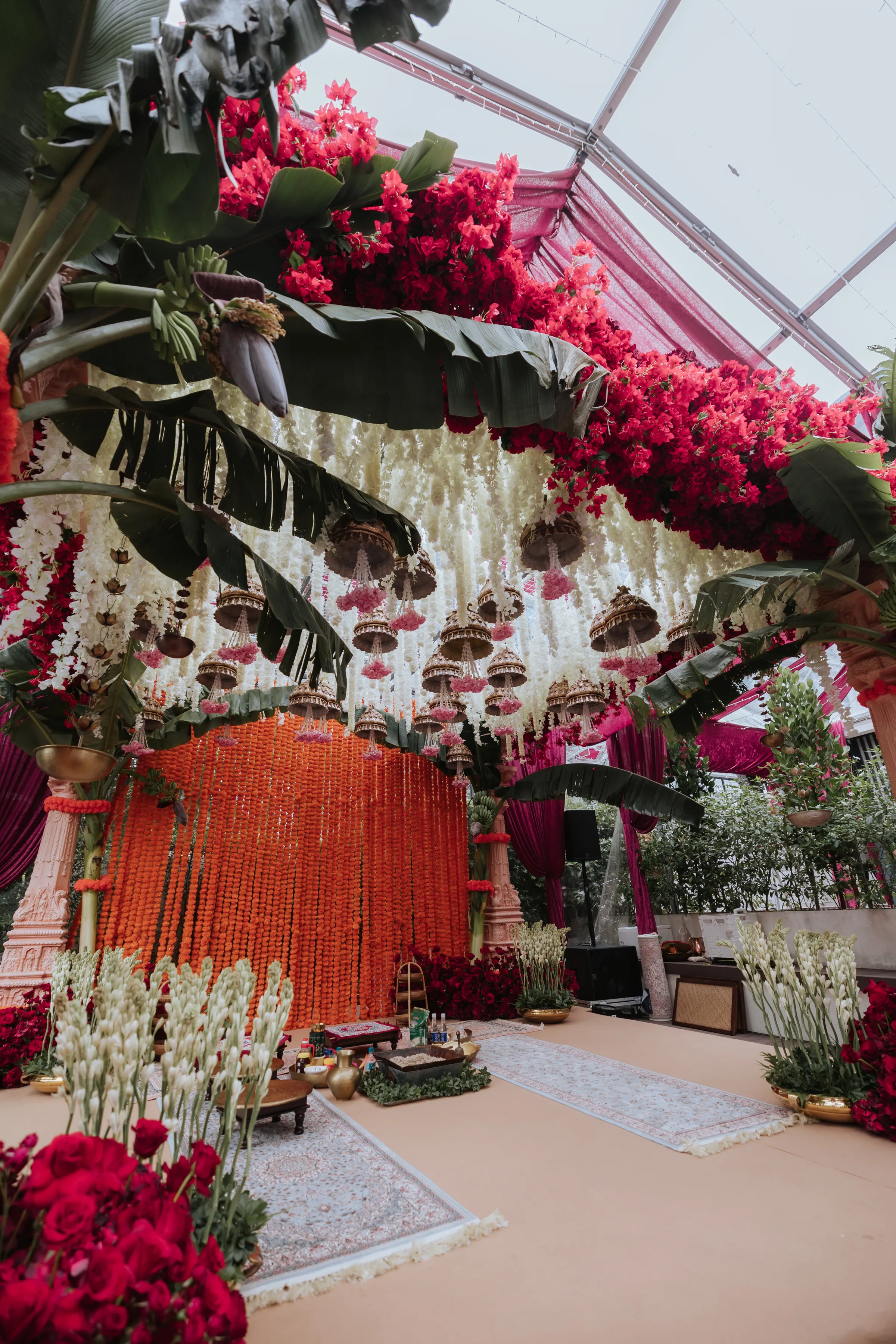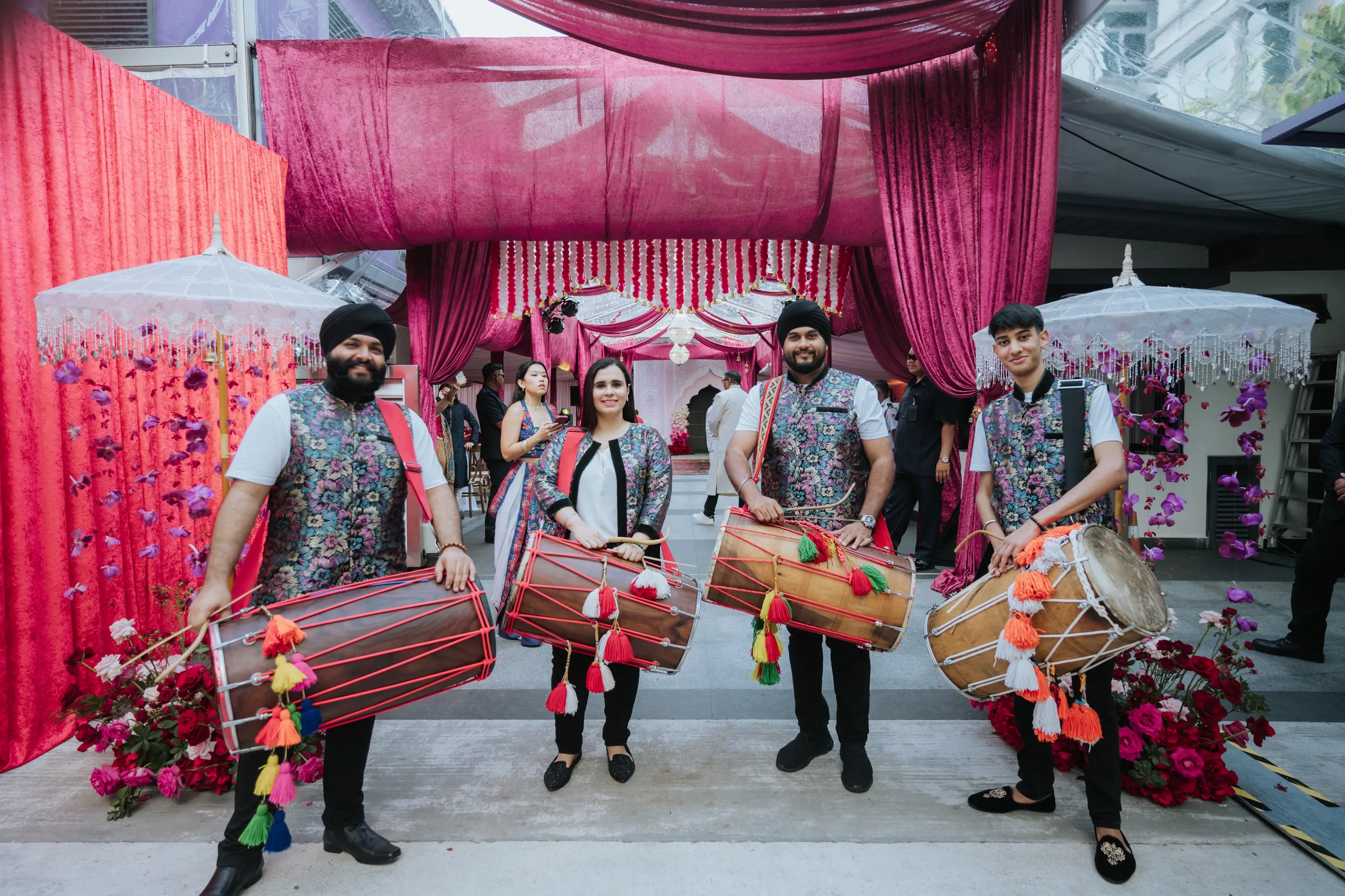 The Bengali wedding ceremony was the emotional heart of the week — ornate, ceremonial, and layered with generational meaning. Delnah was a vision in a deep red saree with scalloped gold embroidery and elaborate temple jewelry, while Akash wore a traditional white dhoti, both looks completed with the Topor and Mukut headwear; marks of a quintessential Bengali wedding. The setting was as striking as the attire. A custom-built mandap stood beneath a canopy of fuchsia velvet drapes, banana leaves, and chandeliers of cascading flowers. Guests were greeted by a dhol ensemble at the entrance, amplifying the celebratory spirit with live beats. A custom deep pink-toned bar and ornate carved backdrop further added a regal touch — a fusion of Bengali tradition with modern design flair.