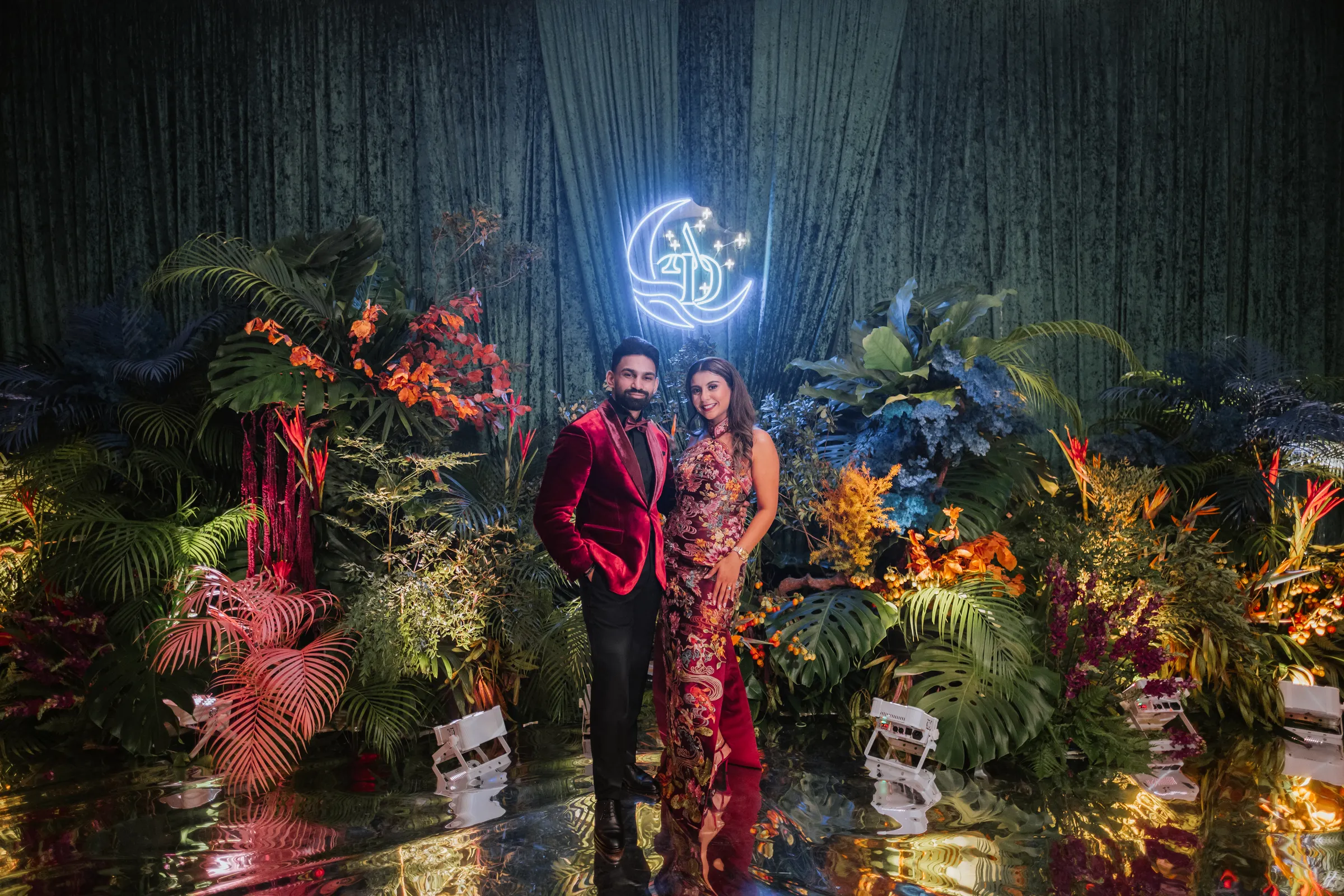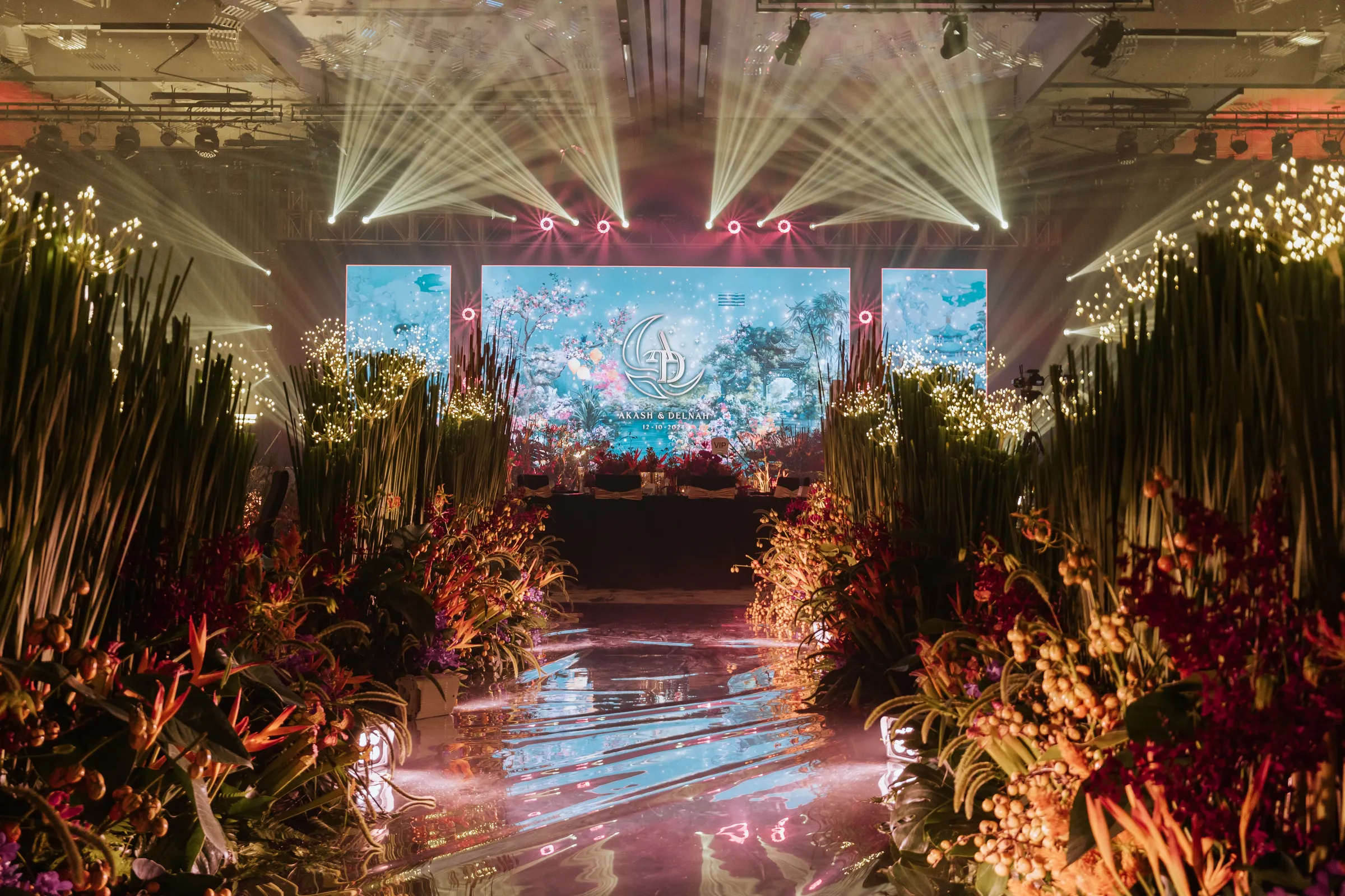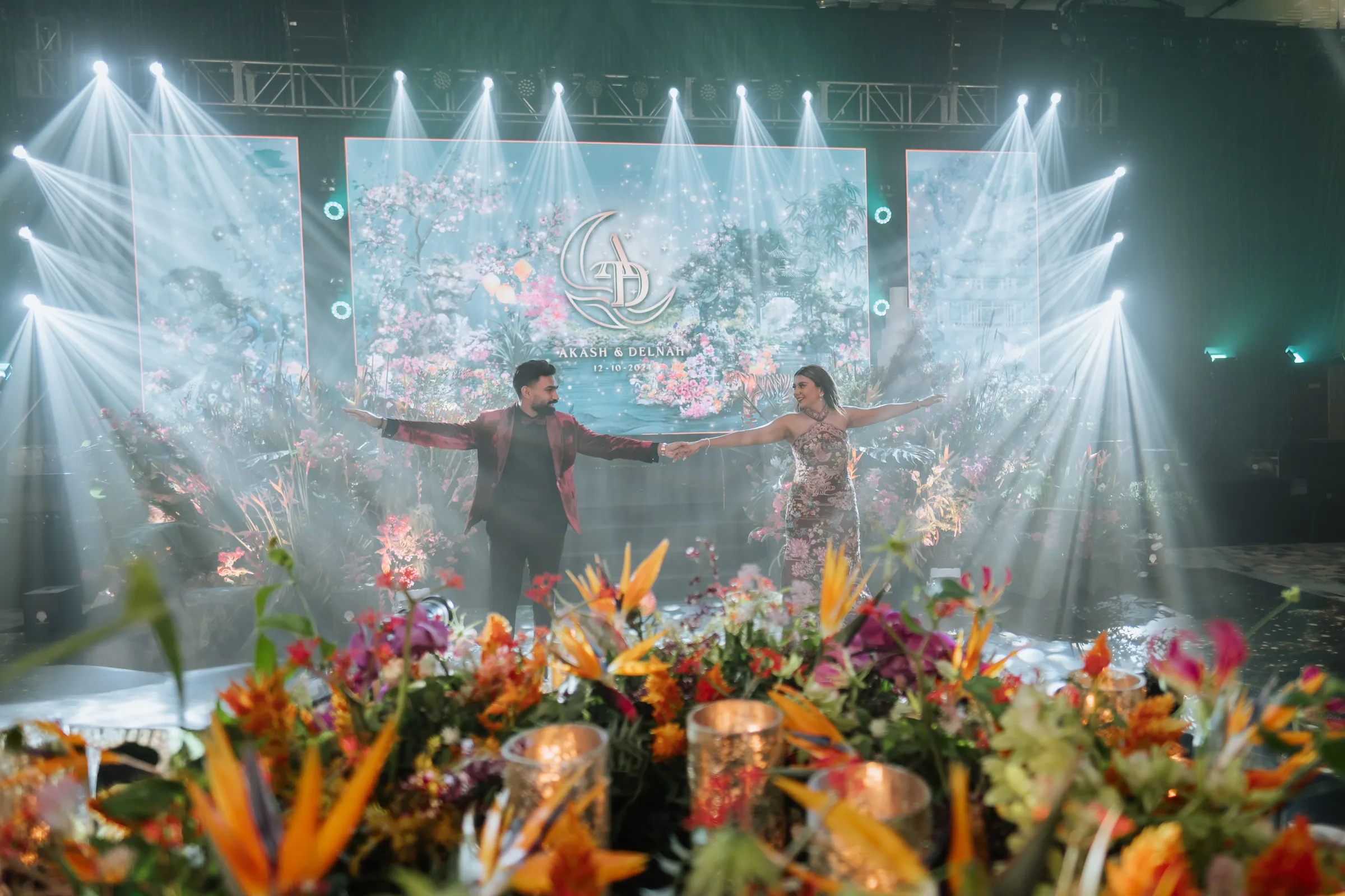 The grand reception at Renaissance was a dramatic shift. Guests were welcomed into the Renaissance via a dramatic staircase lined with hot pink gerberas, tropical foliage, and golden uplighting. The ballroom itself transformed into a lush dreamscape — towering greens, wild blooms in rich jewel tones, and a glassy mirrored aisle leading to a stage pulsing with light. Their monogram, animated in digital art, brought a modern edge to the florals and organic textures. From the entrance to the afterparty, the atmosphere was electric.