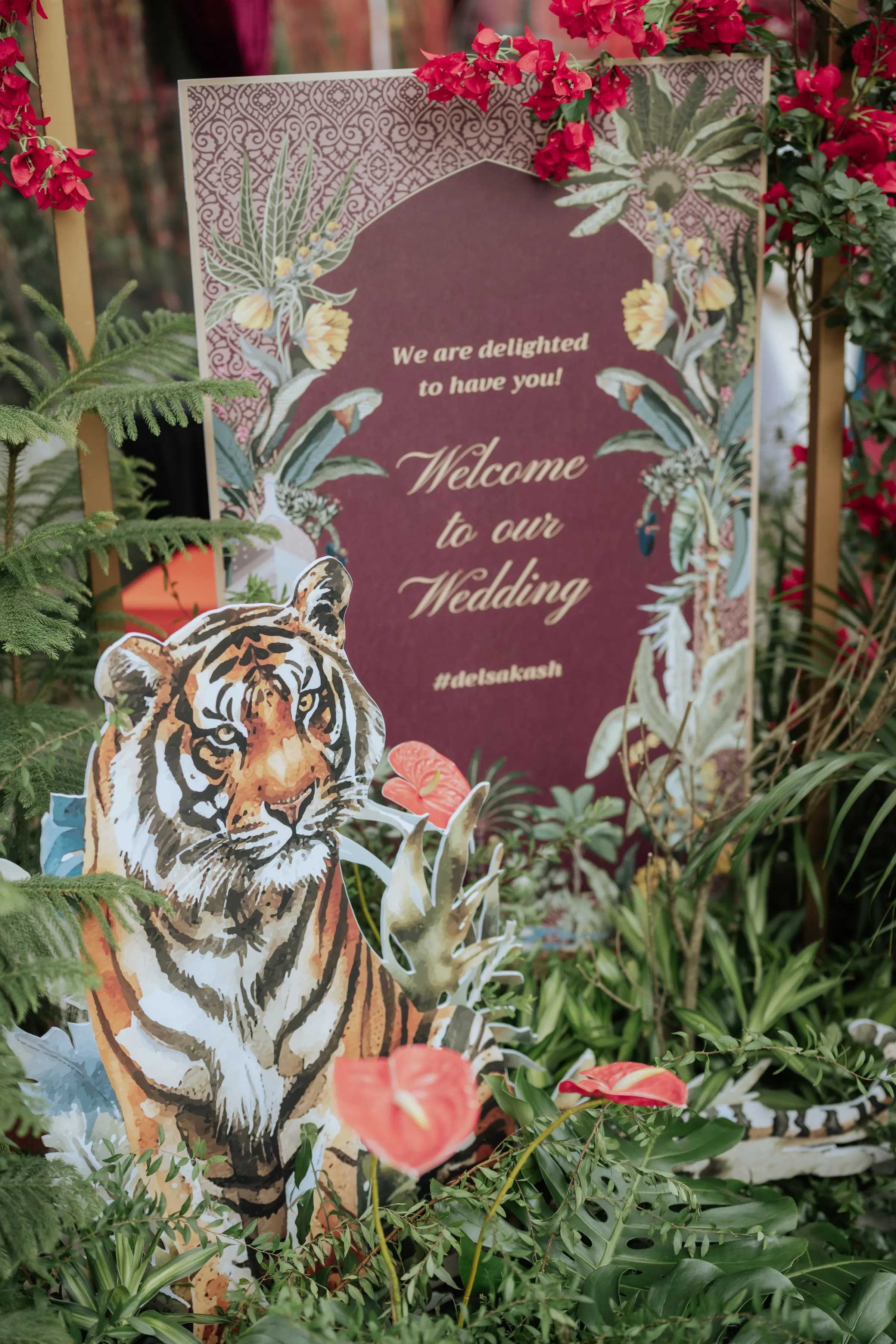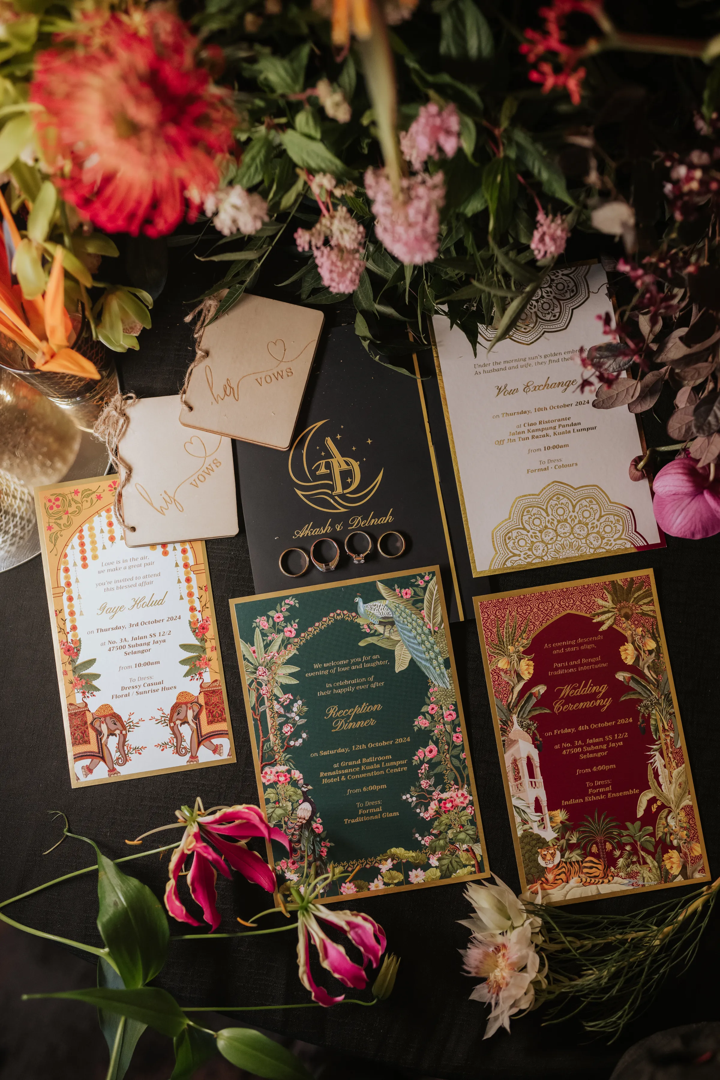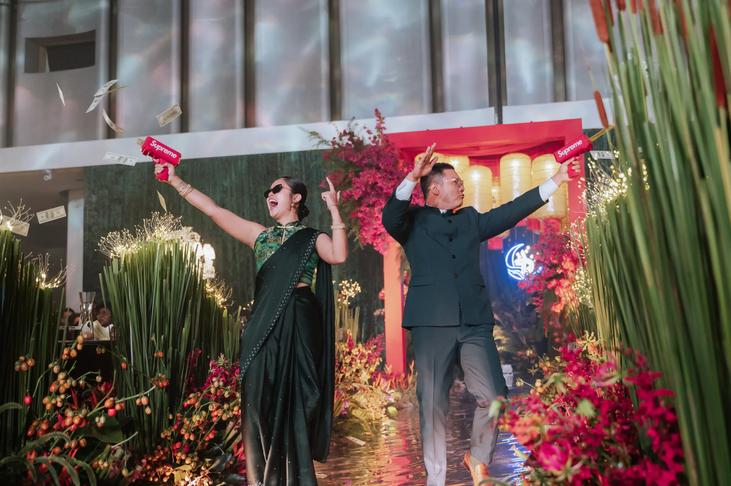 The grand reception at Renaissance was a dramatic shift. Guests were welcomed into the Renaissance via a dramatic staircase lined with hot pink gerberas, tropical foliage, and golden uplighting. The ballroom itself transformed into a lush dreamscape — towering greens, wild blooms in rich jewel tones, and a glassy mirrored aisle leading to a stage pulsing with light. Their monogram, animated in digital art, brought a modern edge to the florals and organic textures. From the entrance to the afterparty, the atmosphere was electric.
