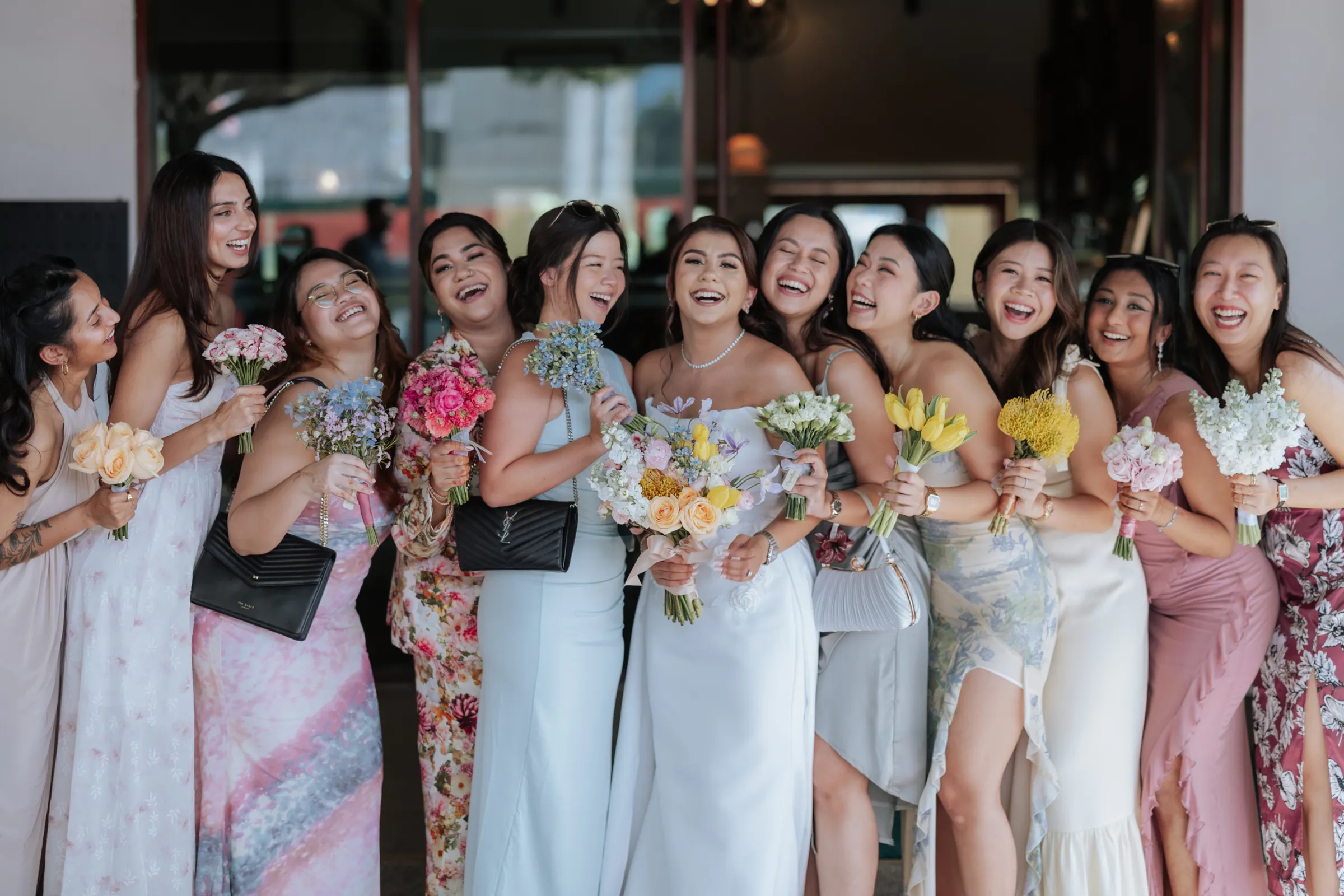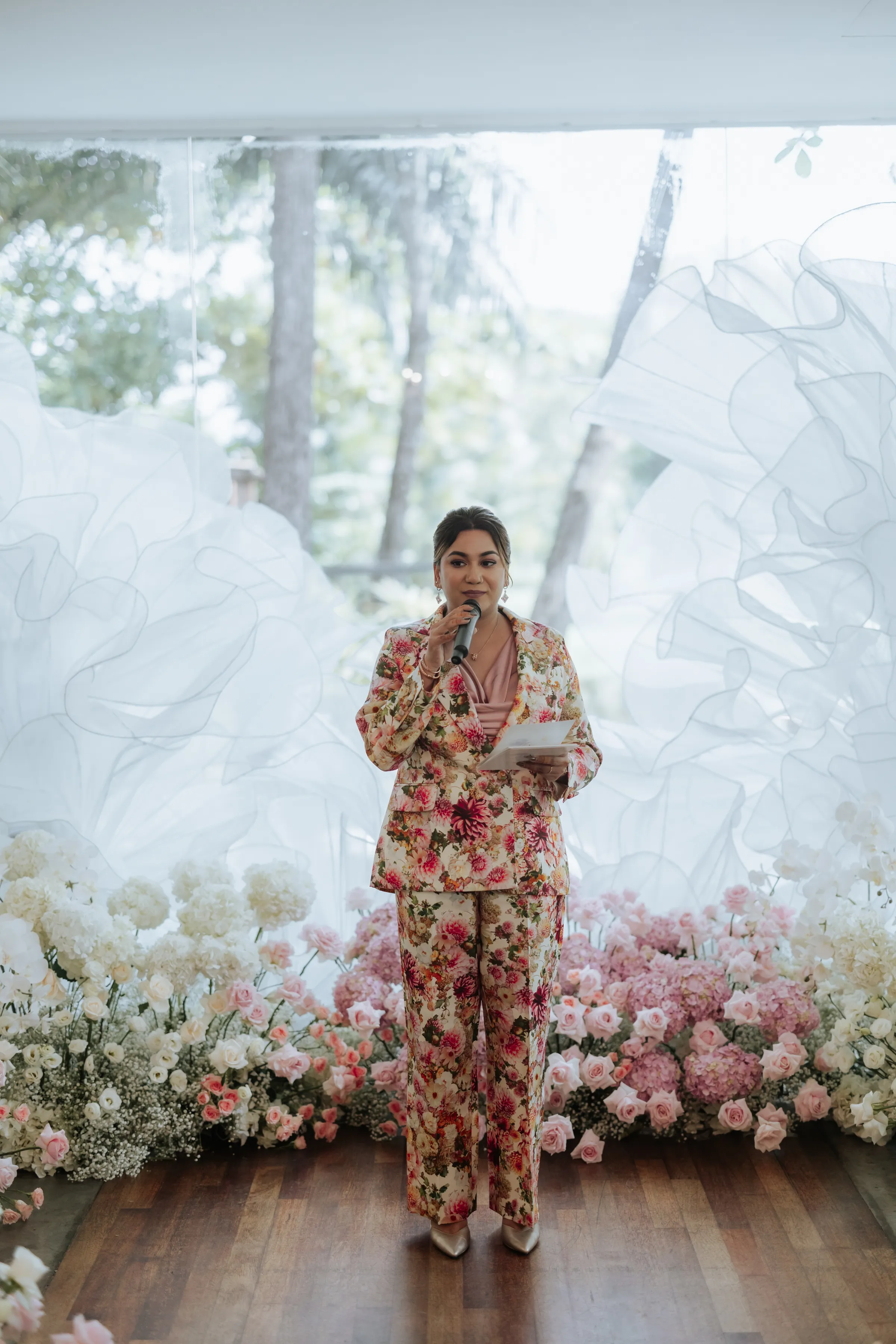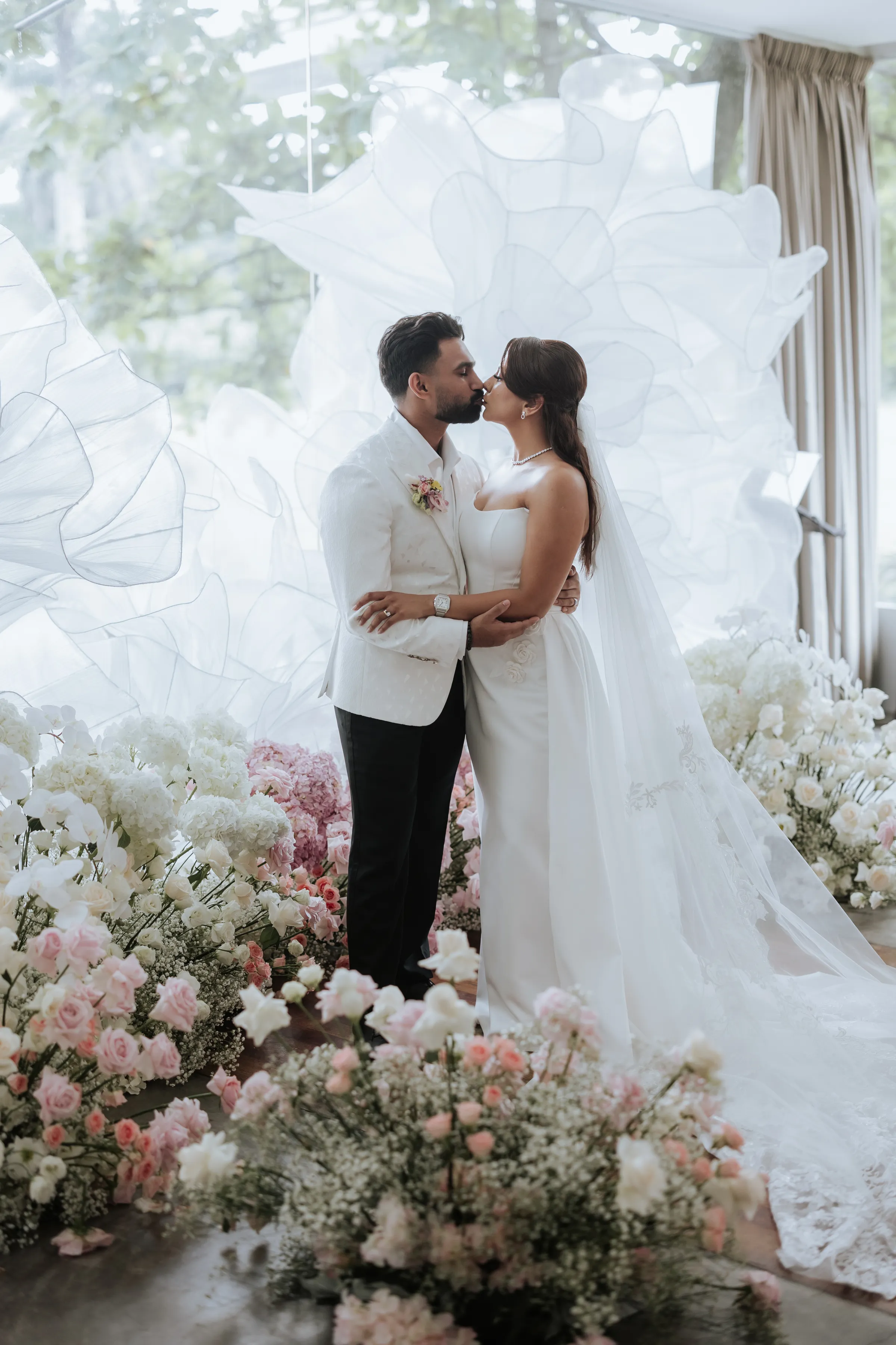 In contrast to the vibrant Bengali ceremony, the vow exchange at Ciao’s glasshouse was intentionally serene. Delnah wore a minimalist white gown with a structured bodice and flowing train, while Akash looked refined in an ivory embroidered tuxedo. Surrounded by floor-level arrangements of pale pink and white florals, the mood was calm, romantic, and grounded.