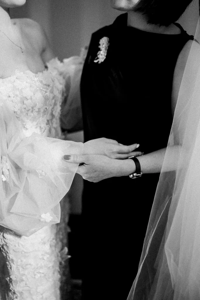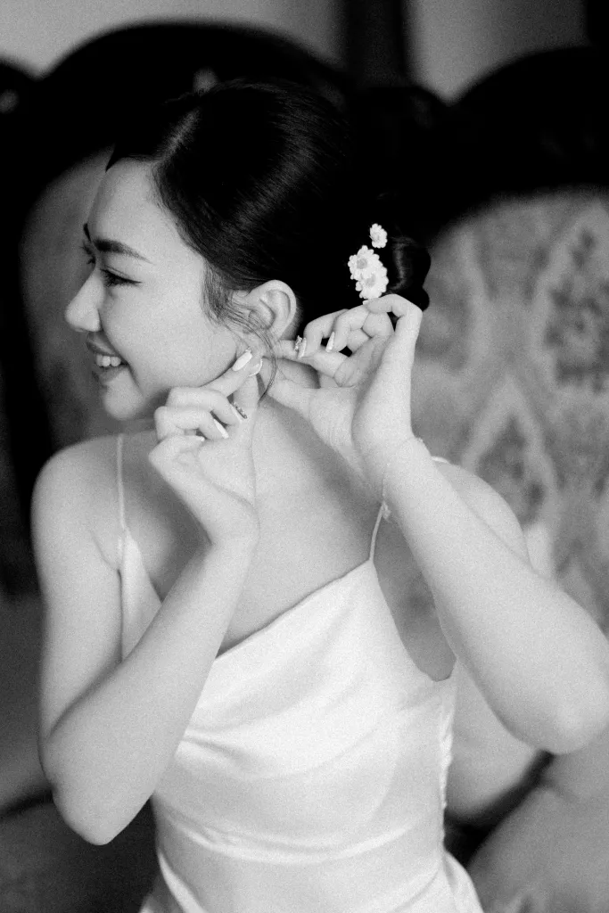 In the tranquility of anticipation, Đại penned his thoughts to Trang before setting off to fetch his bride. While the bride adorned in a satin slip dress, and her bridesmaids in matching satin sets, got ready together in a slur of anticipation. Embracing her silhouette, Trang donned a romantic Milla Nova lace gown featuring miniture florals, paired with a matching veil. Her bridesmaids mirrored the earthy tones of the setting in silk dresses, while Đại looked very accurately put together, in his beige double breasted suit and favourite timepiece.
