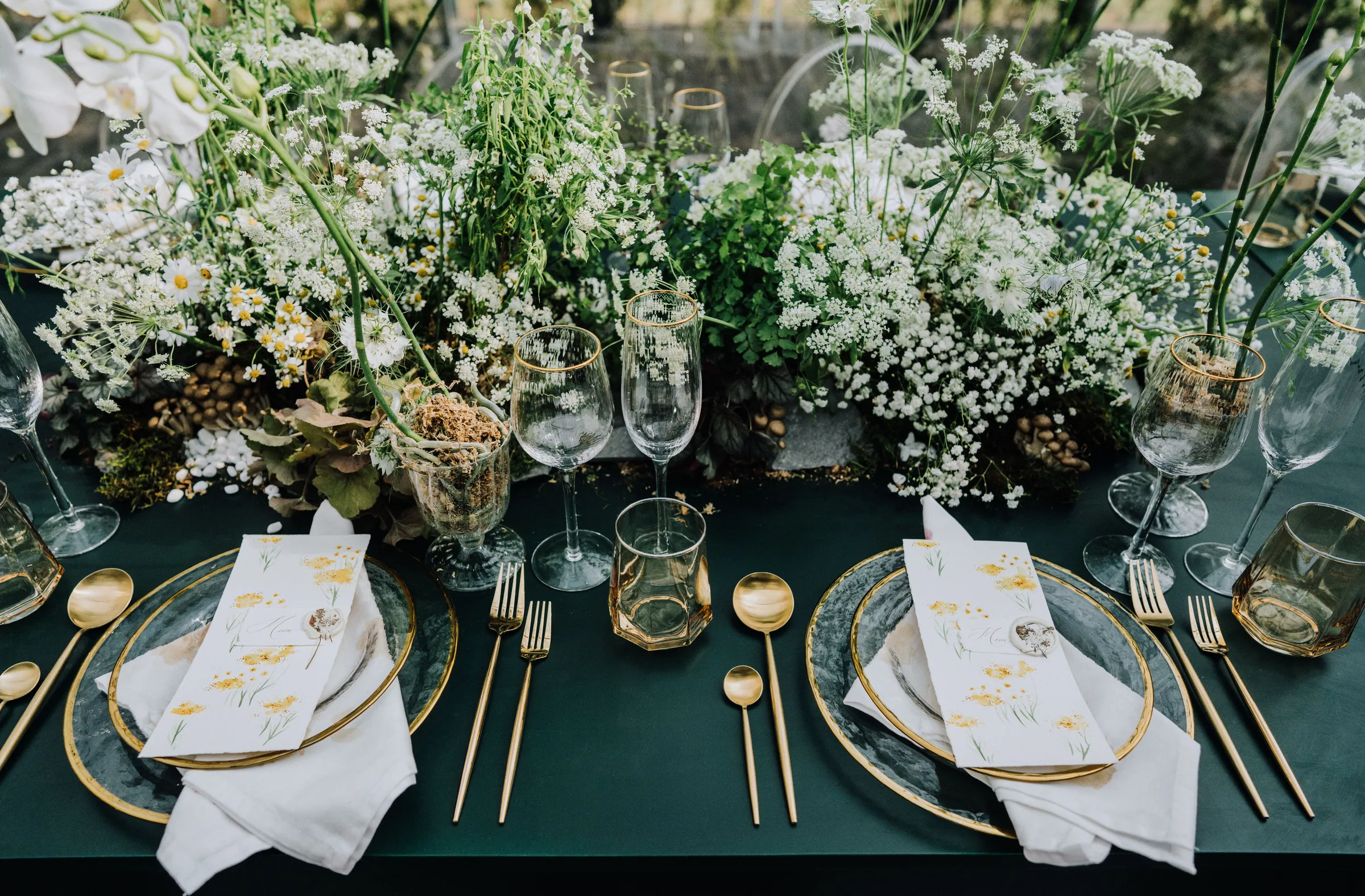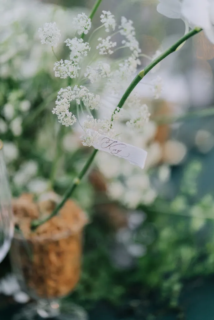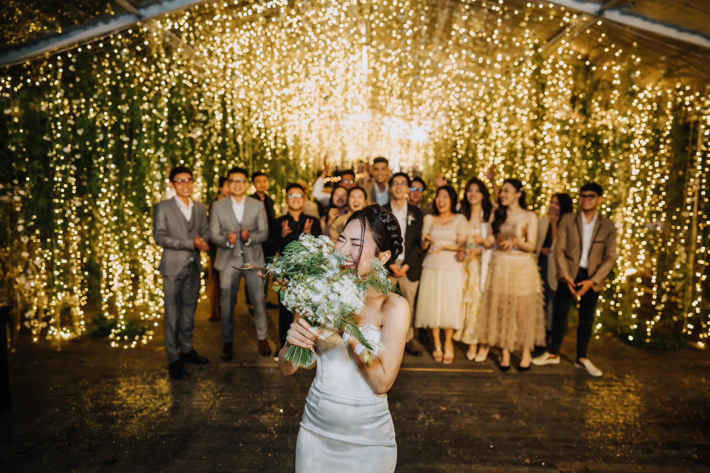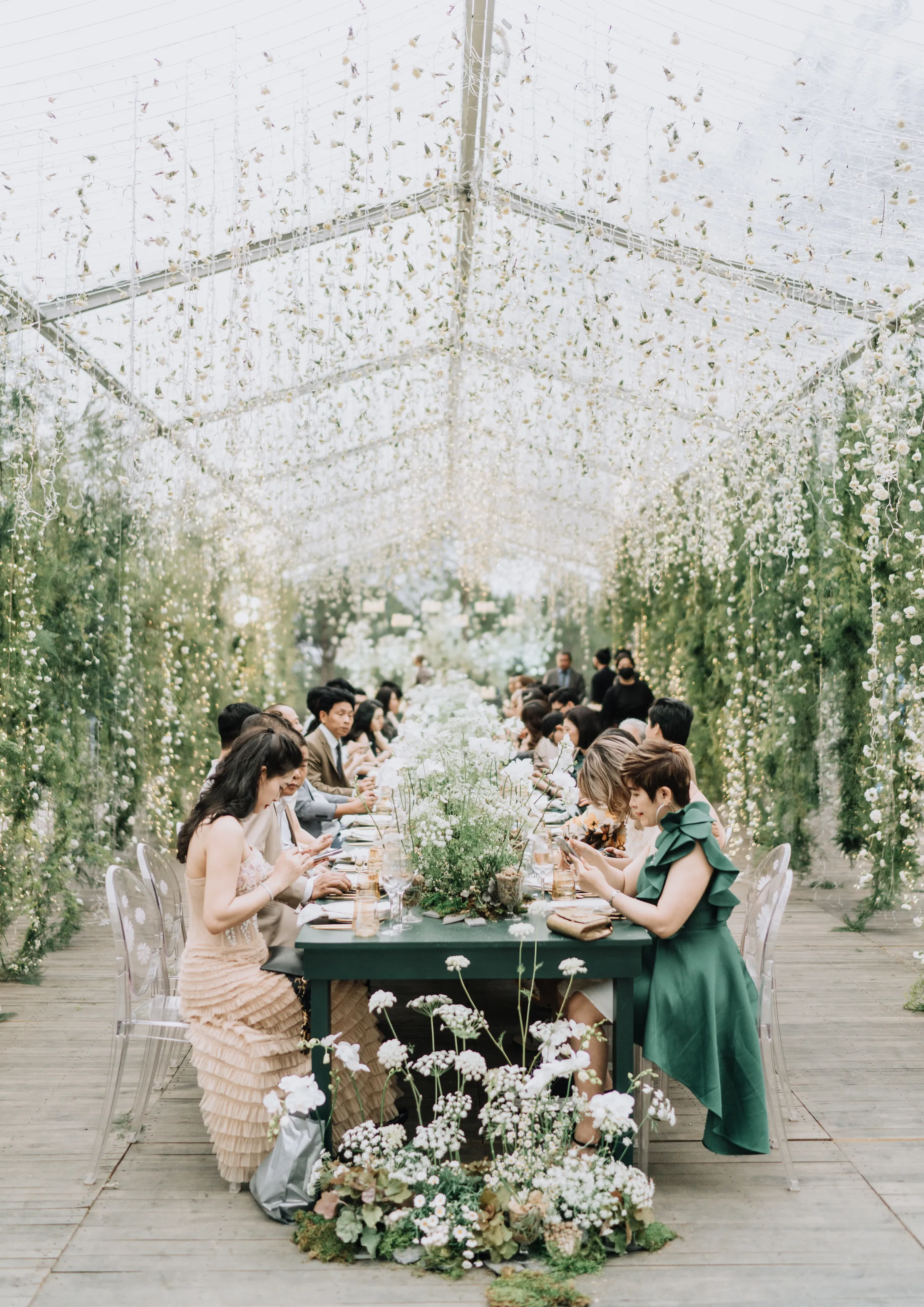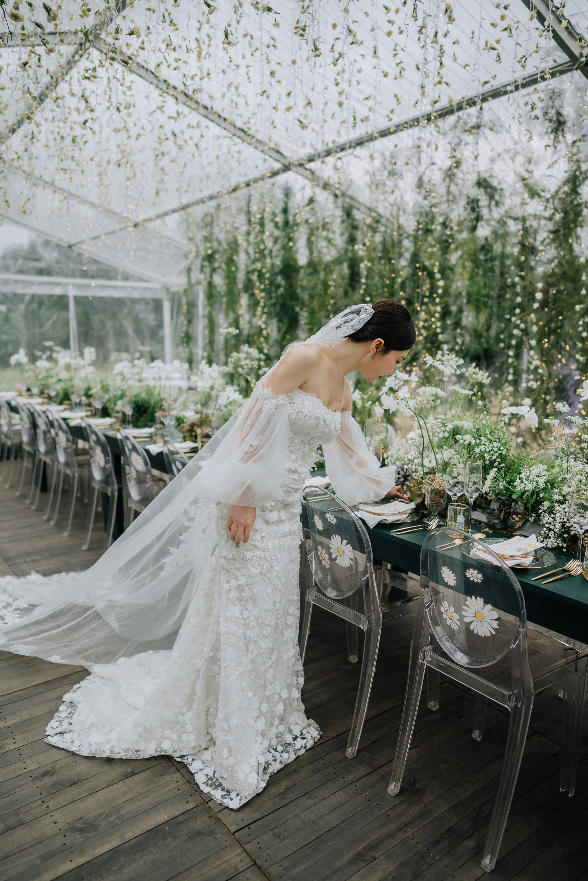 Post vows, the revelry transitioned into a greenhouse realm, where the ceilings dripped with floral strands. The dinner tableau, a single verdant stretch, was an ensemble of baby’s breath meadows, daisy centrepieces, golden accents, and daisy prints on ghost chairs where Vietnamese fusion gastronomy tantalised palates, and heartfelt speeches tugged at heartstrings.The ambiance glowed with tender luminance as dusk sets.