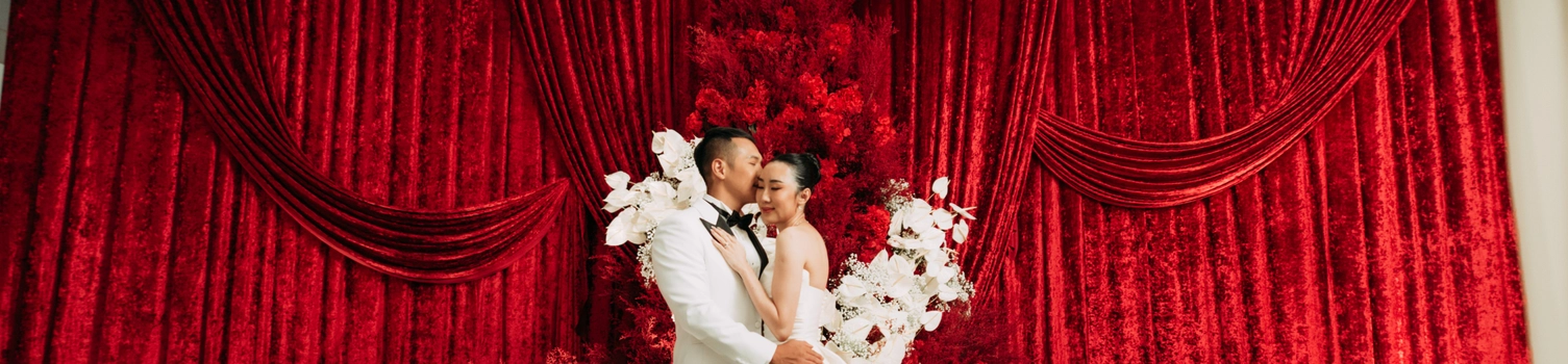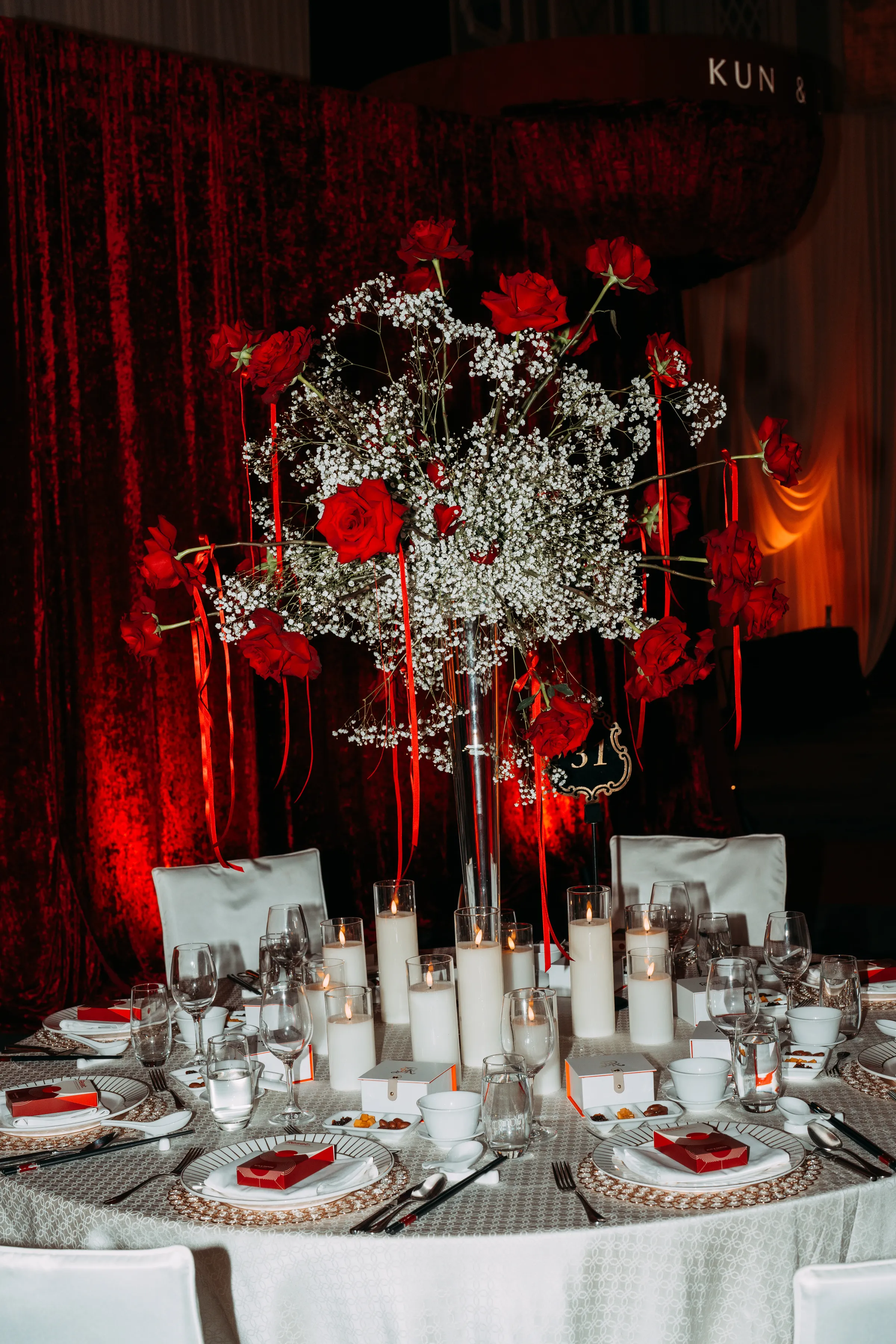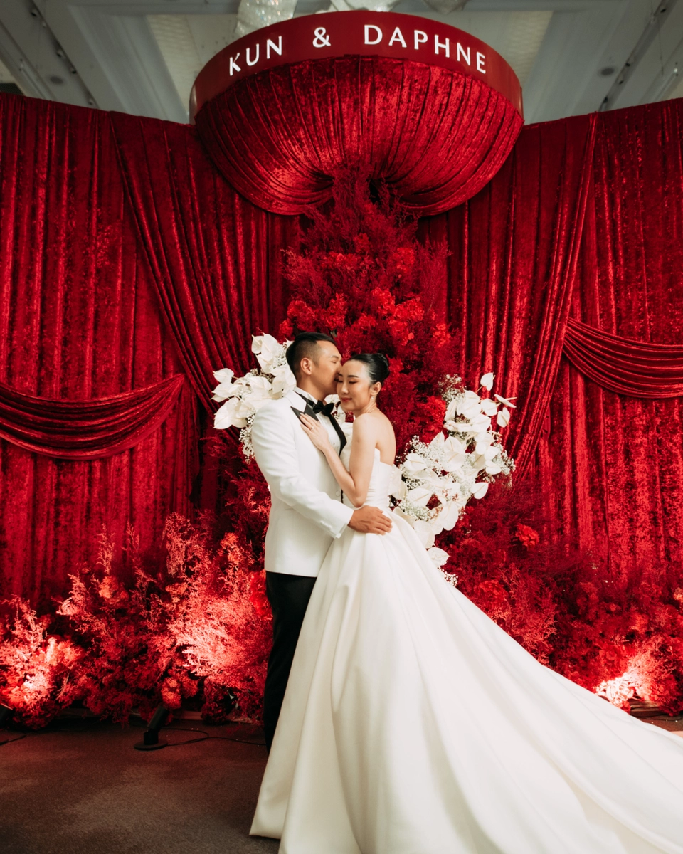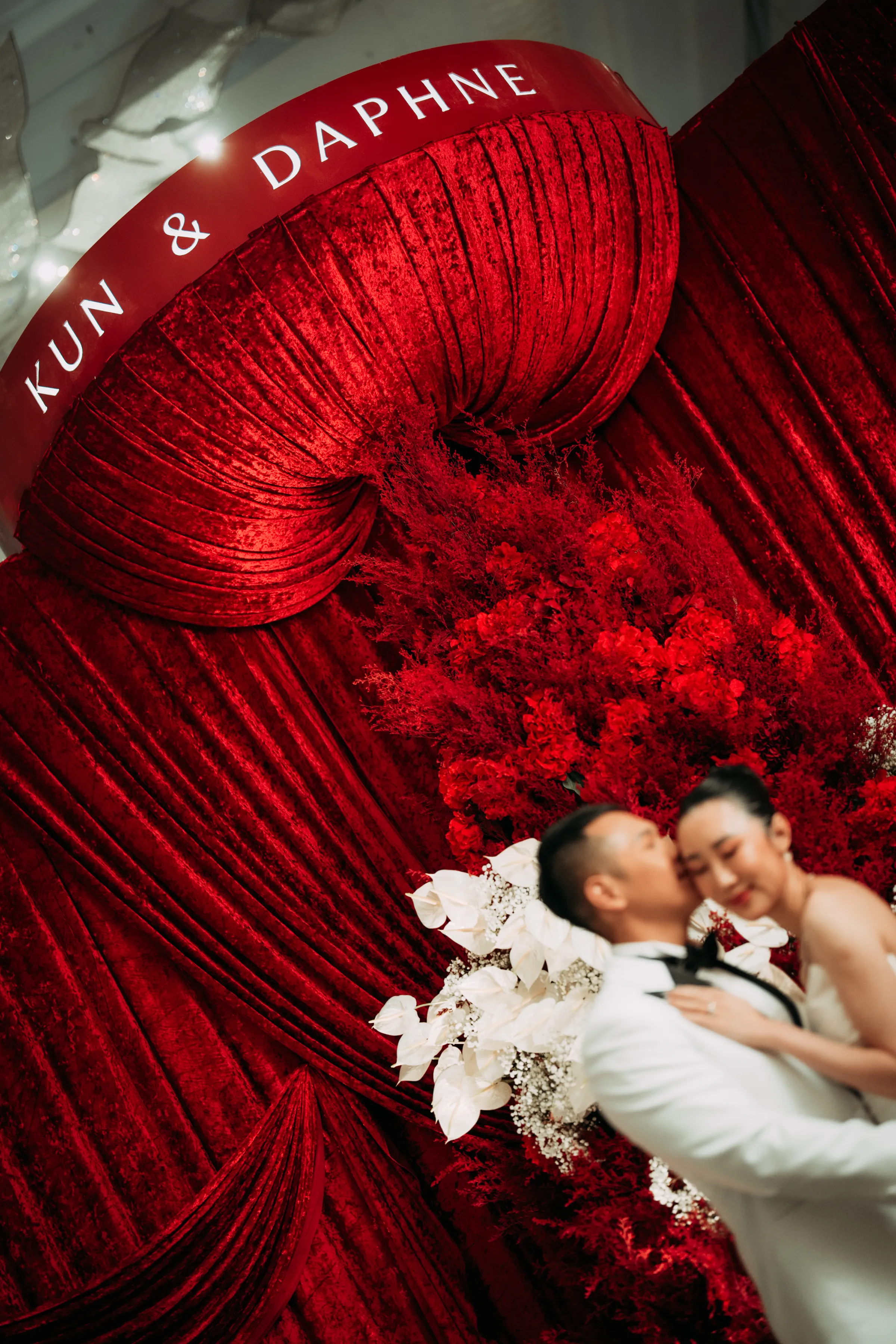 Kun and Daphne’s wedding design was a stunning homage to classical opera and orchestral grandeur, brought to life by Donce Fine Floristry. The primary color palette featured bold red, wine, and burgundy tones. A dramatic red velvet backdrop created a theatrical ambience, with cascading drapery and floral installations adding texture and depth. Tablescapes adorned with red roses, baby’s breath, and glowing candles perfectly encapsulated the couple’s vision of “simple but classy.”
