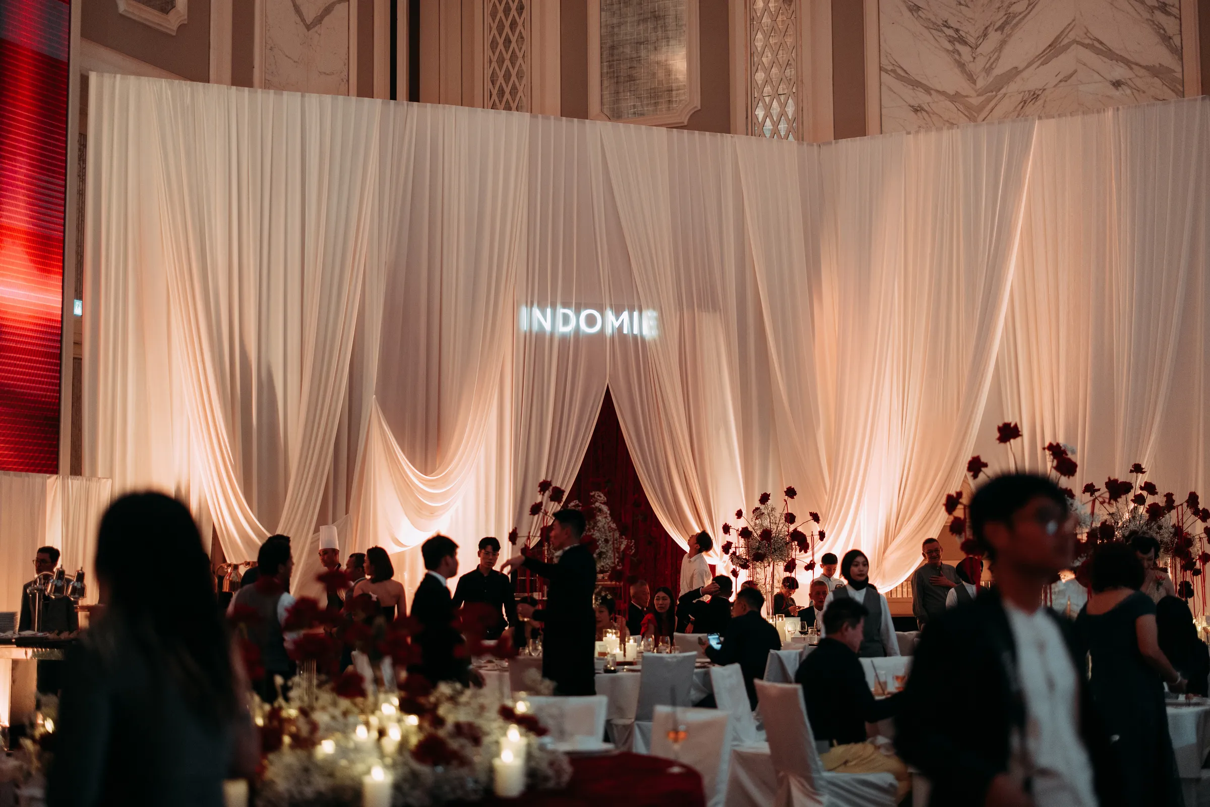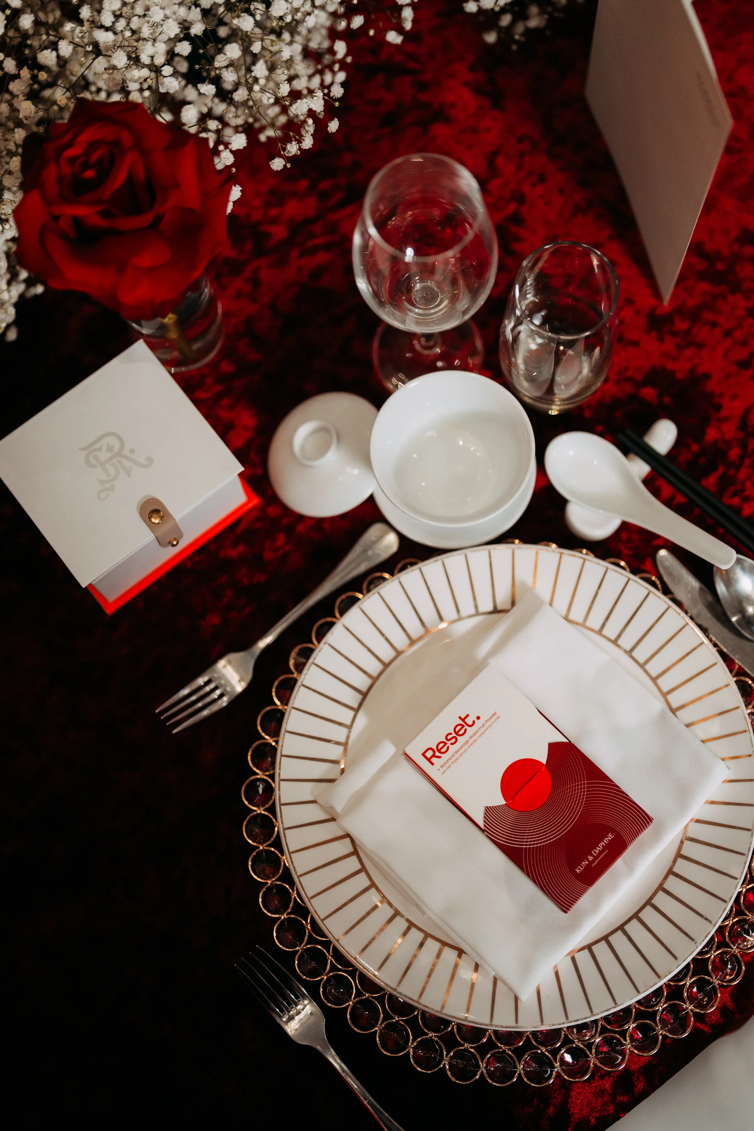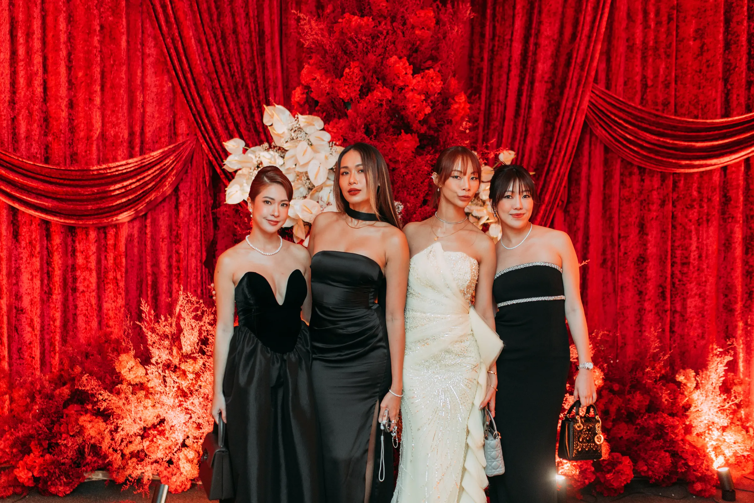 Kun and Daphne’s wedding design was a stunning homage to classical opera and orchestral grandeur, brought to life by Donce Fine Floristry. The primary color palette featured bold red, wine, and burgundy tones. A dramatic red velvet backdrop created a theatrical ambience, with cascading drapery and floral installations adding texture and depth. Tablescapes adorned with red roses, baby’s breath, and glowing candles perfectly encapsulated the couple’s vision of “simple but classy.”