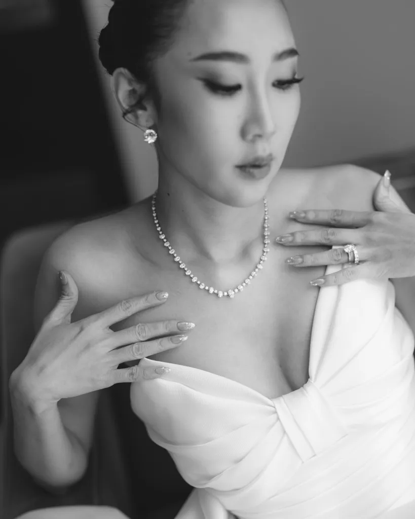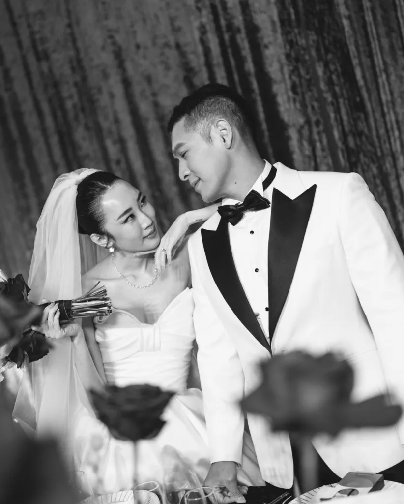The bride and groom’s looks reflected the couple’s shared love for simplicity with a refined edge. Daphne wore a structured white gown with a dramatic train, radiating timeless elegance with her choice of accessories and makeup. Kun, on the other hand, donned a custom white tuxedo with black lapels, complete with their joint name embroidered—an element that added a deeply personal and unique touch.