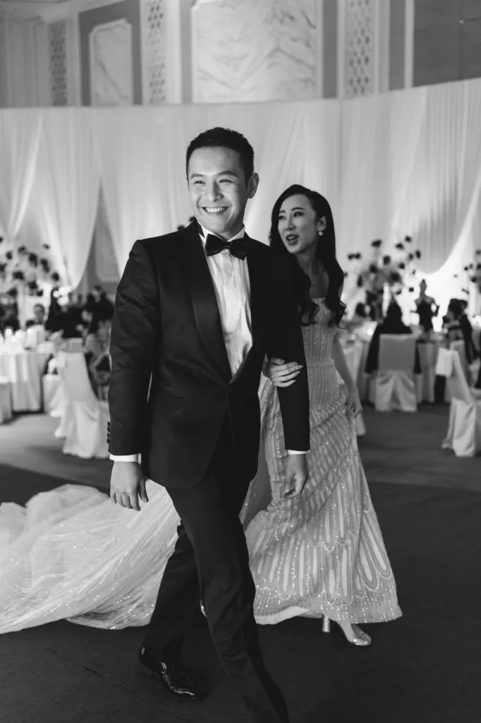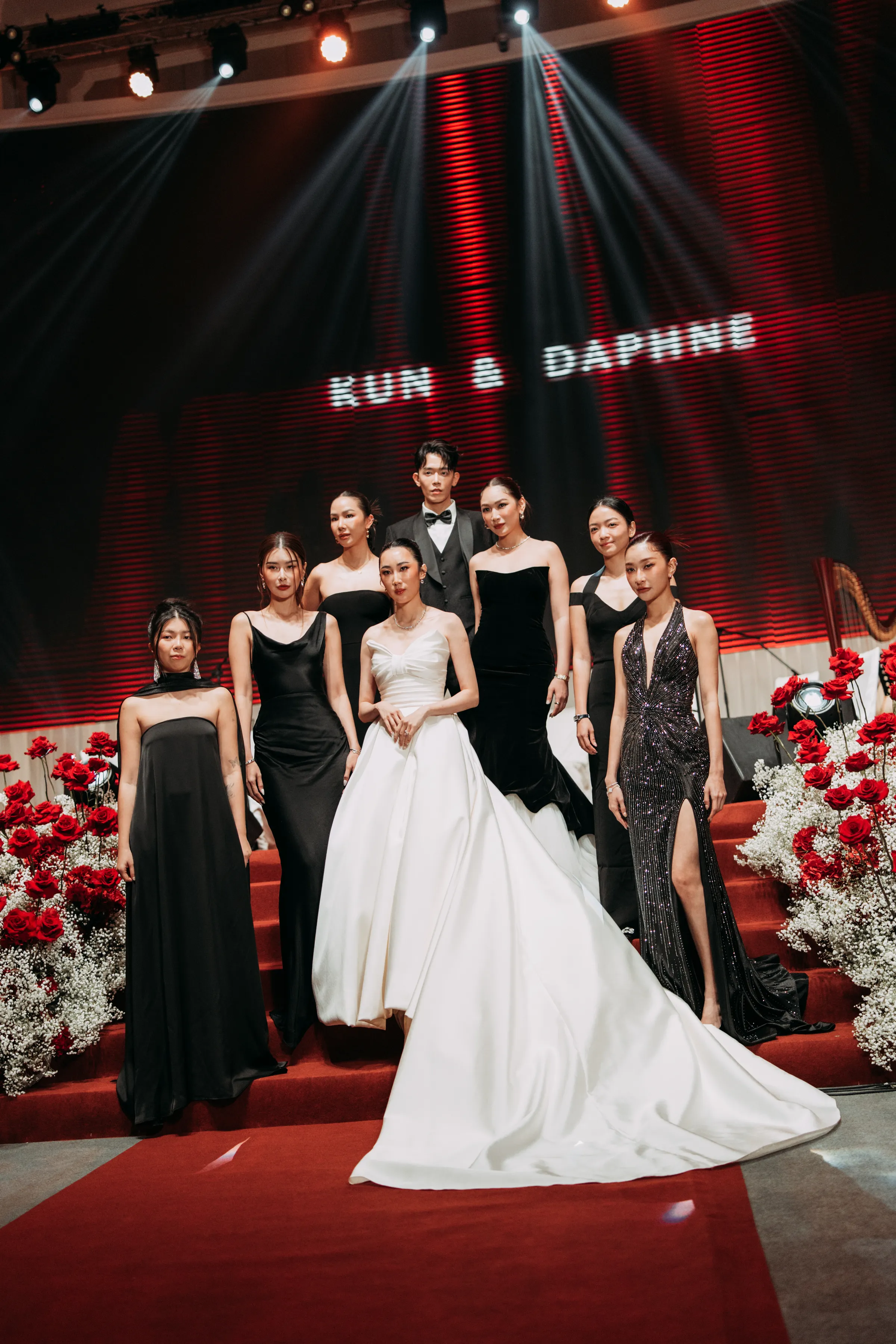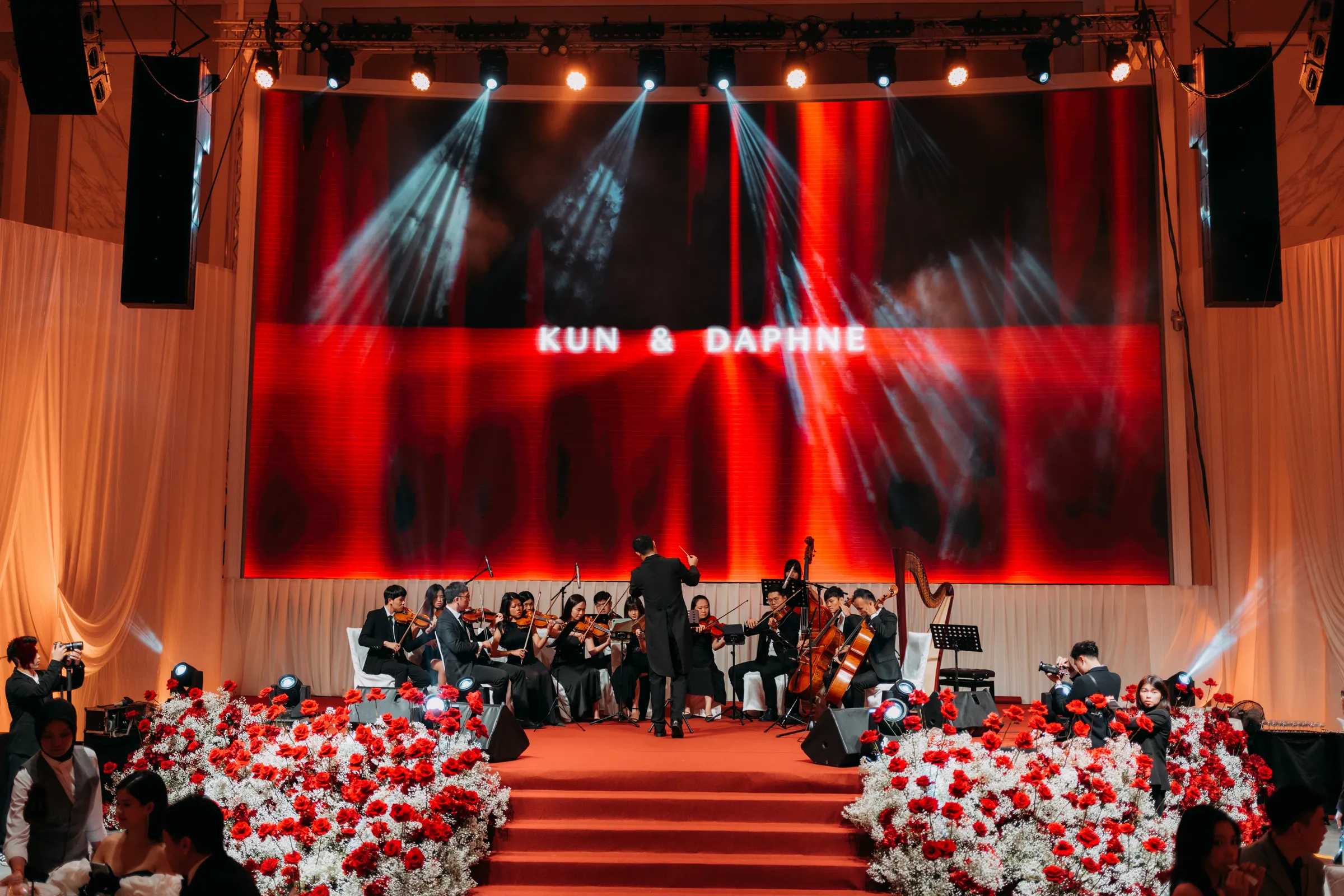 The evening’s sophistication was elevated by a 15-piece orchestra, performing a curated selection of songs that ranged from classical pieces to modern English and Mandarin melodies. Daphne’s passion for music infused every detail of the evening, with standout moments such as the orchestra’s performance of “Turning Page” during the couple’s first march-in—a cinematic touch inspired by her love for the Twilight series.