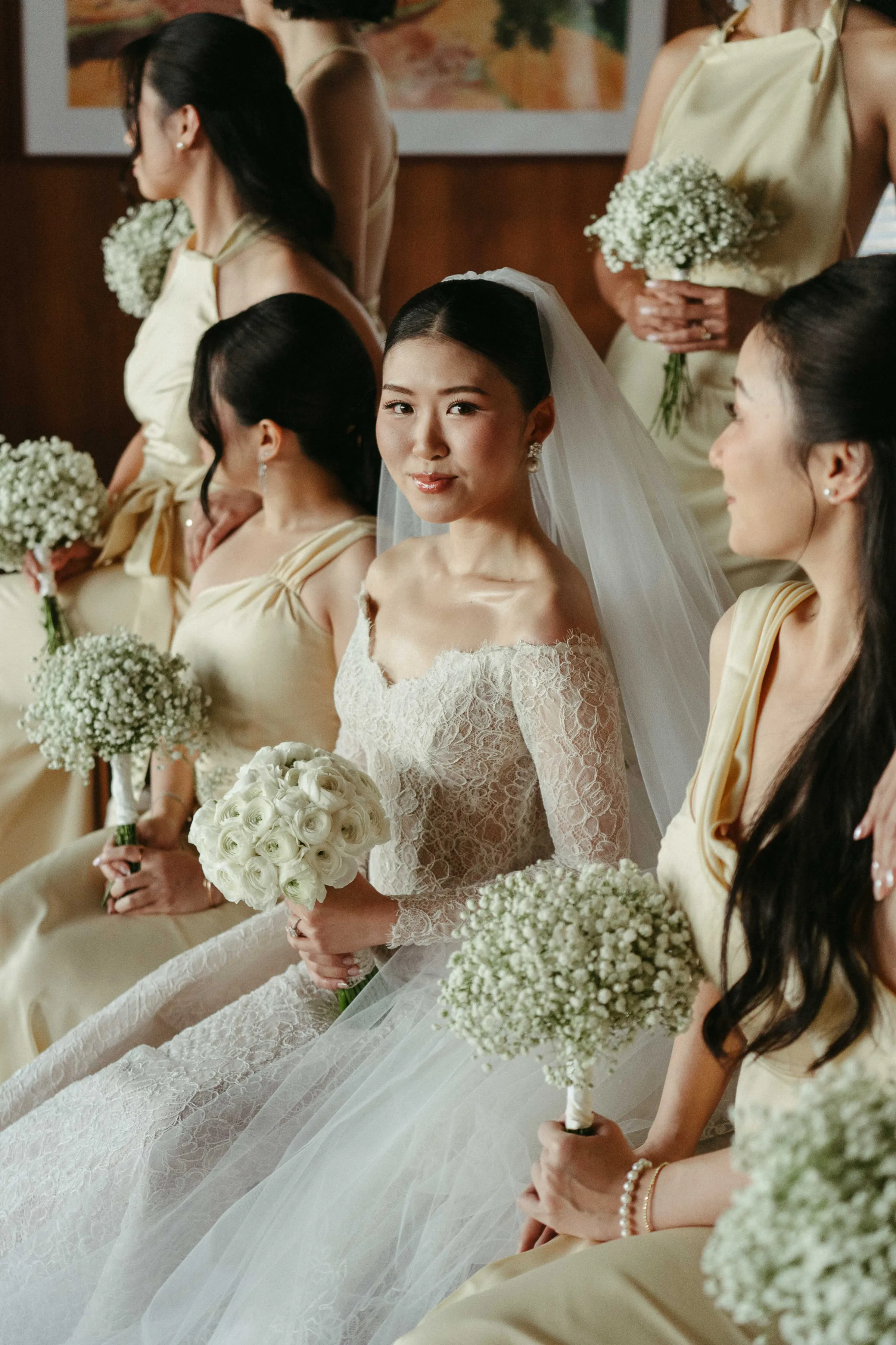 The bride embodied understated refinement in a delicate lace gown featuring an off-the-shoulder neckline and long sheer sleeves. The intricate floral lacework added depth and texture, while her classic veil softened the overall silhouette. Bridesmaids were dressed in soft butter-yellow gowns in varying silhouettes, each holding airy bouquets of baby’s breath. The palette felt fresh and sunlit, echoing the Tuscan spring inspiration while adding warmth to the overall visual story.