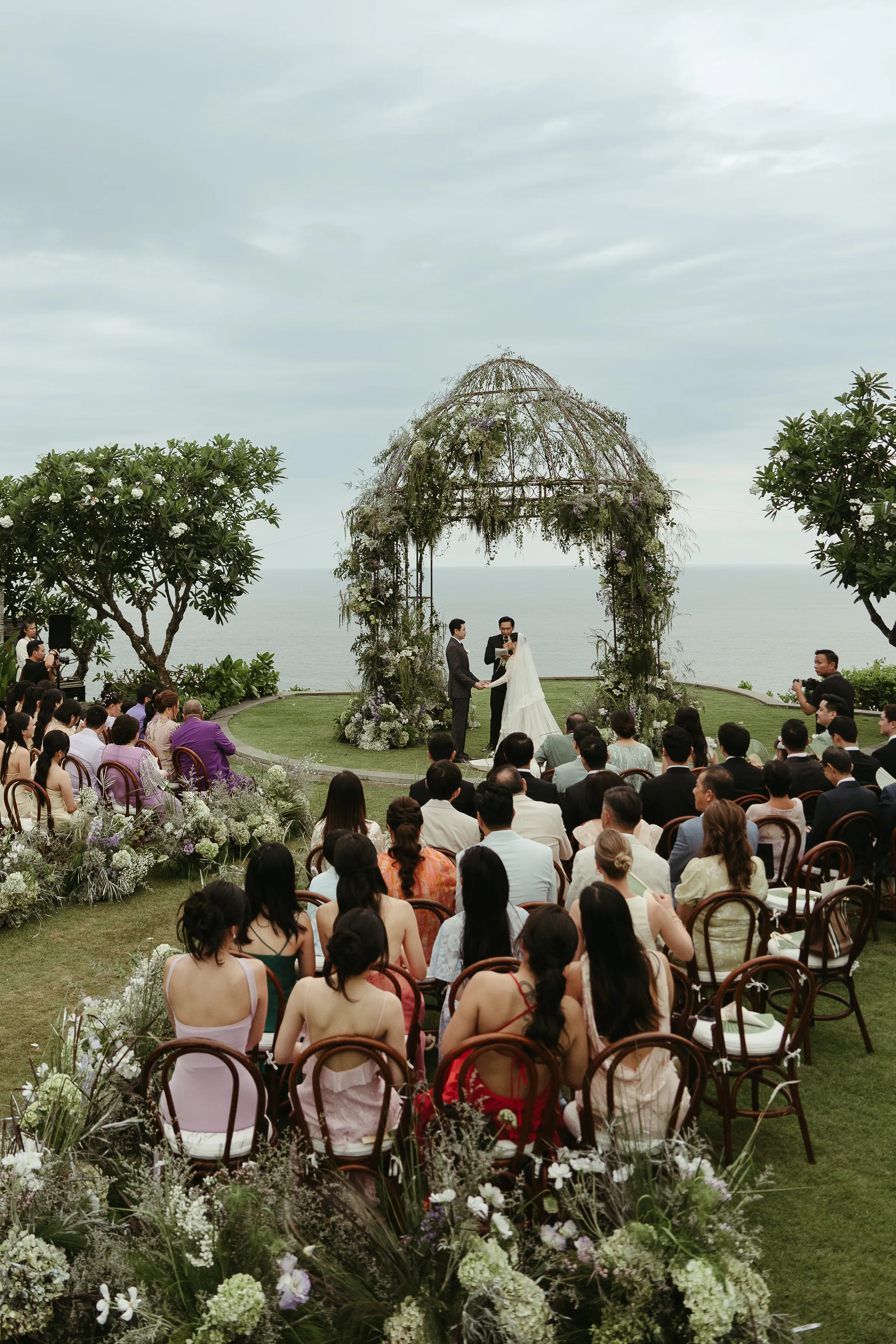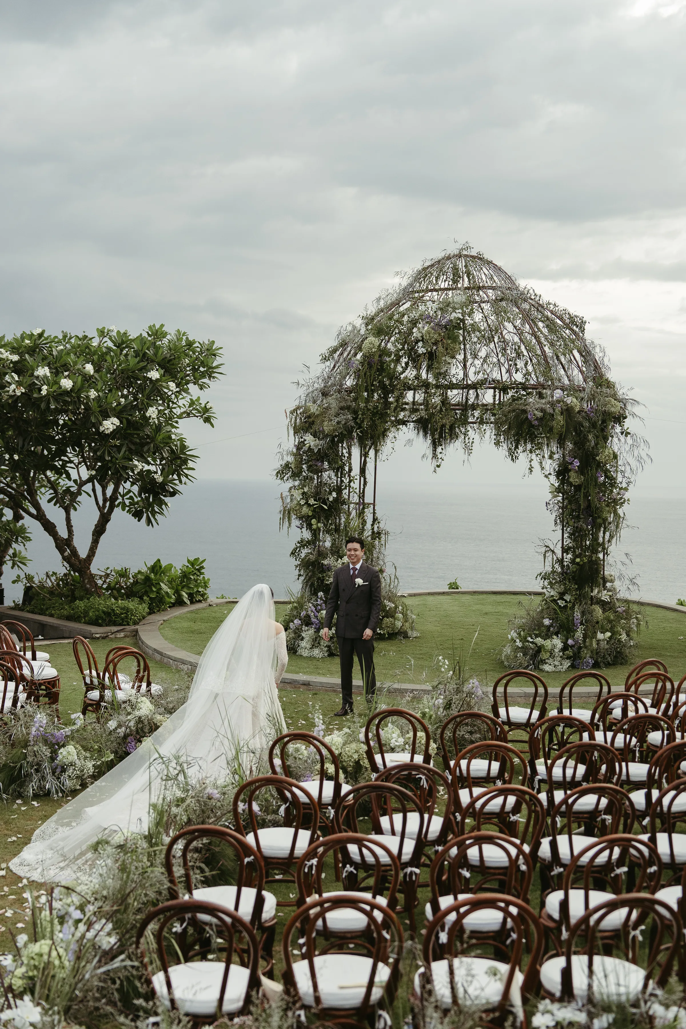 The ceremony took place on the iconic Andakara Lawn, where the Indian Ocean stretched endlessly beyond the cliff’s edge. A wrought, dome-like arbor served as the focal point, overgrown with cascading greenery and delicate florals in soft whites and hints of lilac. The arrangement felt intentionally undone—lush yet unstructured—capturing the essence of a garden in bloom. Curved seating framed the aisle, creating a sense of intimacy and closeness among guests. Wooden bentwood chairs added a natural, European touch, subtly referencing Tuscan countryside gatherings.