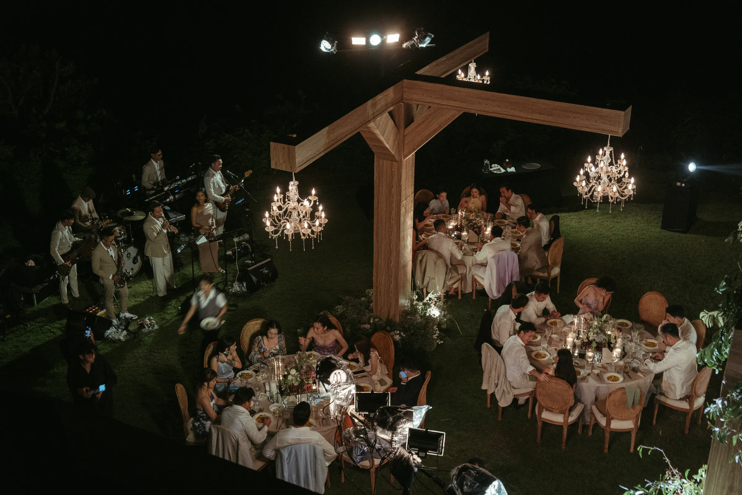 When rain began to fall, what could have been a disruption instead became part of the story. Guests gathered closer, laughter replaced any tension, and the atmosphere became even more intimate. Just as dinner approached, the rain paused—almost as if on cue.
