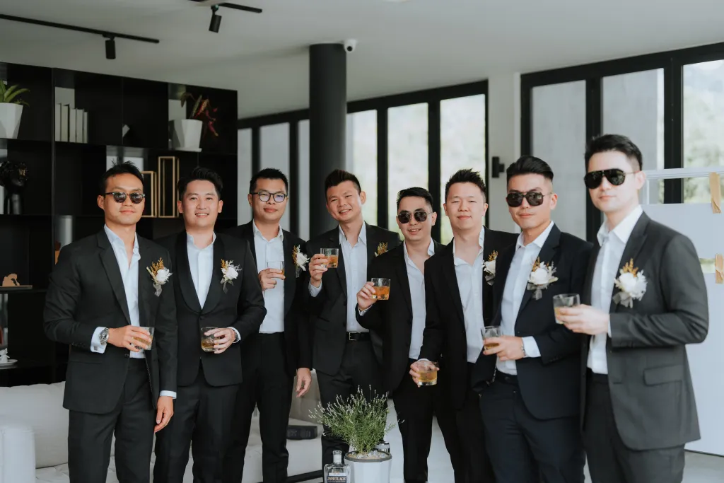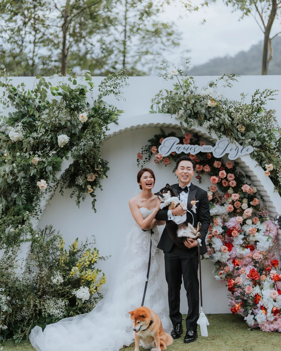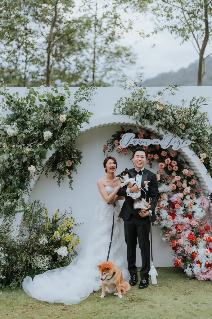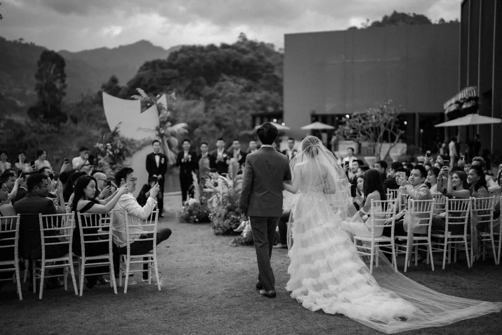 The wedding décor theme at The Acres Resort focused on celebrating nature’s beauty. They opted for a simple, elegant setup that wouldn’t overshadow the breathtaking natural surroundings. Personal touches infused their special day. Joyce designed the wedding invitations herself, putting her unique touch on every detail. Her dress featured custom-made beadwork, reflecting her style and personality, while James wore an independent watch from his best friend’s company, symbolising their shared journey as business partners.