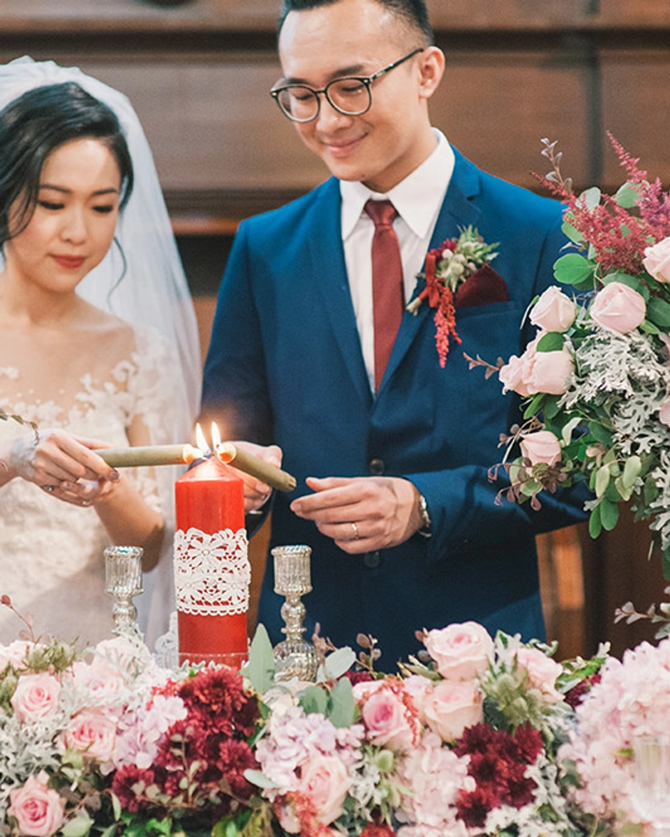 Jo Ni and Tsen: “The concept behind our wedding was practicality with a personal touch. The colour theme was the pantone colour of the year – a mixture of marsala, blush and sage, with a tinge of gold, grey and blue. The flower decorations, bridesmaids’ dresses, groomsmen’s ties and invitation cards all revolved around this colour theme. The things that we were more particular about were the flowers (dark red peony, red cymbydium, light pink roses, green eryngium, dusty miller leaves, brunia, red amaranthus, blue thistle and eucalyptus leaves), personalised wedding gifts, wedding cards/programme sheets, and scent because scent is closely linked to memory (we used Diptique Baies candles and room spray).
