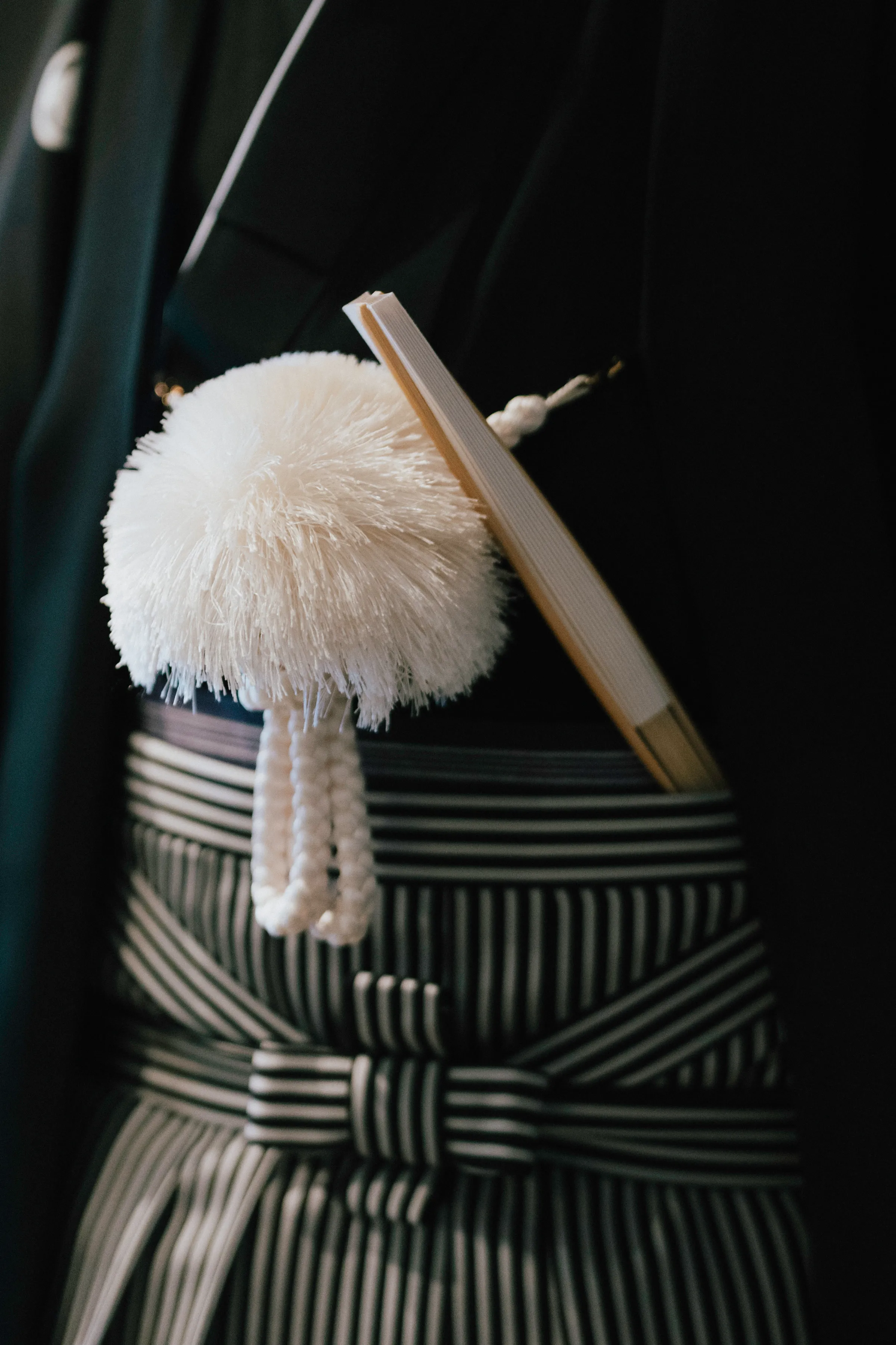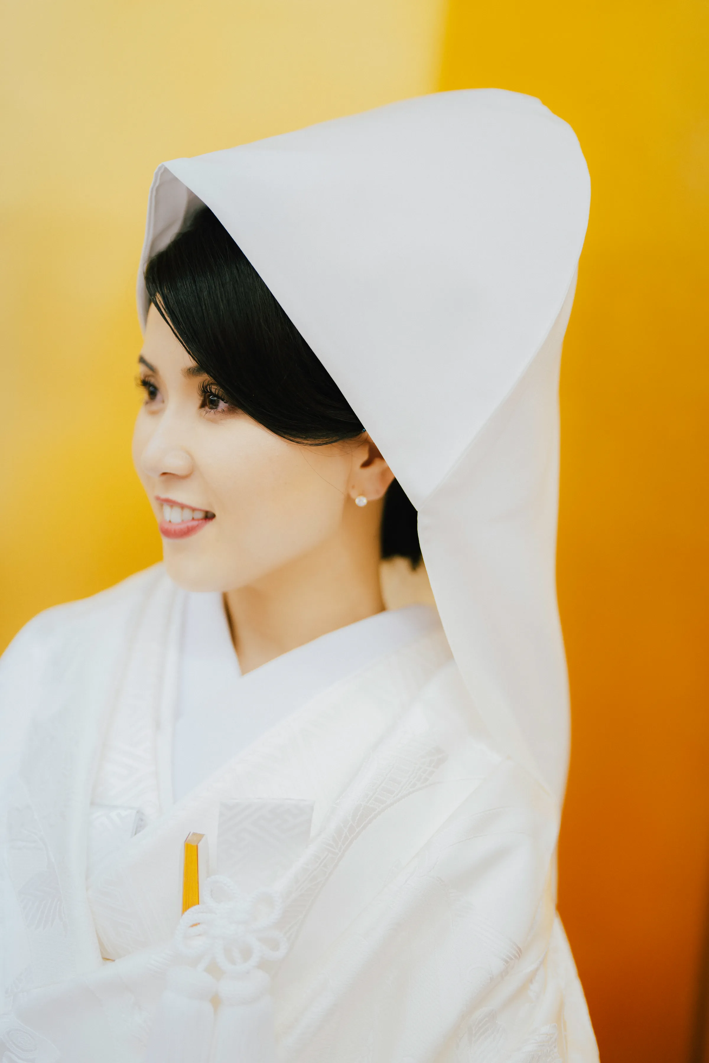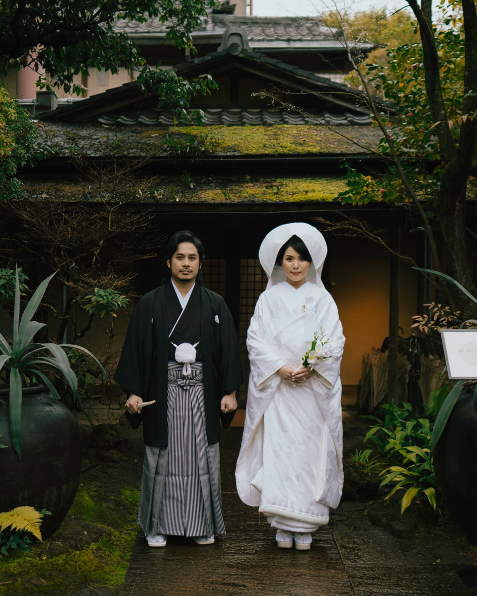 Nana and Afif embraced Japanese tradition with their wedding attire during the Shinto ceremony. Nana looked breathtaking in a pure white wedding kimono, symbolizing purity and new beginnings. Her outfit featured intricate patterns and a traditional white hood, known as the “tsunokakushi,” designed to represent humility. Afif matched the elegance of the occasion in a classic black-and-white montsuki paired with striped hakama pants, completing his refined look as the groom.