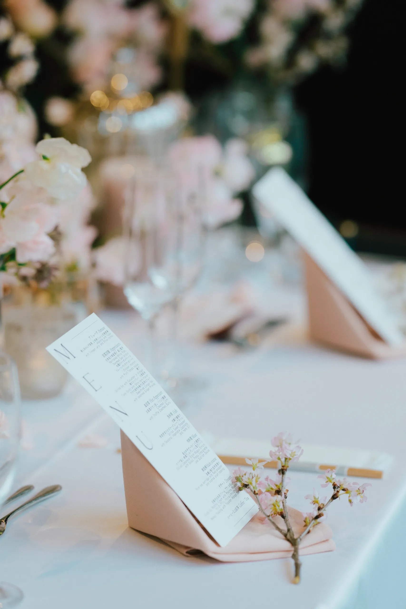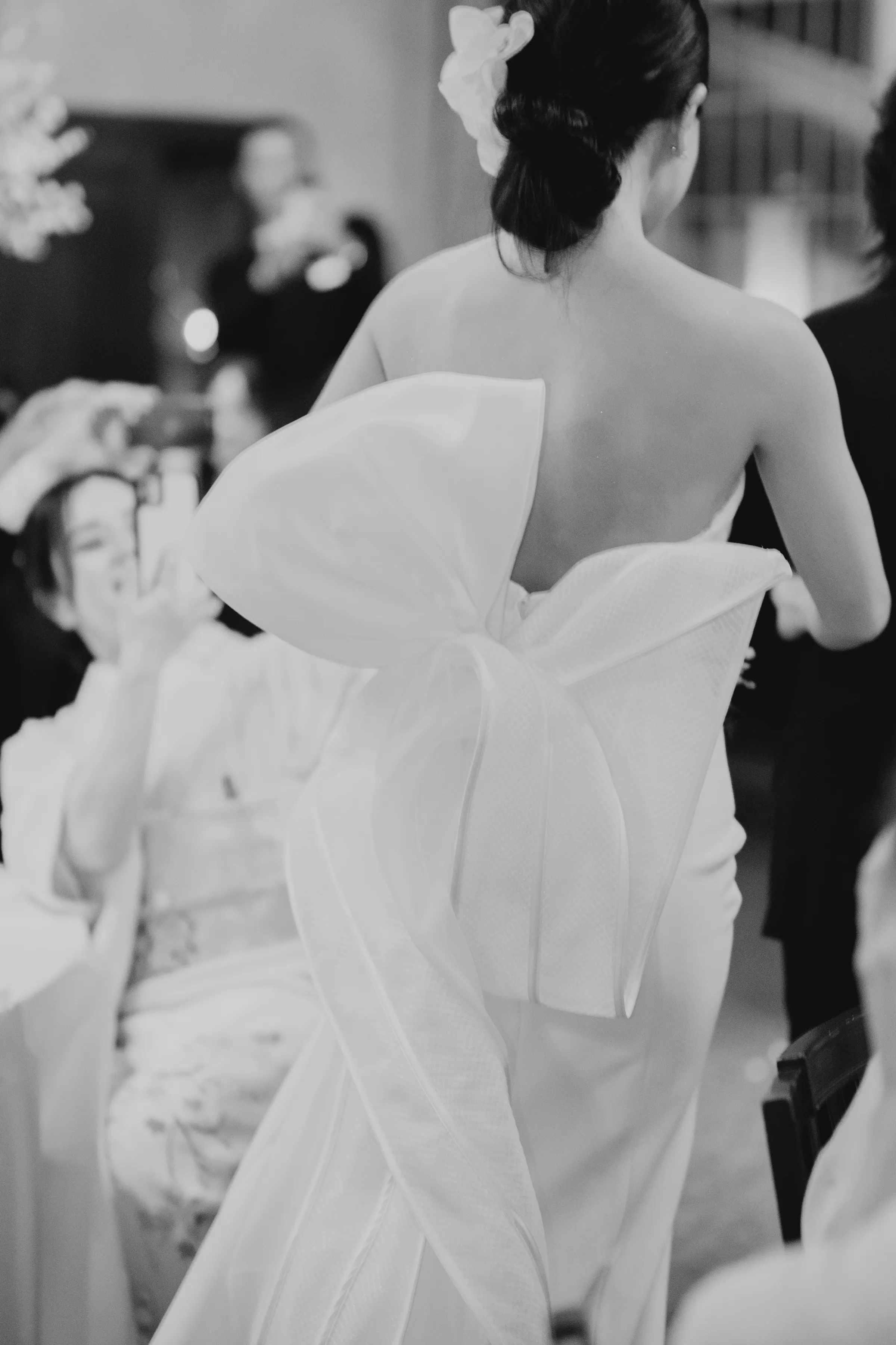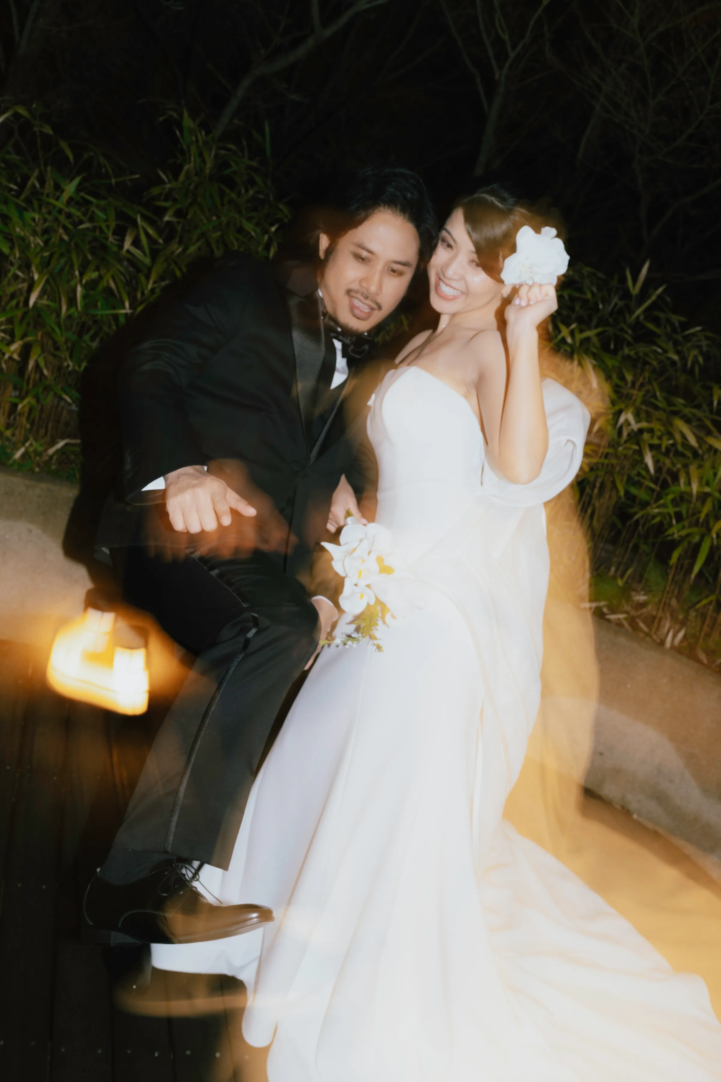 Later in the evening, the couple transitioned into more contemporary styles for their reception at Sodoh Higashiyama. The venue’s traditional architecture, characterized by rich wooden tones, harmonised beautifully with the sakura-themed decor and thoughtfully curated menu, creating a seamless fusion of heritage and modern elegance The space perfectly complemented their sakura-inspired table scapes. Nana’s second look was a minimalist white wedding gown with a structured silhouette, accessorised with a delicate white flowers in her hair. Afif donned a sleek black tuxedo, exuding timeless sophistication.