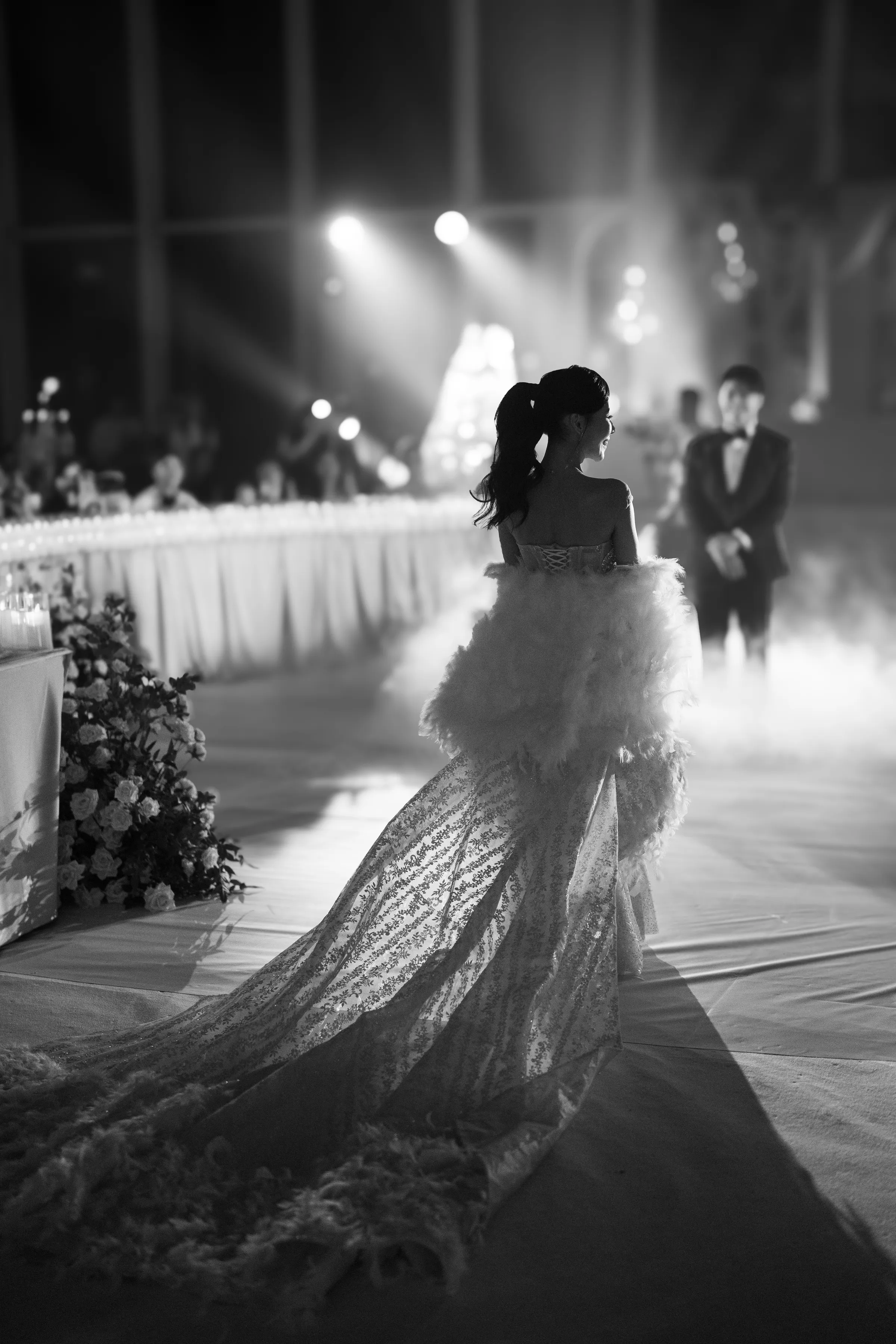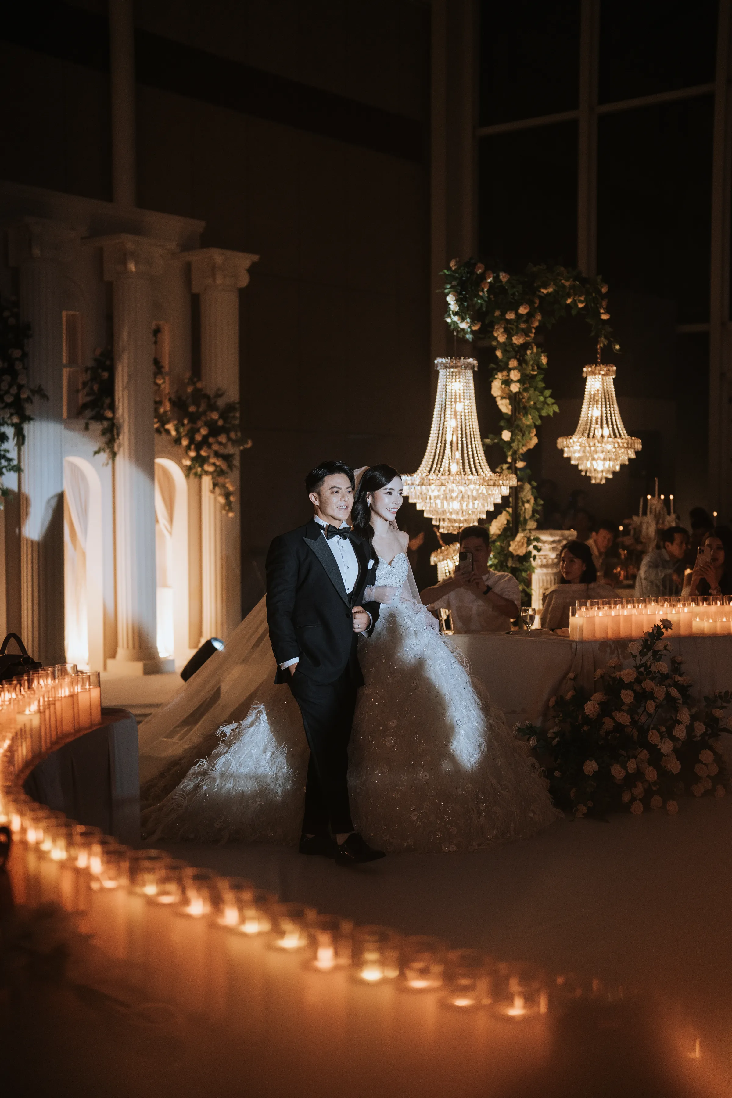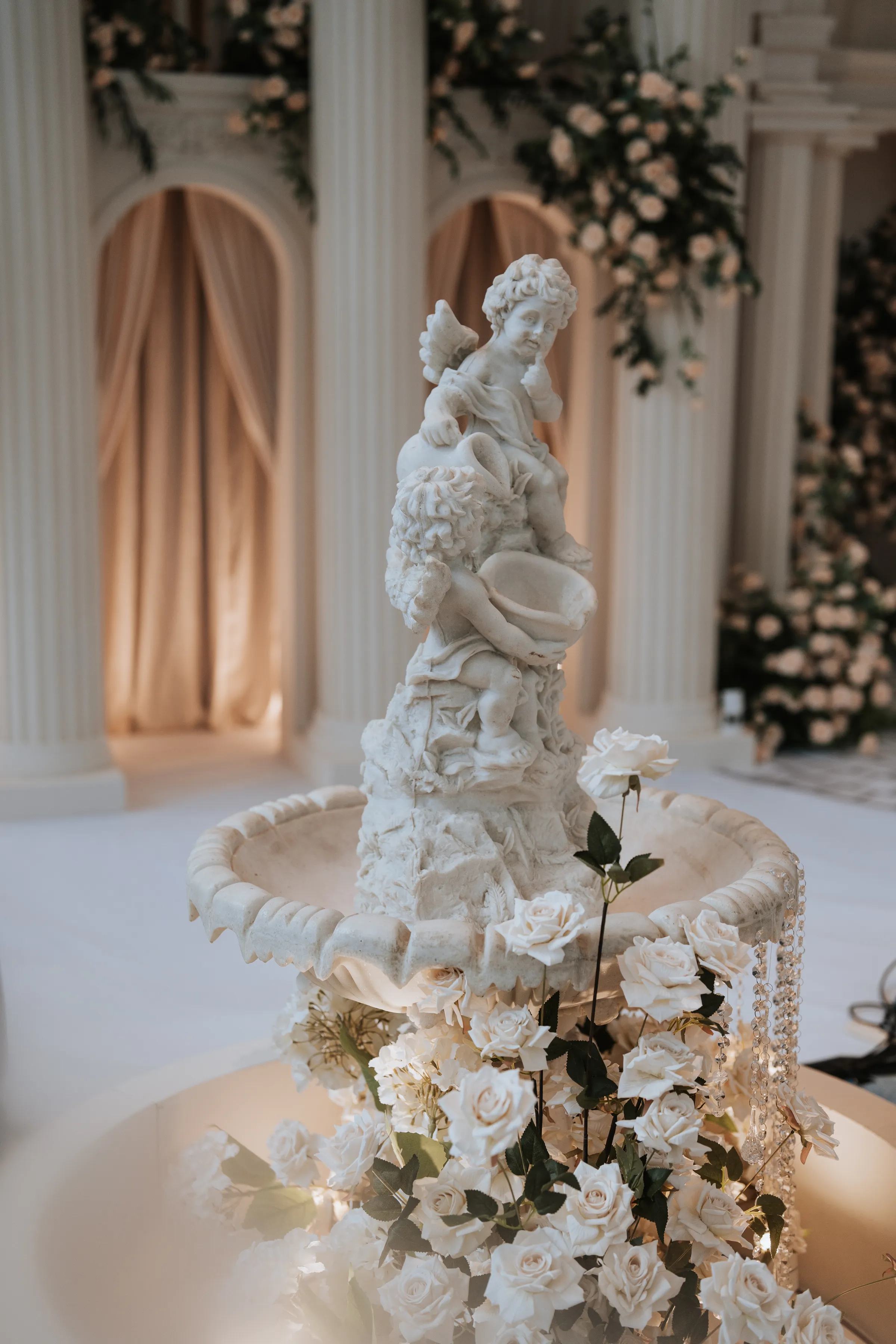 For the reception, Sentul Pavilion was transformed into a scene reminiscent of ancient Rome, complete with towering columns, intricate floral arrangements, and luxurious chandeliers. A soft, neutral color palette of blush, ivory, and gold created an ambiance of understated sophistication. Ornate statues and fountains adorned the space, adding to the grandeur while maintaining a delicate, romantic vibe.