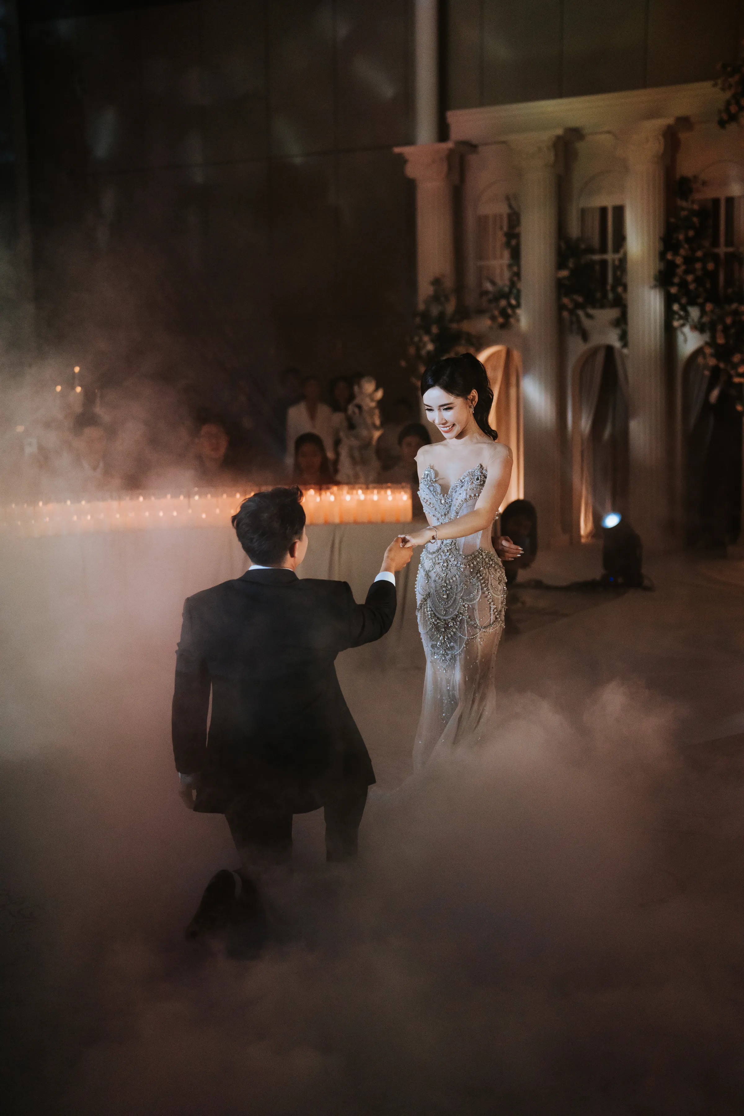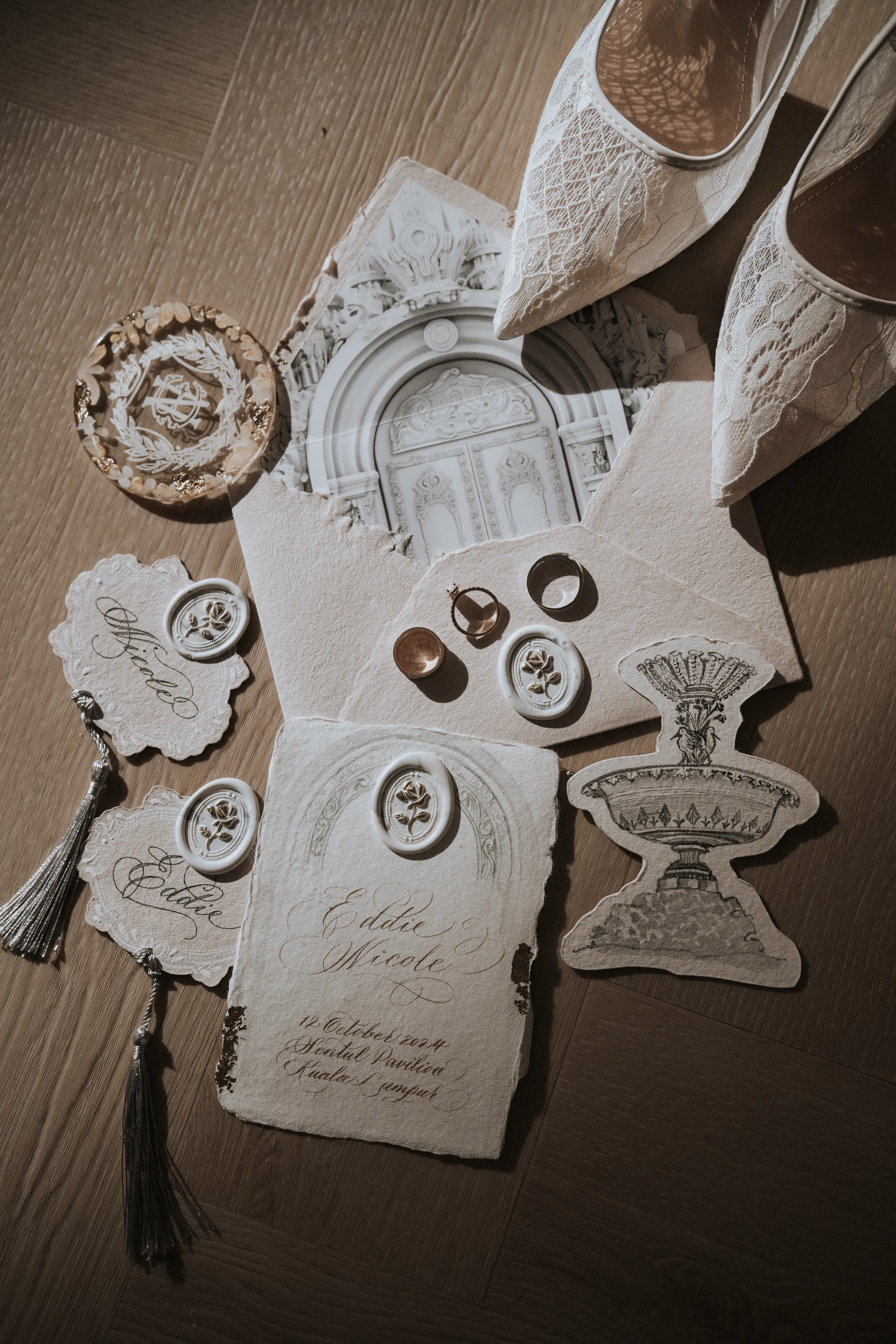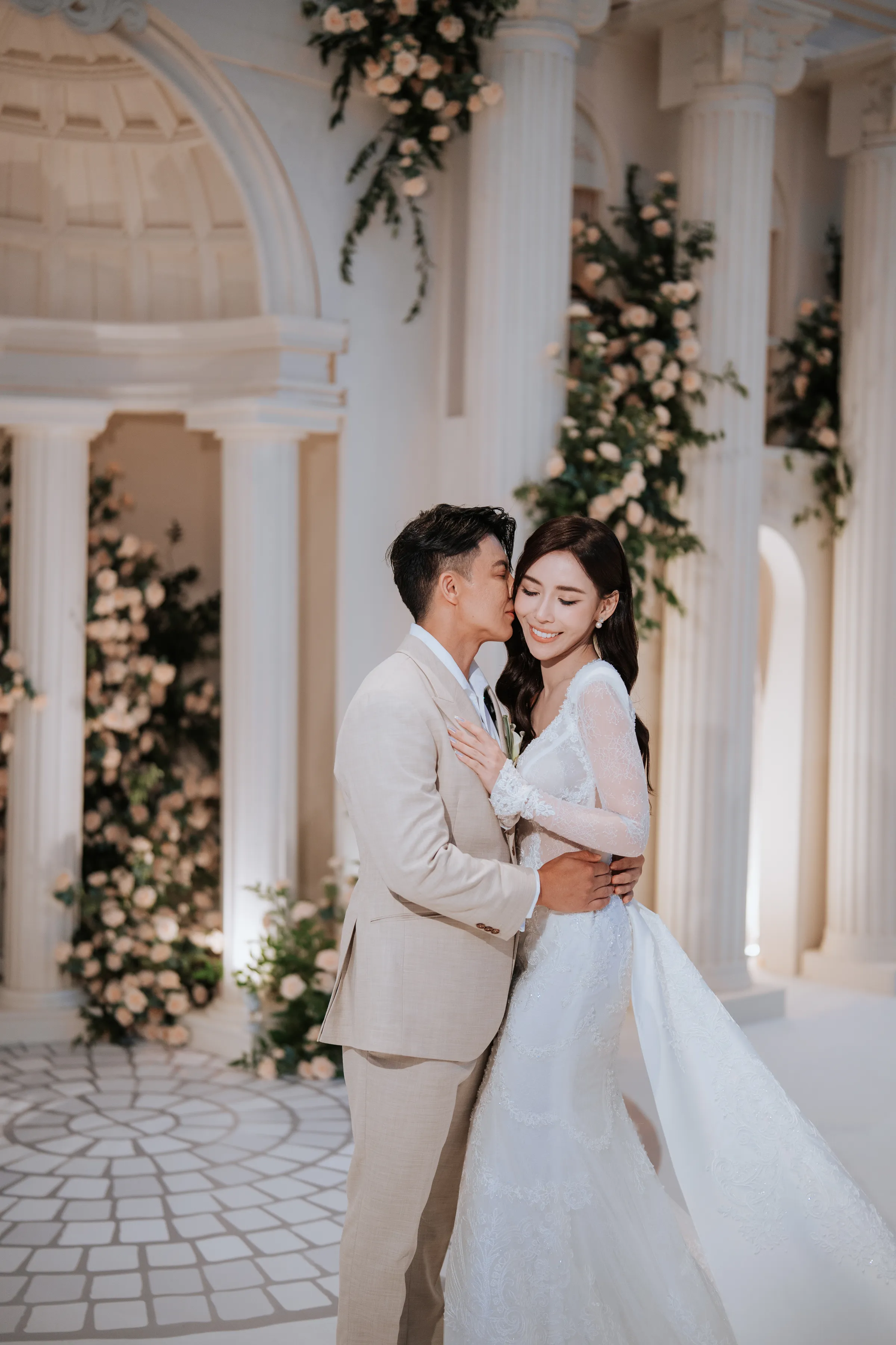 For the reception, Sentul Pavilion was transformed into a scene reminiscent of ancient Rome, complete with towering columns, intricate floral arrangements, and luxurious chandeliers. A soft, neutral color palette of blush, ivory, and gold created an ambiance of understated sophistication. Ornate statues and fountains adorned the space, adding to the grandeur while maintaining a delicate, romantic vibe.